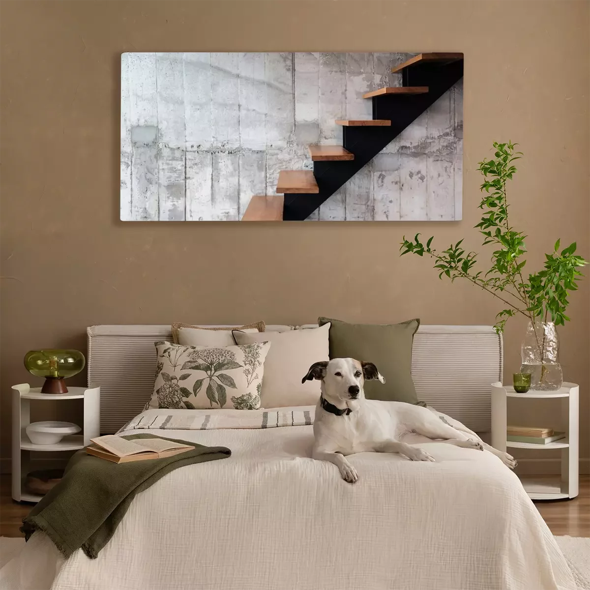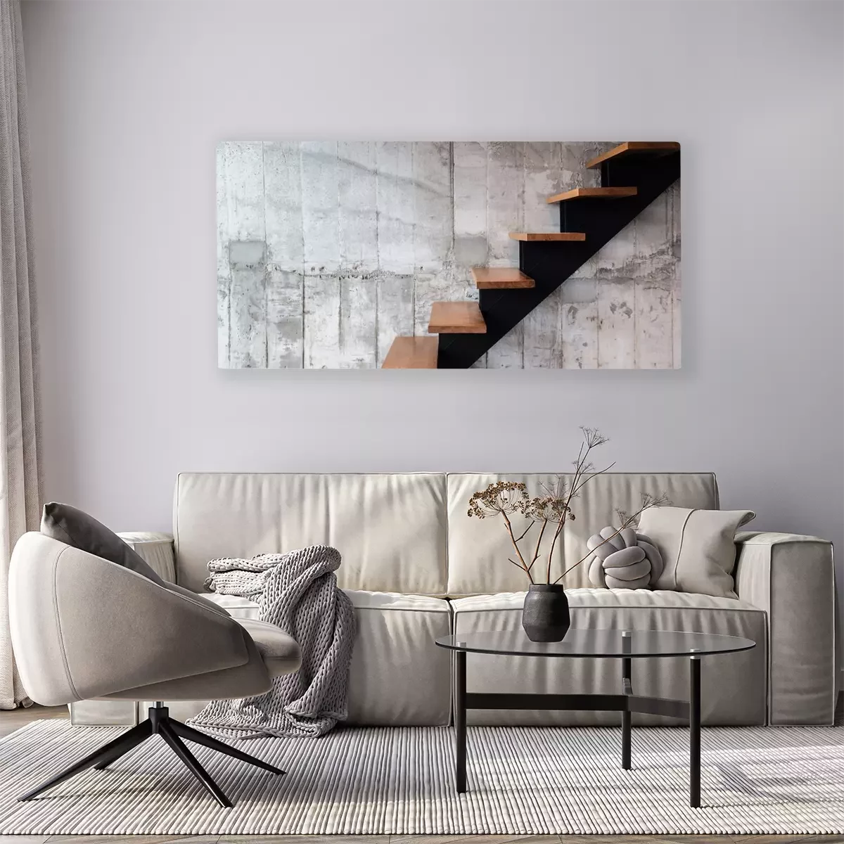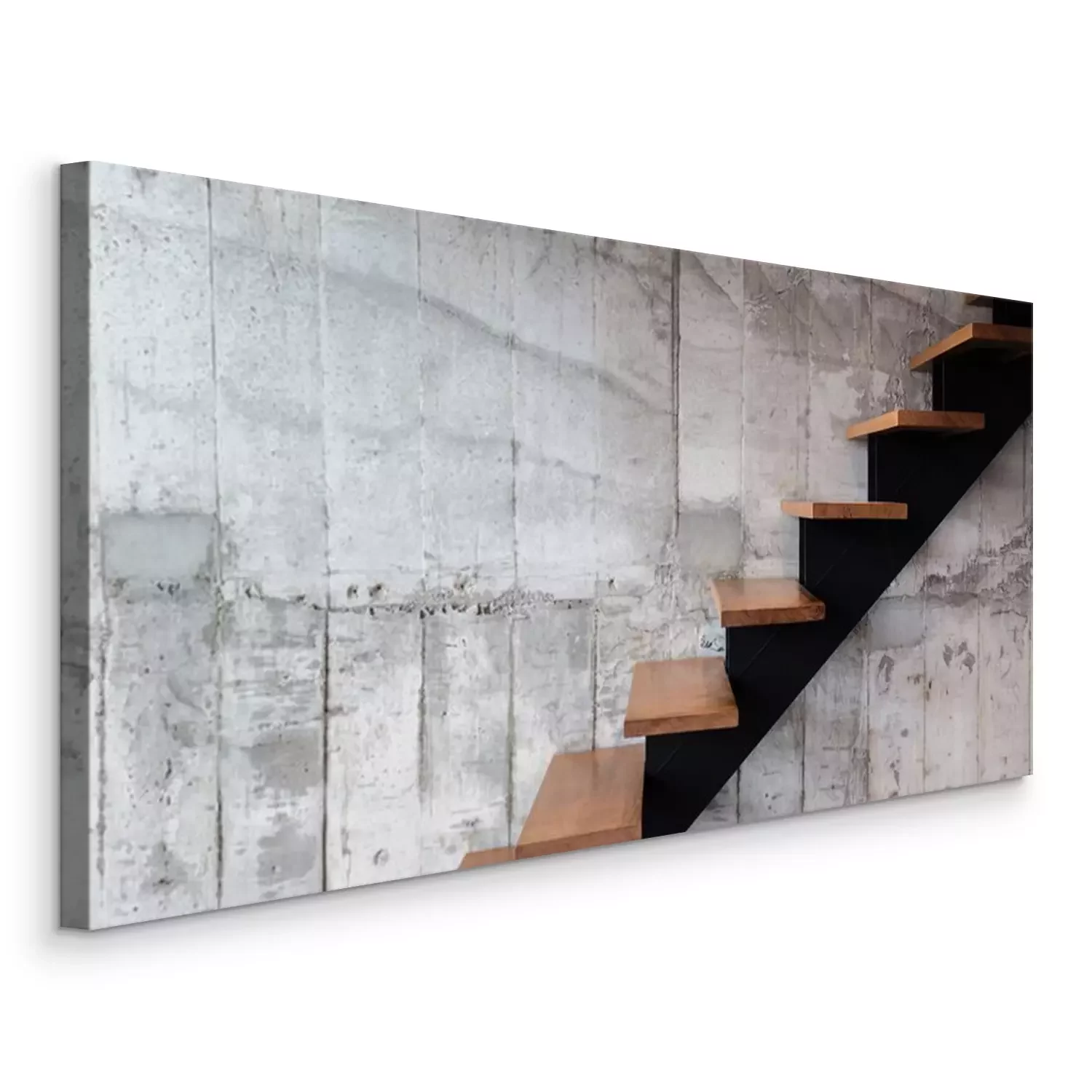 Tableau  Escalier de structure moderne avec étape en bois et fond de texture béton avec fond gratuit pour votre texte