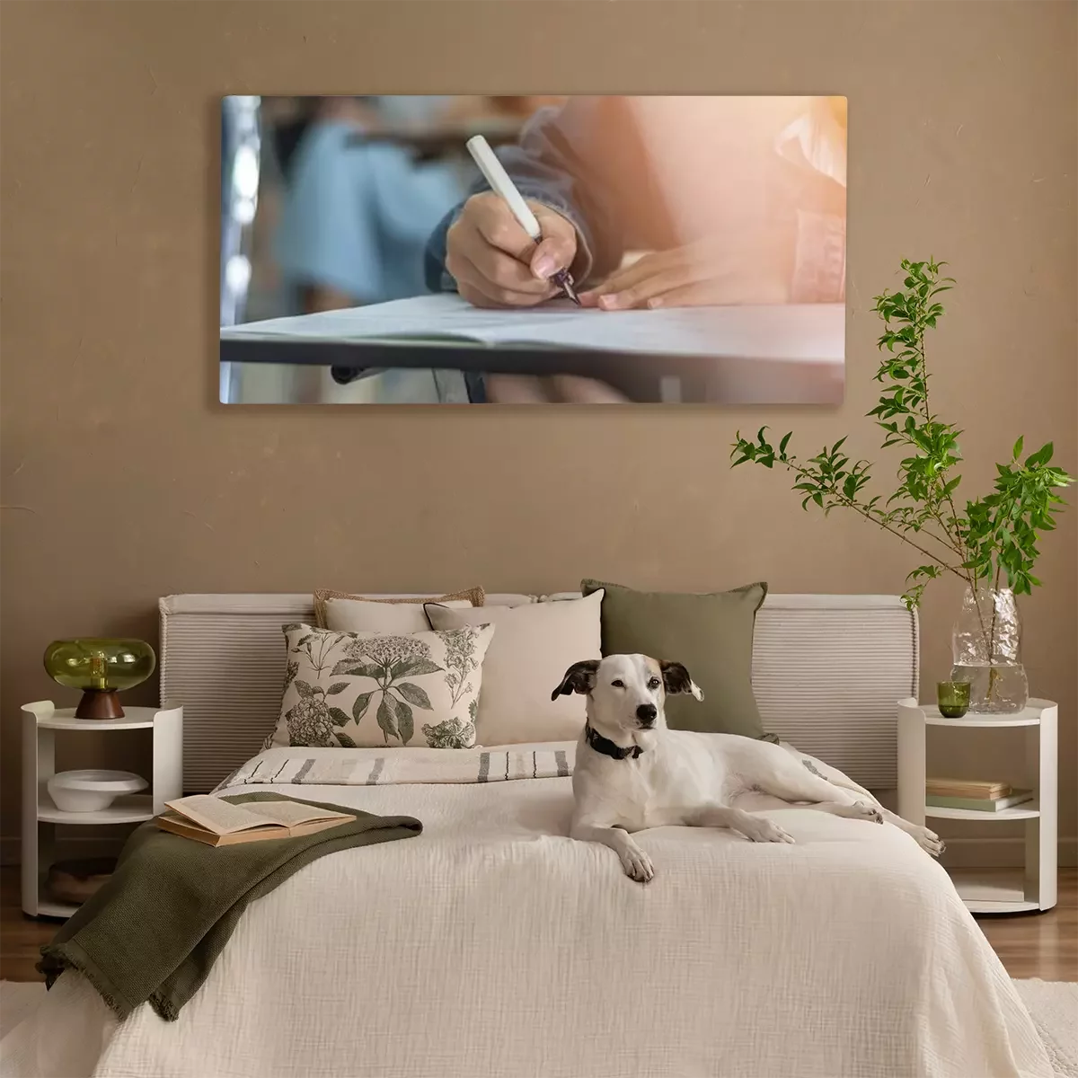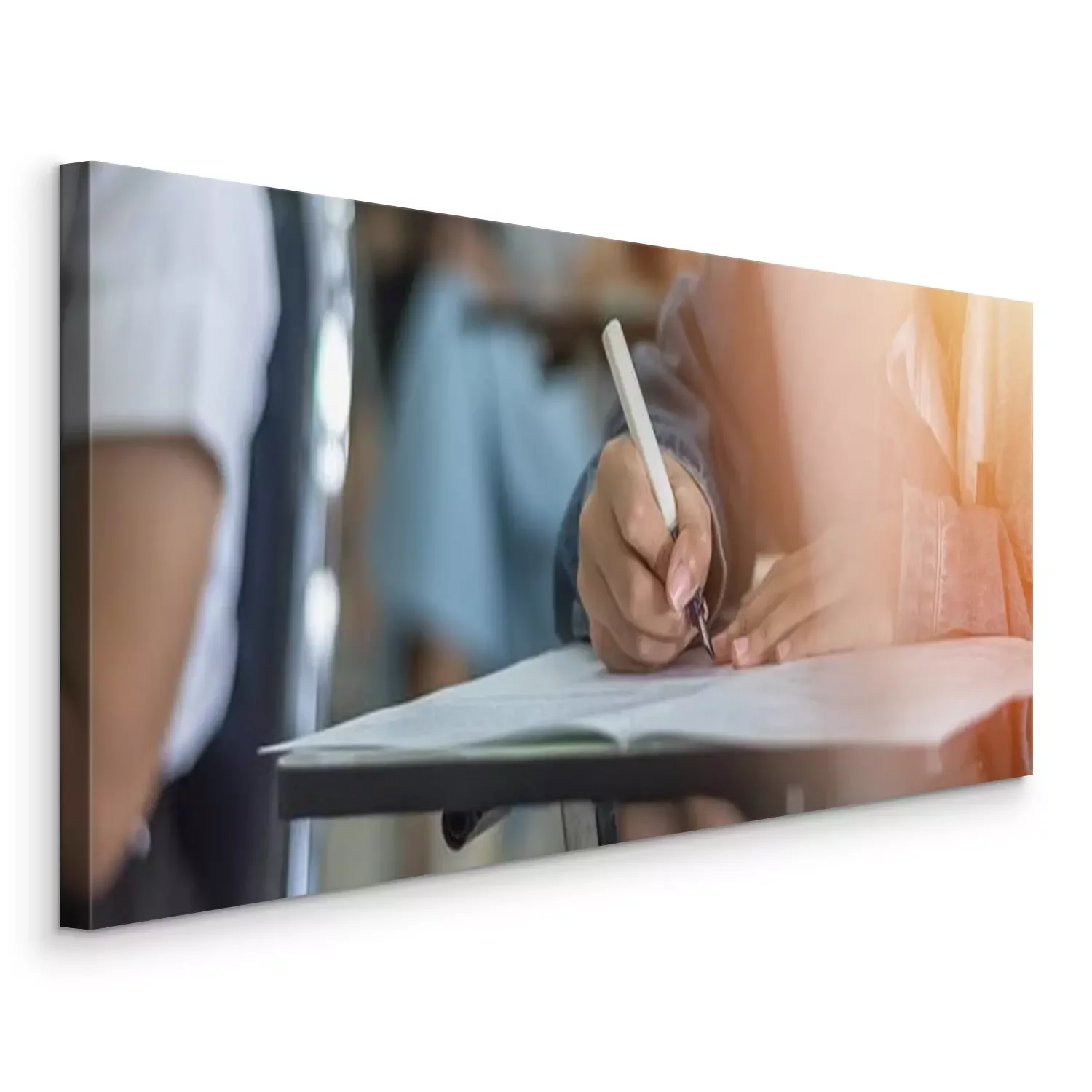 Tableau : Exam at school with student's taking educational admission test in class, thinking hard, writing answer in university classroom, education and world literacy day concept