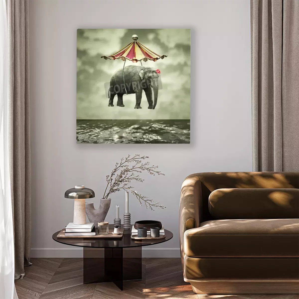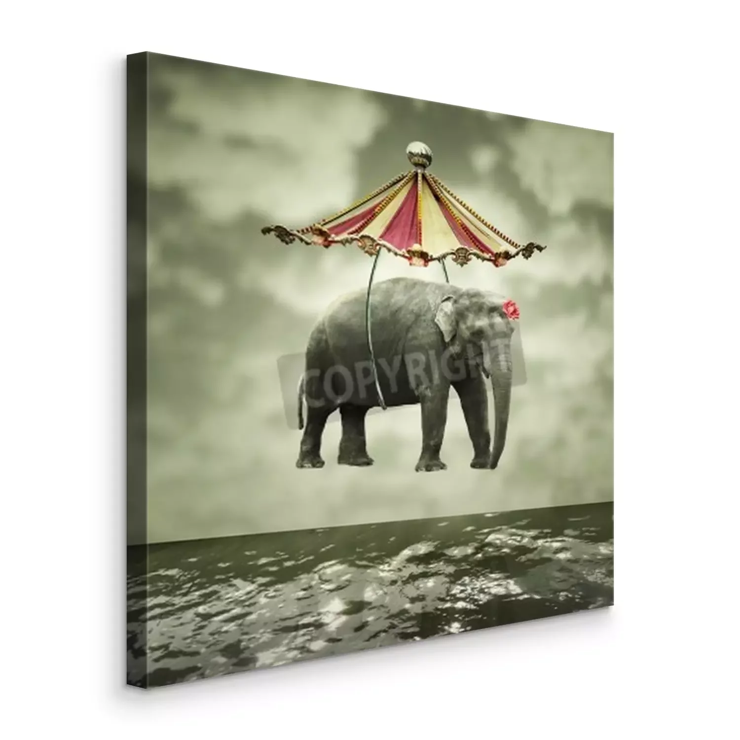 Tableau  Fanciful and artistic image that represent a flying elephant with circus tent above the water