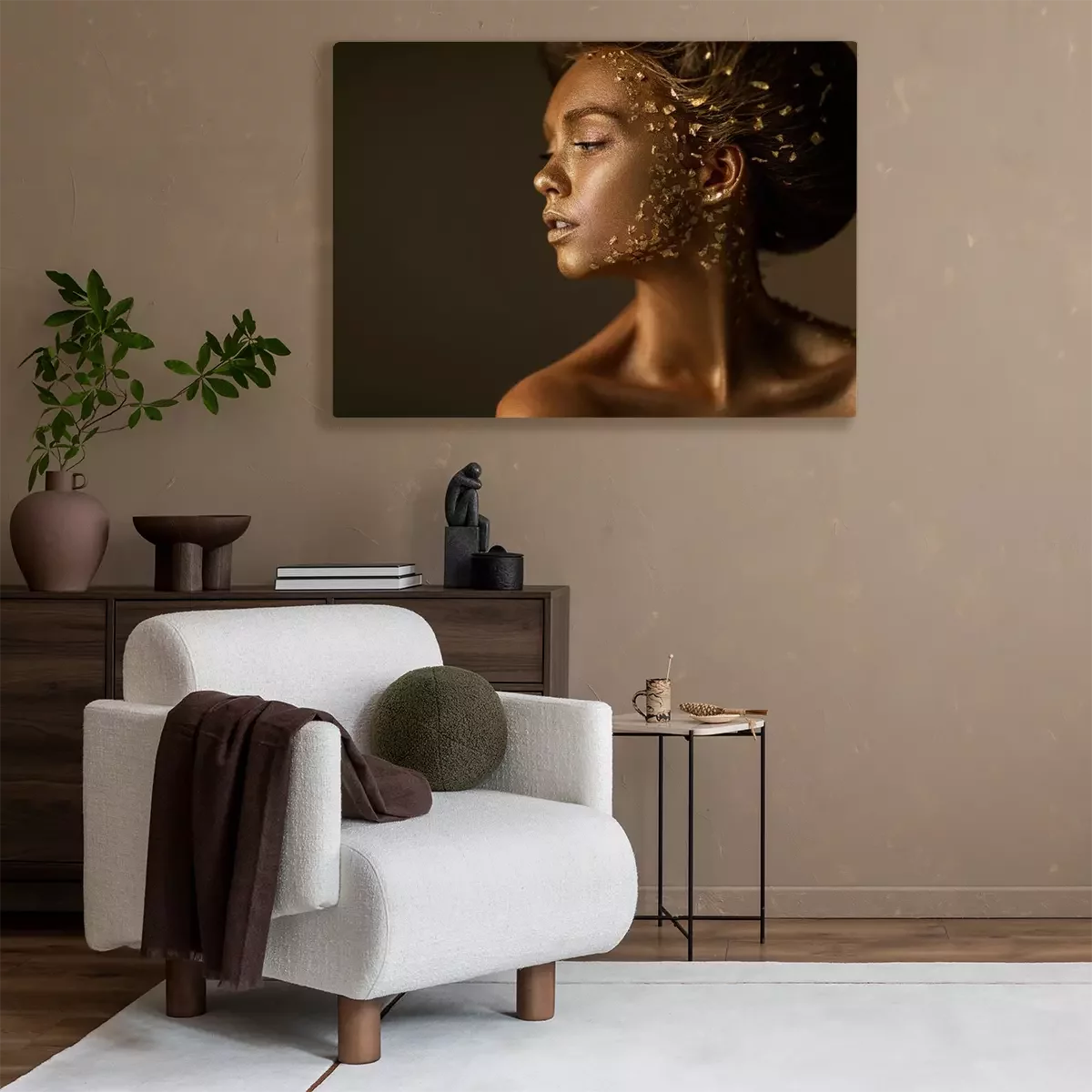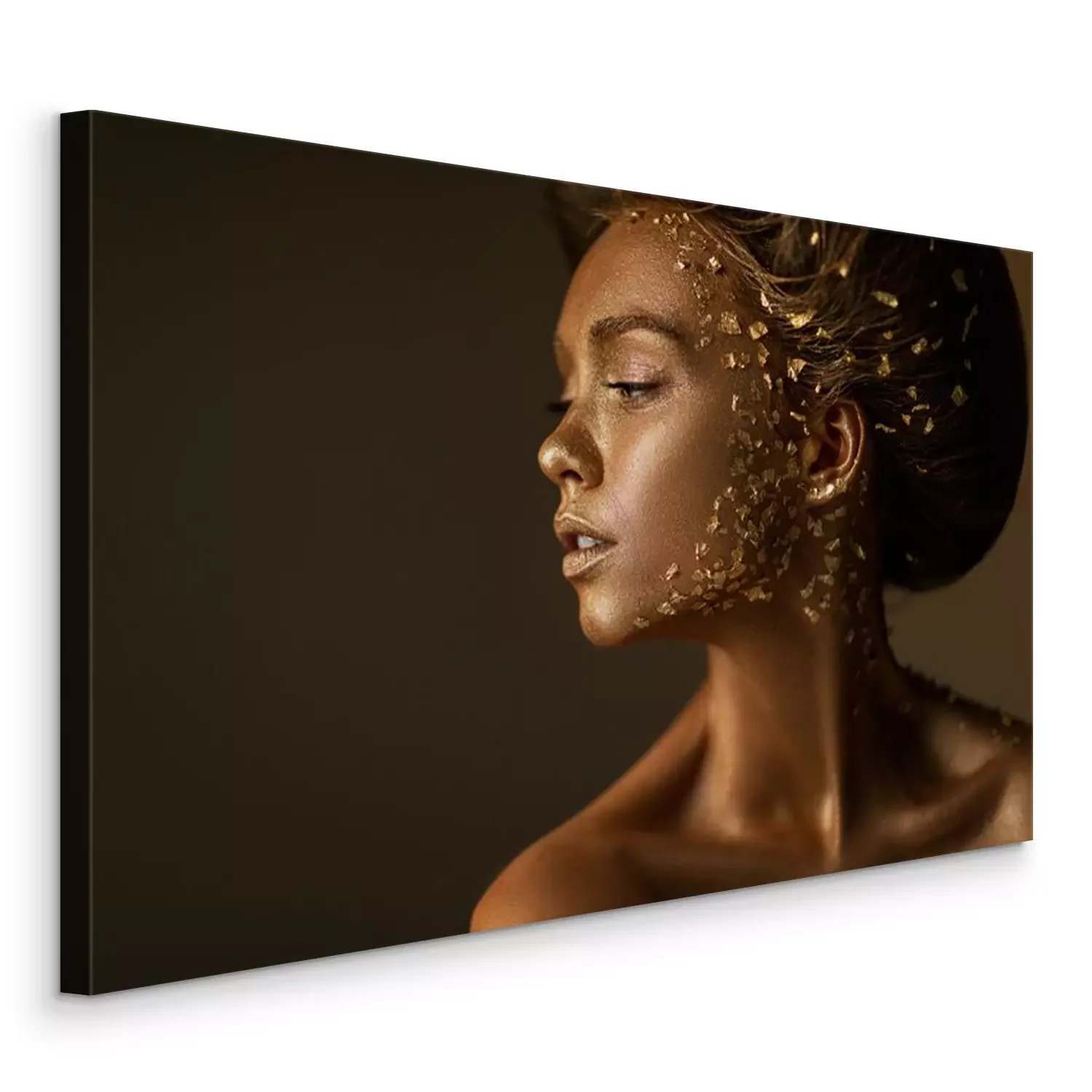 Tableau : Fashion art portrait of model girl with holiday golden shiny professional makeup. beaty woman with gold metallic body and hair on dark background. Gold glowing skin. copy space