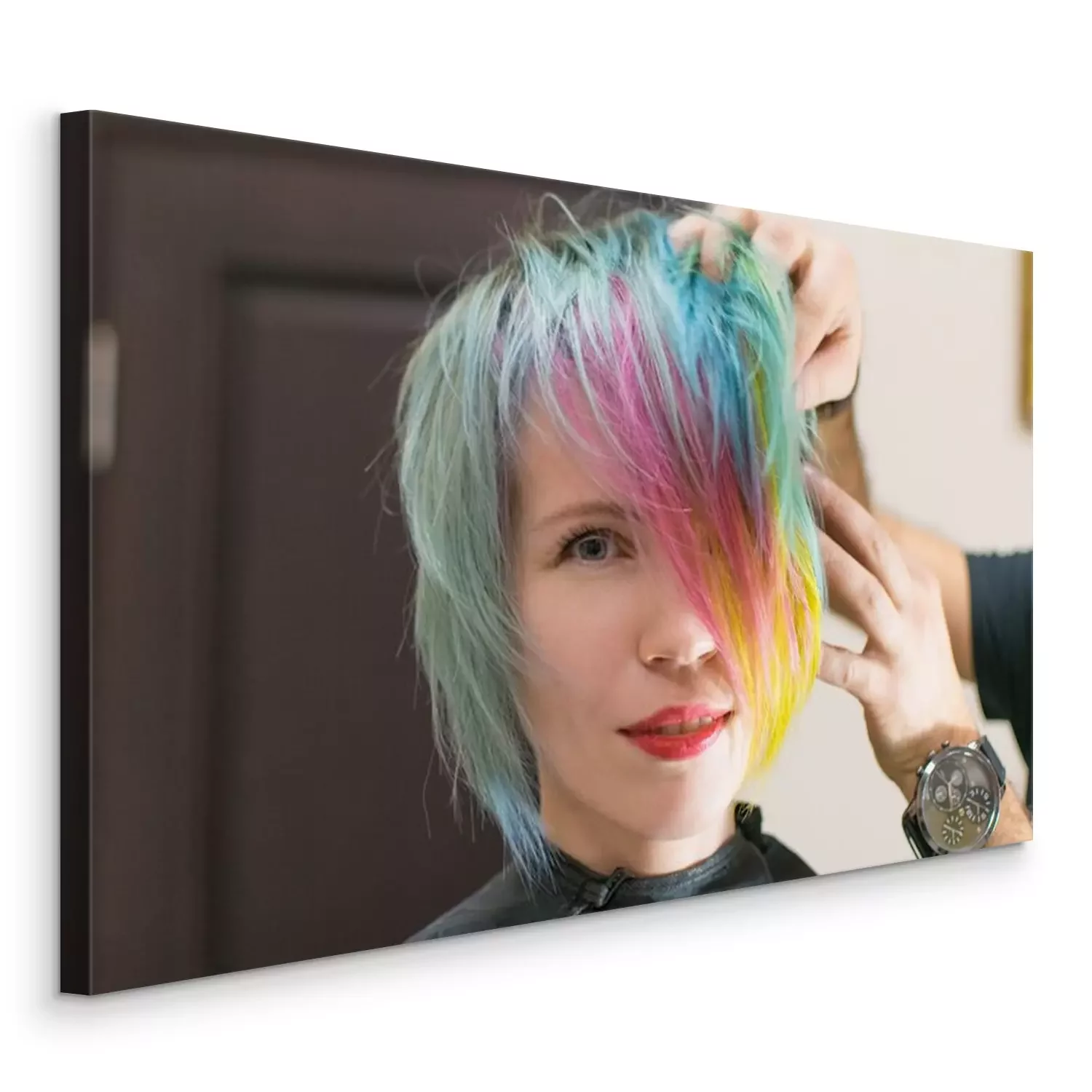 Tableau  Femme 30-40 sourit et fait la coloration des cheveux de différentes couleurs dans un salon de coiffure. Changer l'image d'une femme.