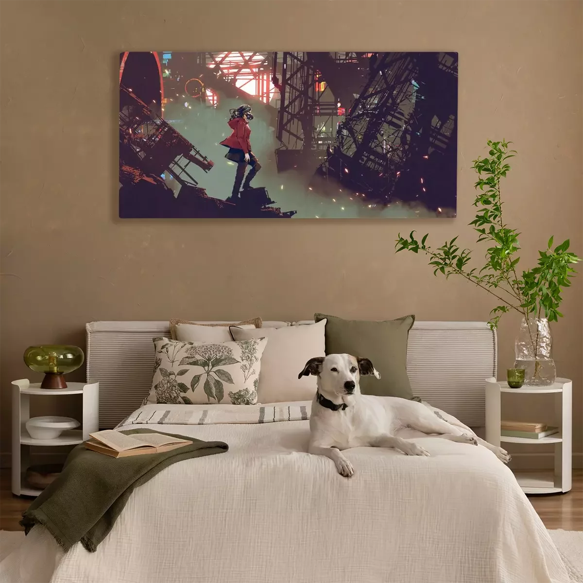 Tableau  femme avec masque futuriste debout dans la ville cyberpunk, style art numérique, illustration peinture