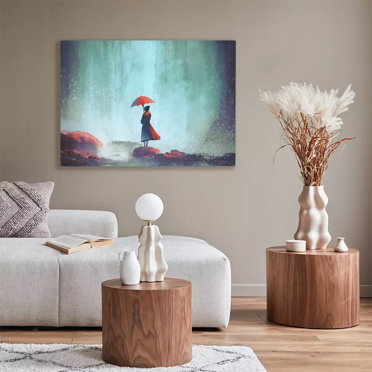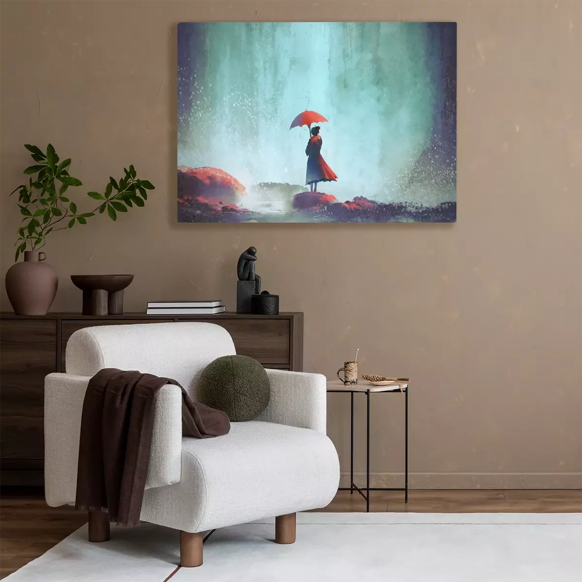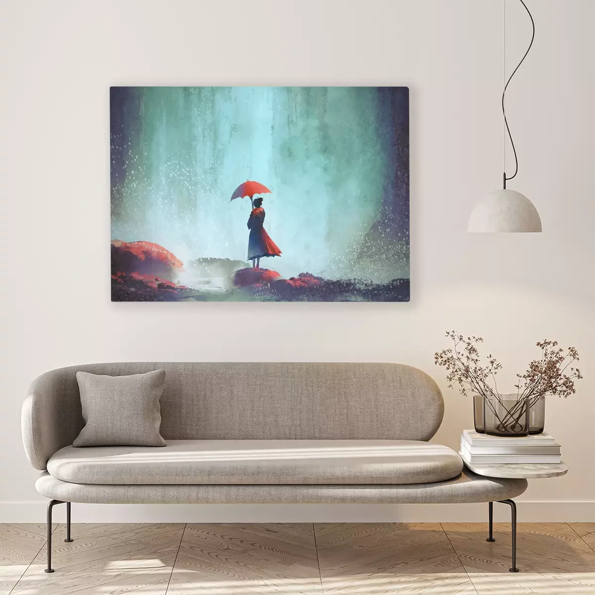 Tableau : Femme avec un parapluie contre la cascade, peinture d'illustration