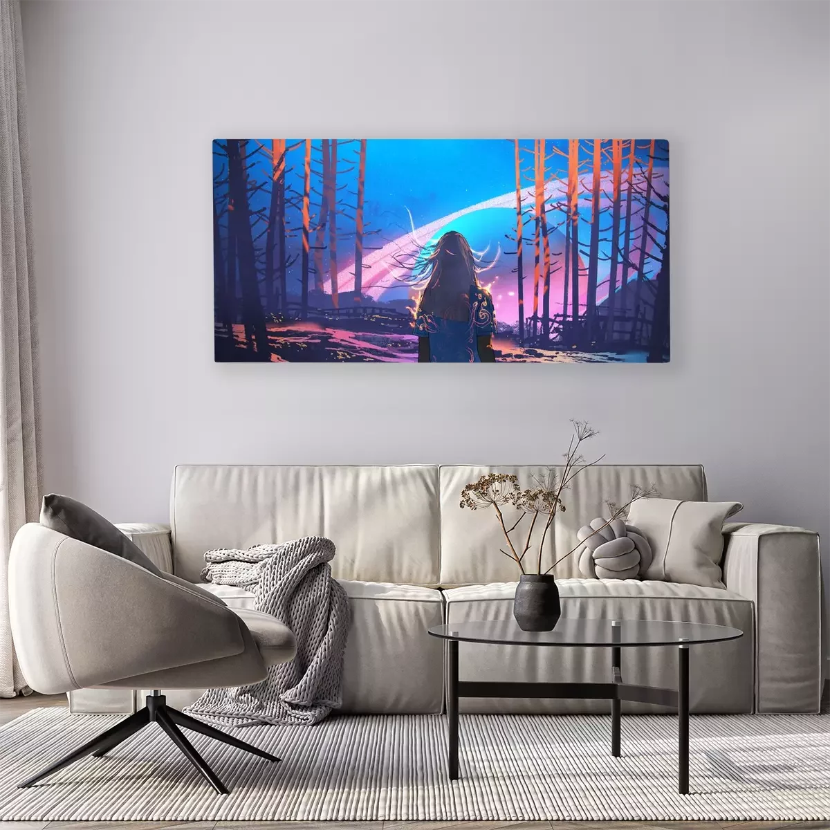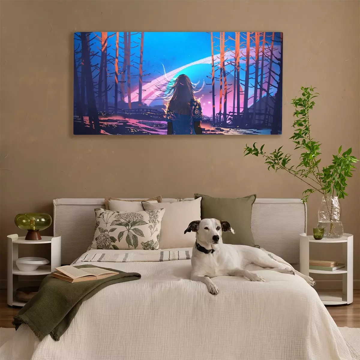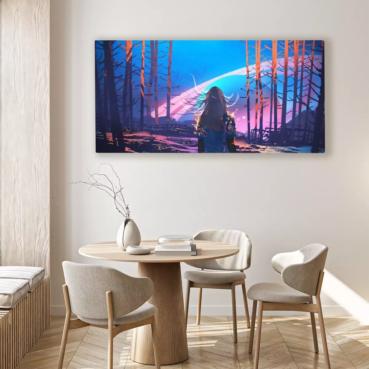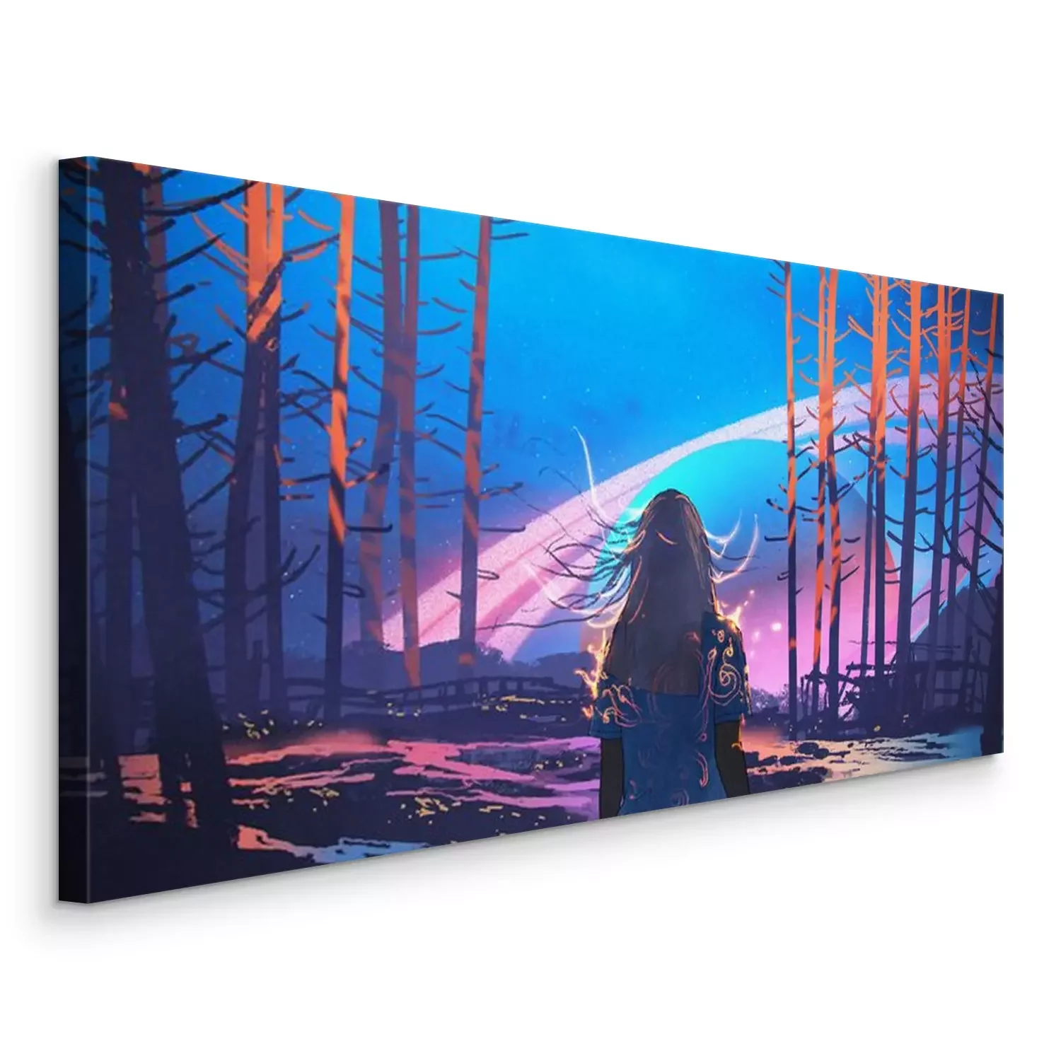 Tableau  Femme debout seule dans la forêt avec fond de planètes fictives, style d'art numérique, peinture d'illustration