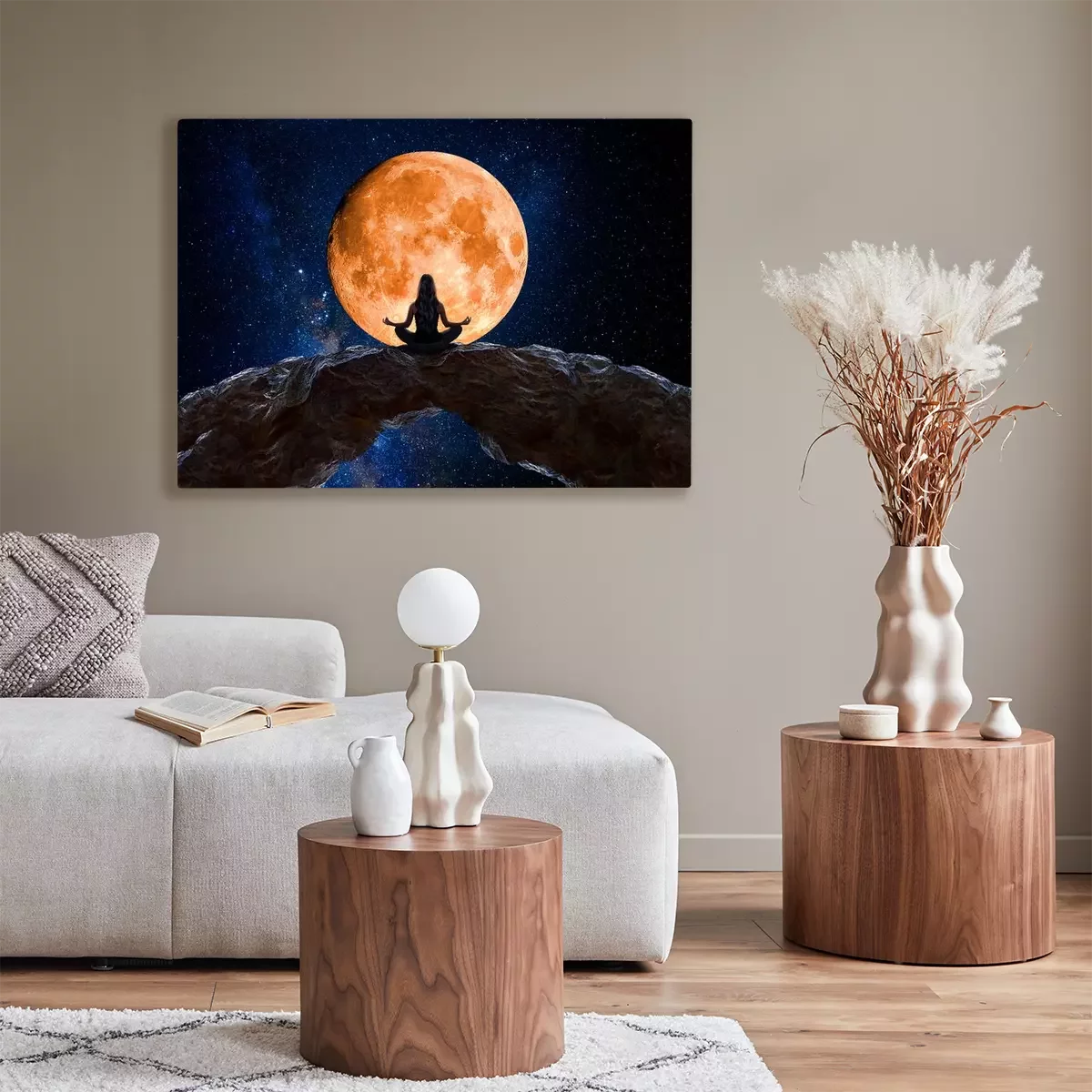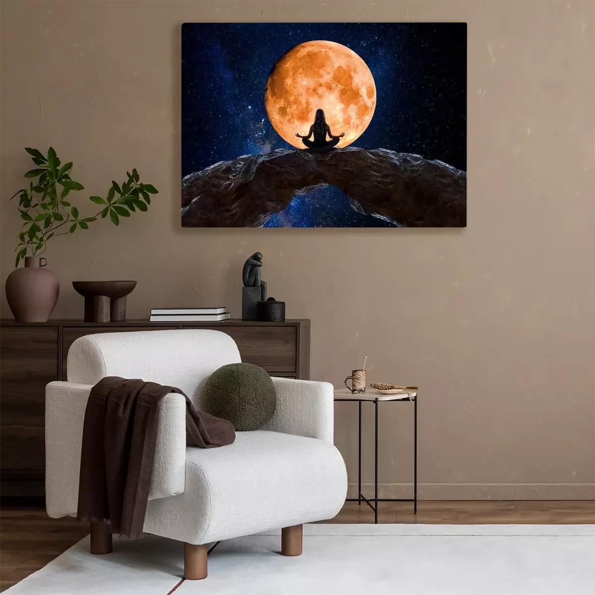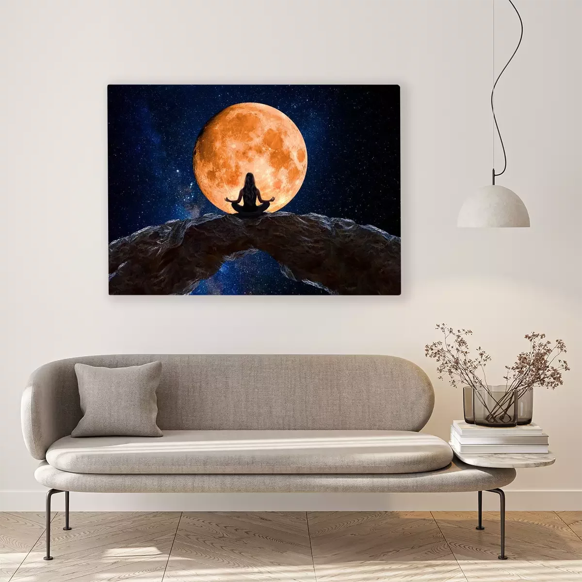 Tableau : Femme en pleine méditation observant l'univers