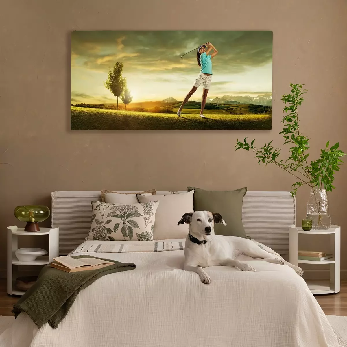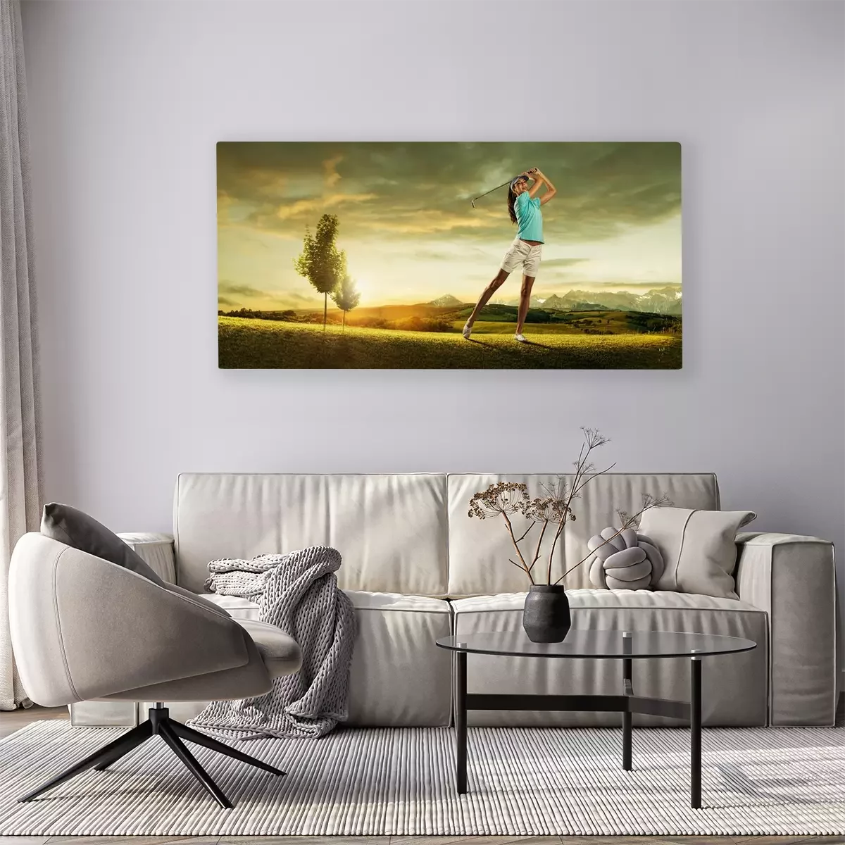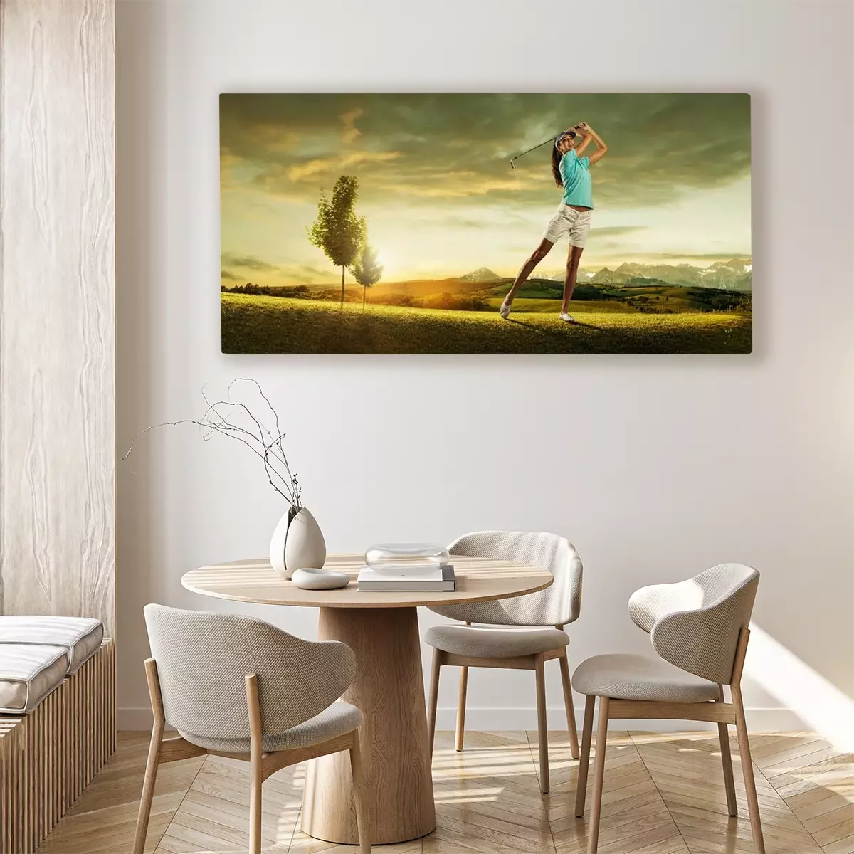 Tableau  Femme golfeur de frapper la balle sur le paysage magnifique