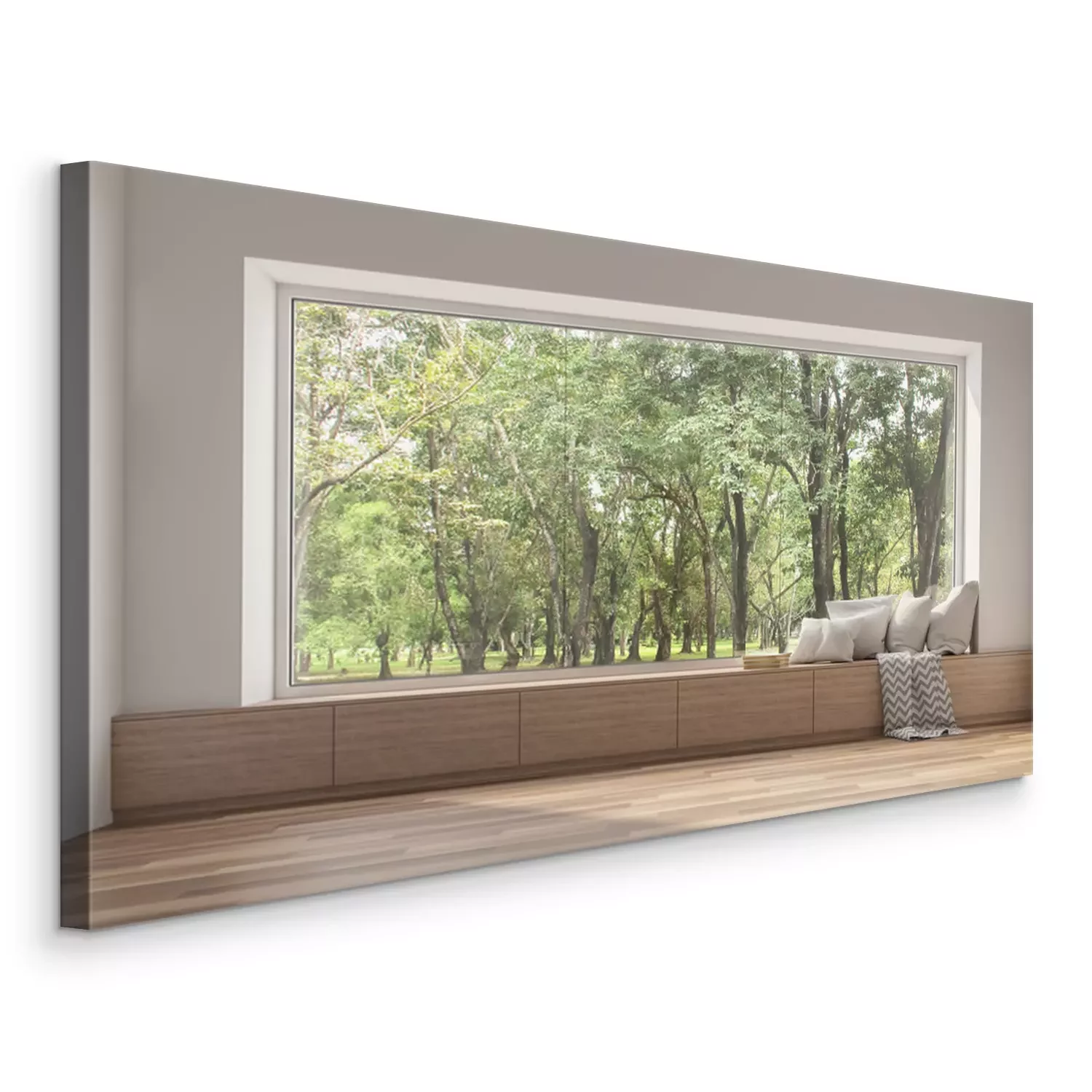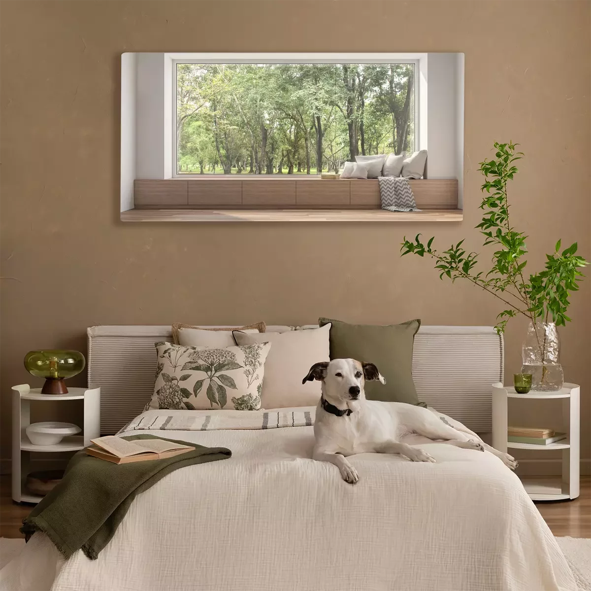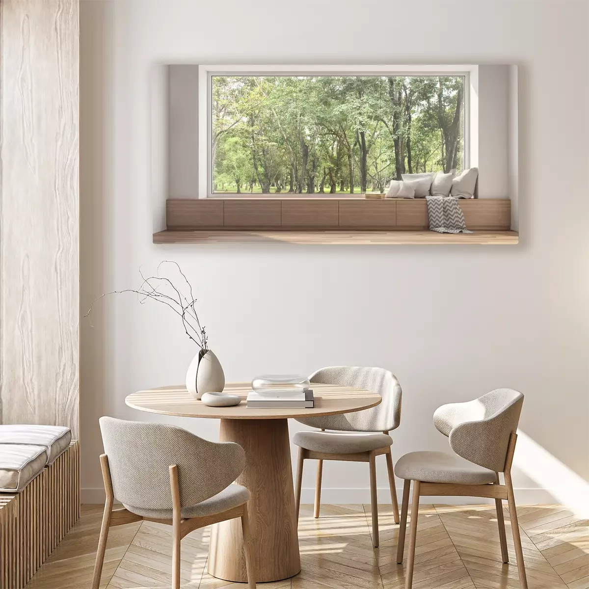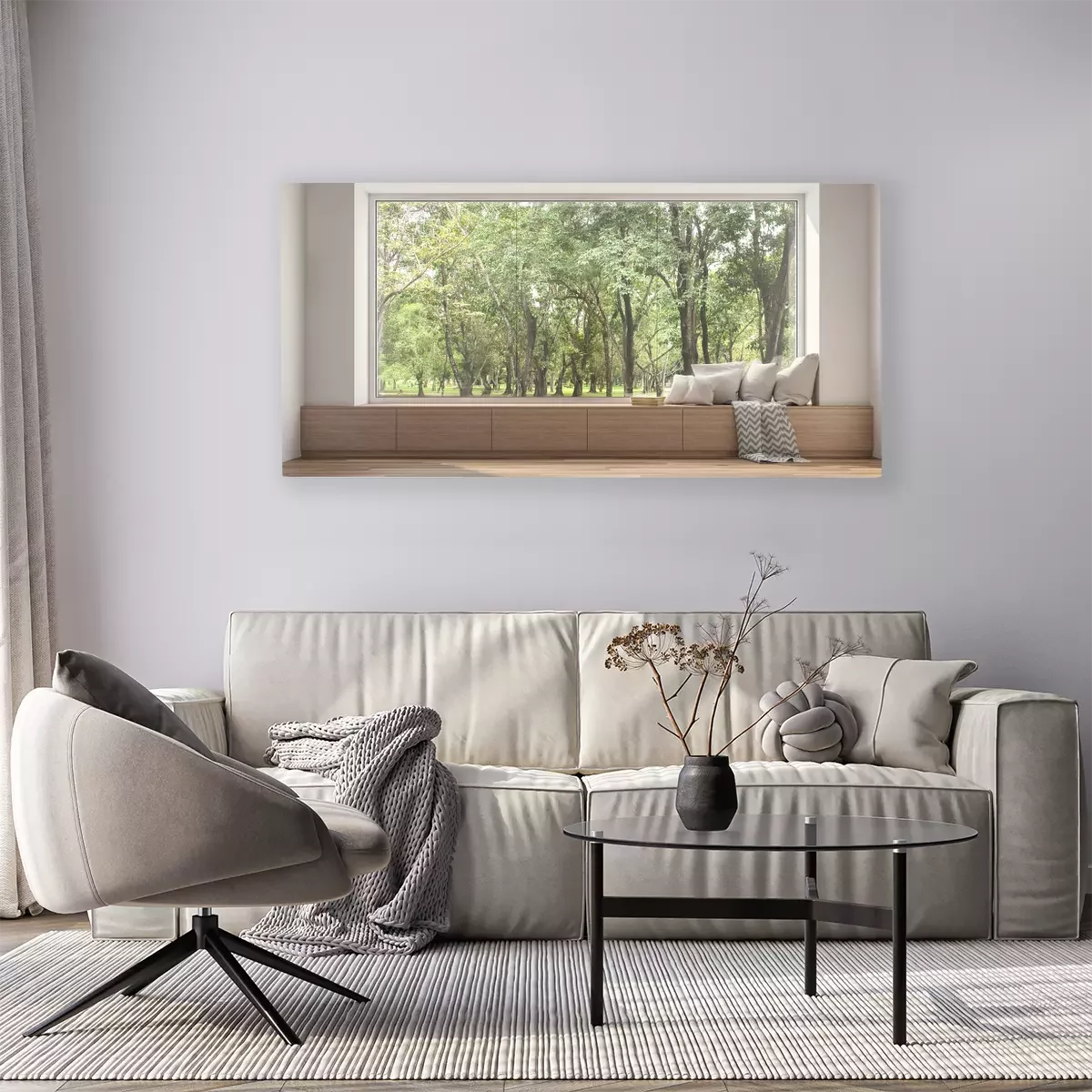 Tableau  Fenêtre latérale siège rendu 3d.Il y a salle blanche, siège en bois, décorer avec de nombreux oreiller.Il y a de grandes fenêtres donnent sur la vue de la nature.