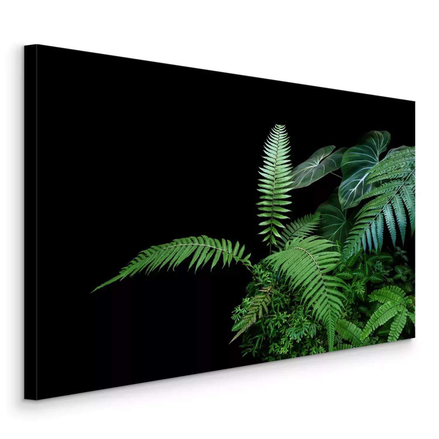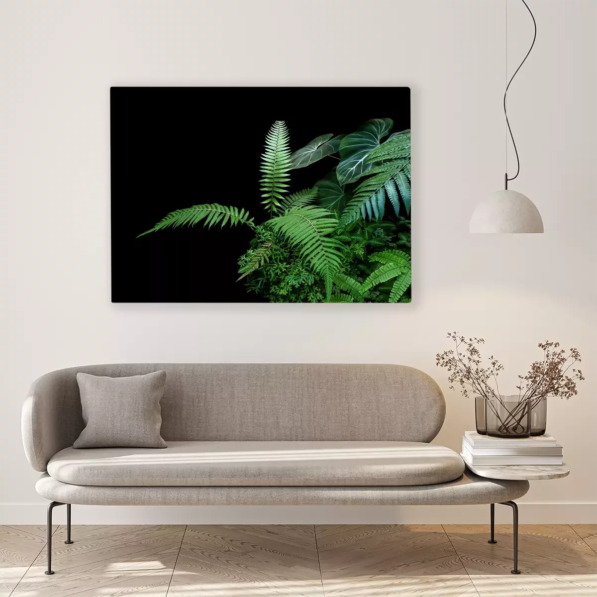 Tableau : Fern fronds, philodendron leaves (Philodendron gloriosum) and tropical foliage rainforest plants bush on black background.
