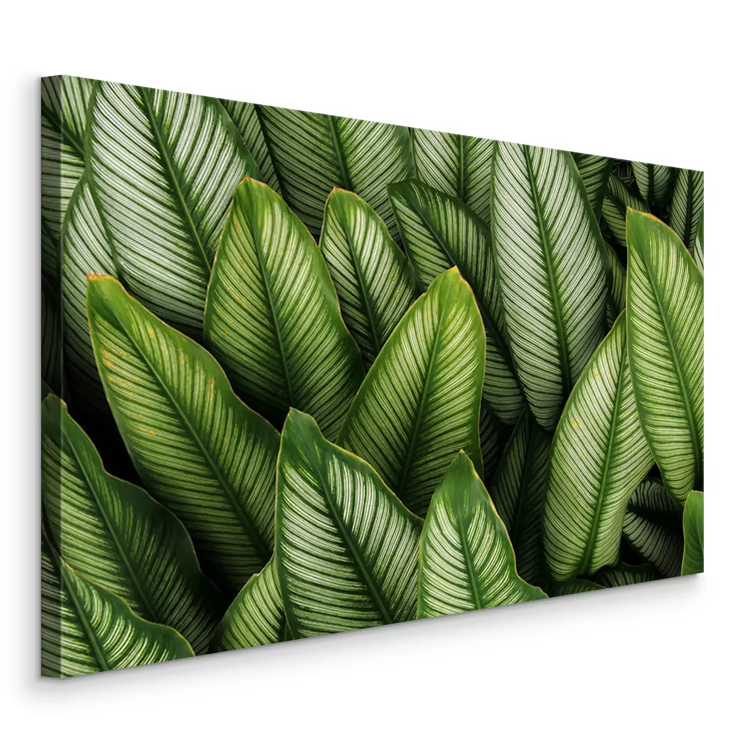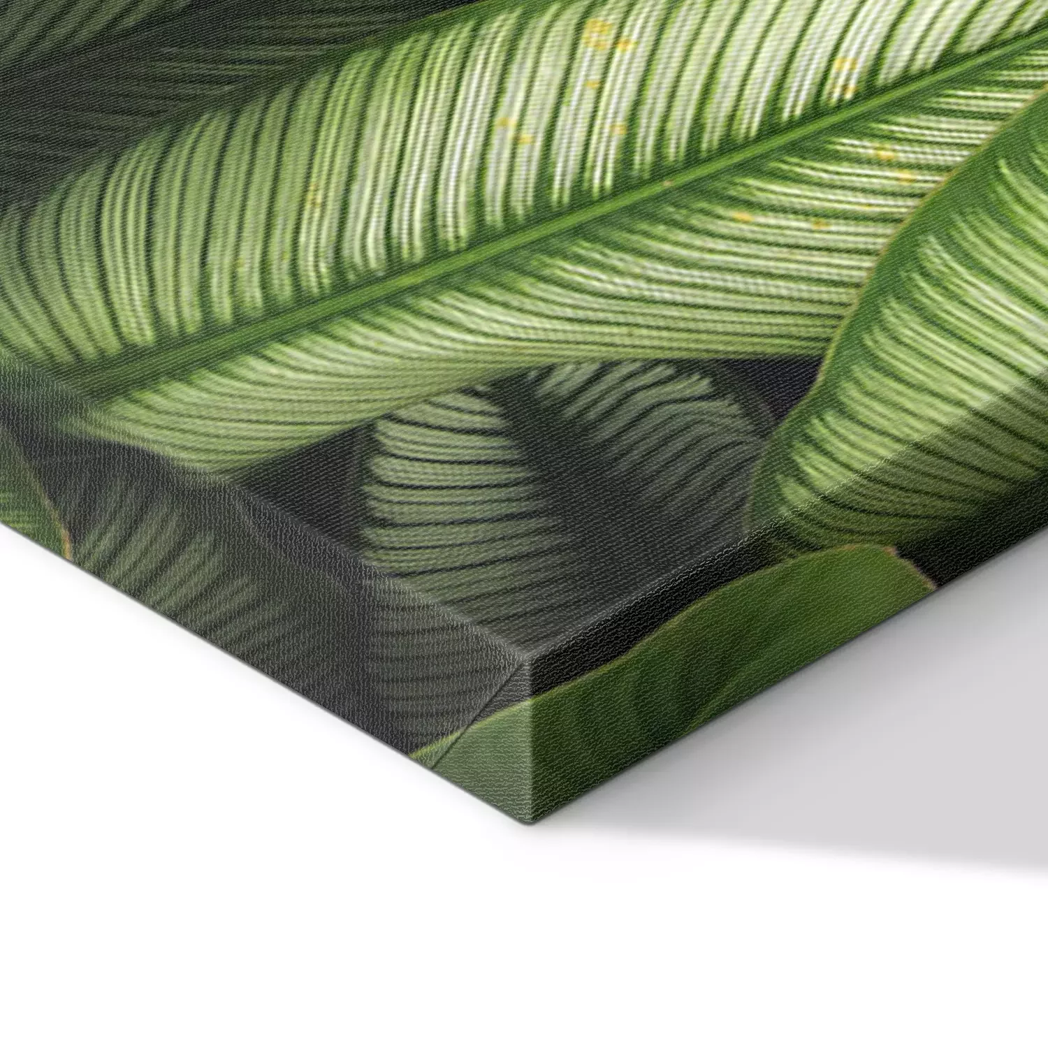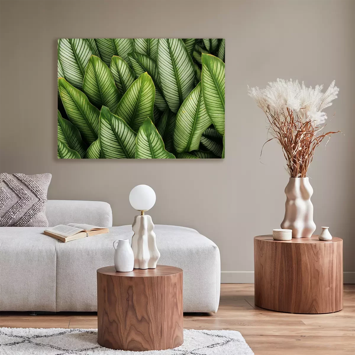 Tableau  Feuille verte avec des rayures blanches de Calathea majestica, la nature des plantes feuillage tropical laisse motif sur fond sombre.