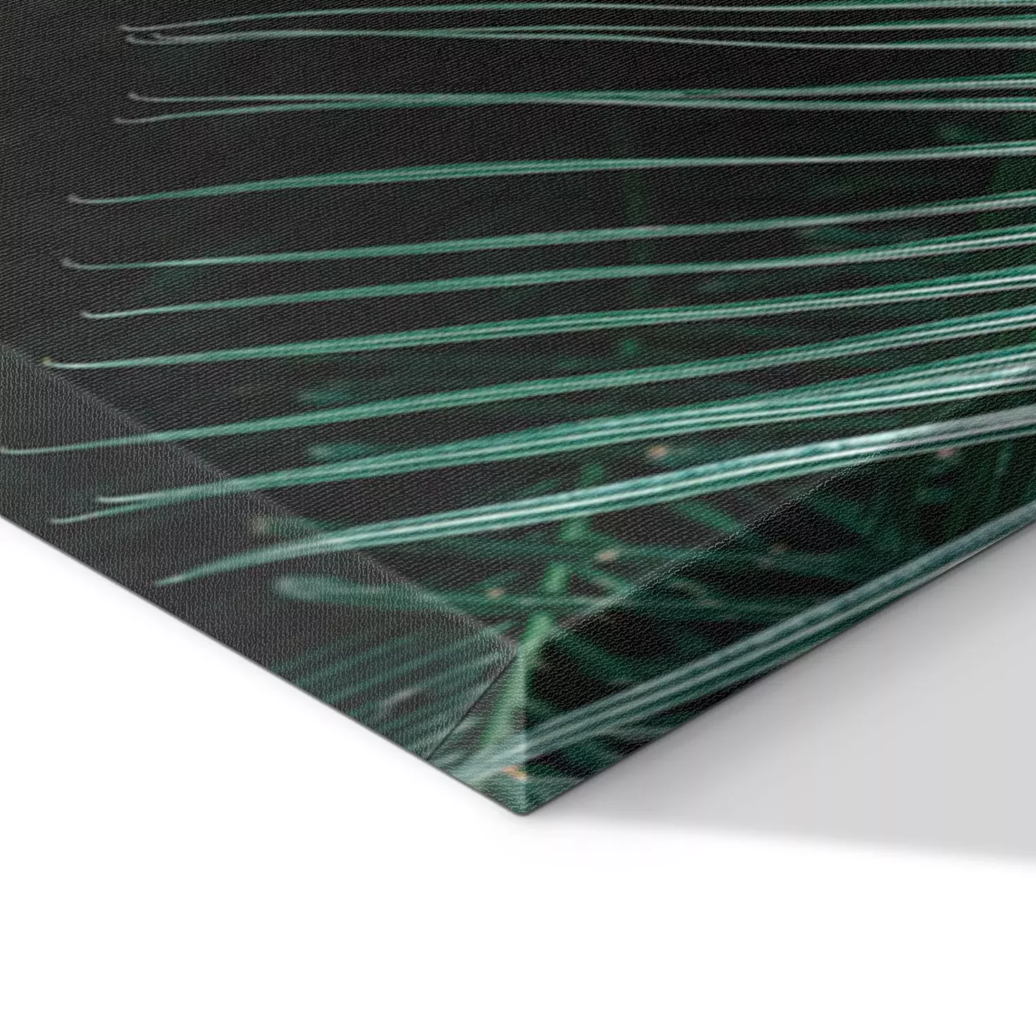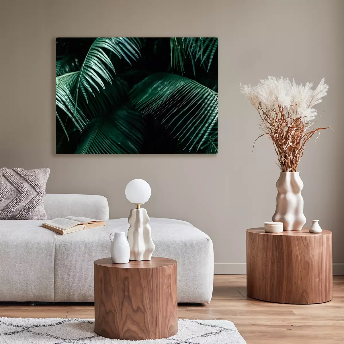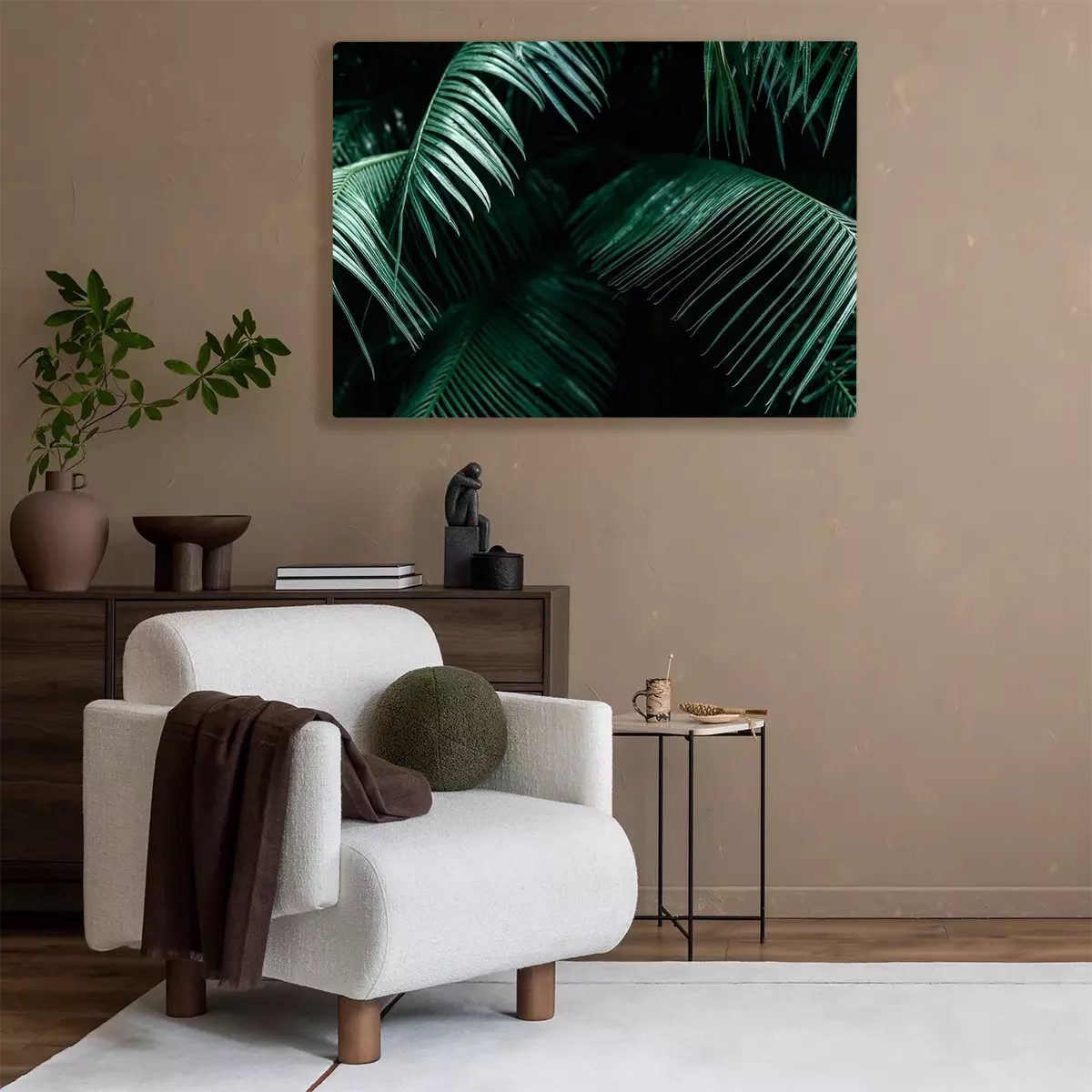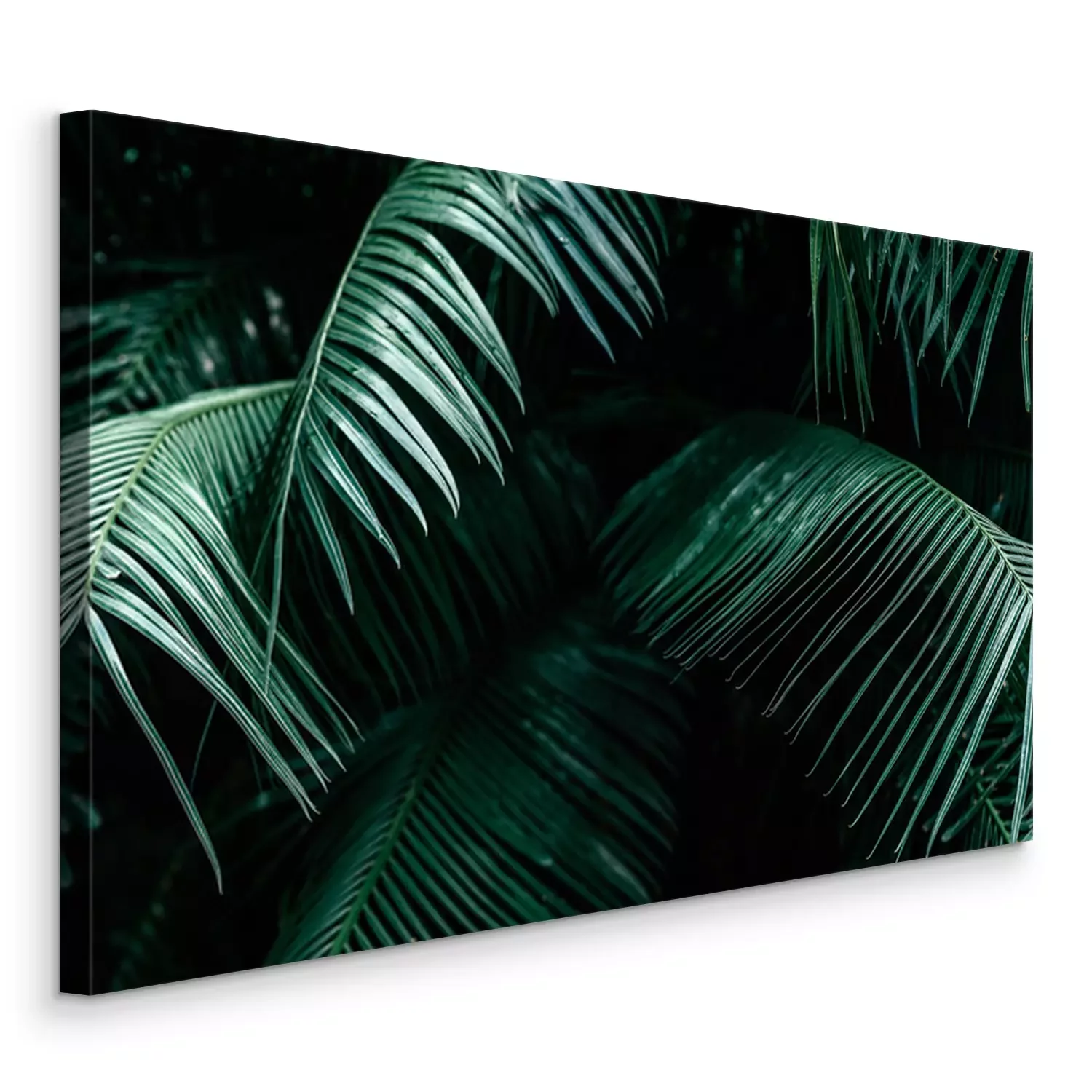 Tableau : Feuilles de palmier vert foncé dans une forêt tropicale