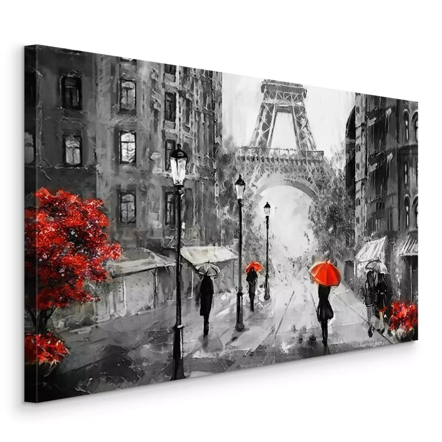 Peinture à l'huile sur toile, vue sur la rue de Paris. Ouvrages d'art. tour Eiffel . Personnes sous un parapluie rouge. Arbre. France