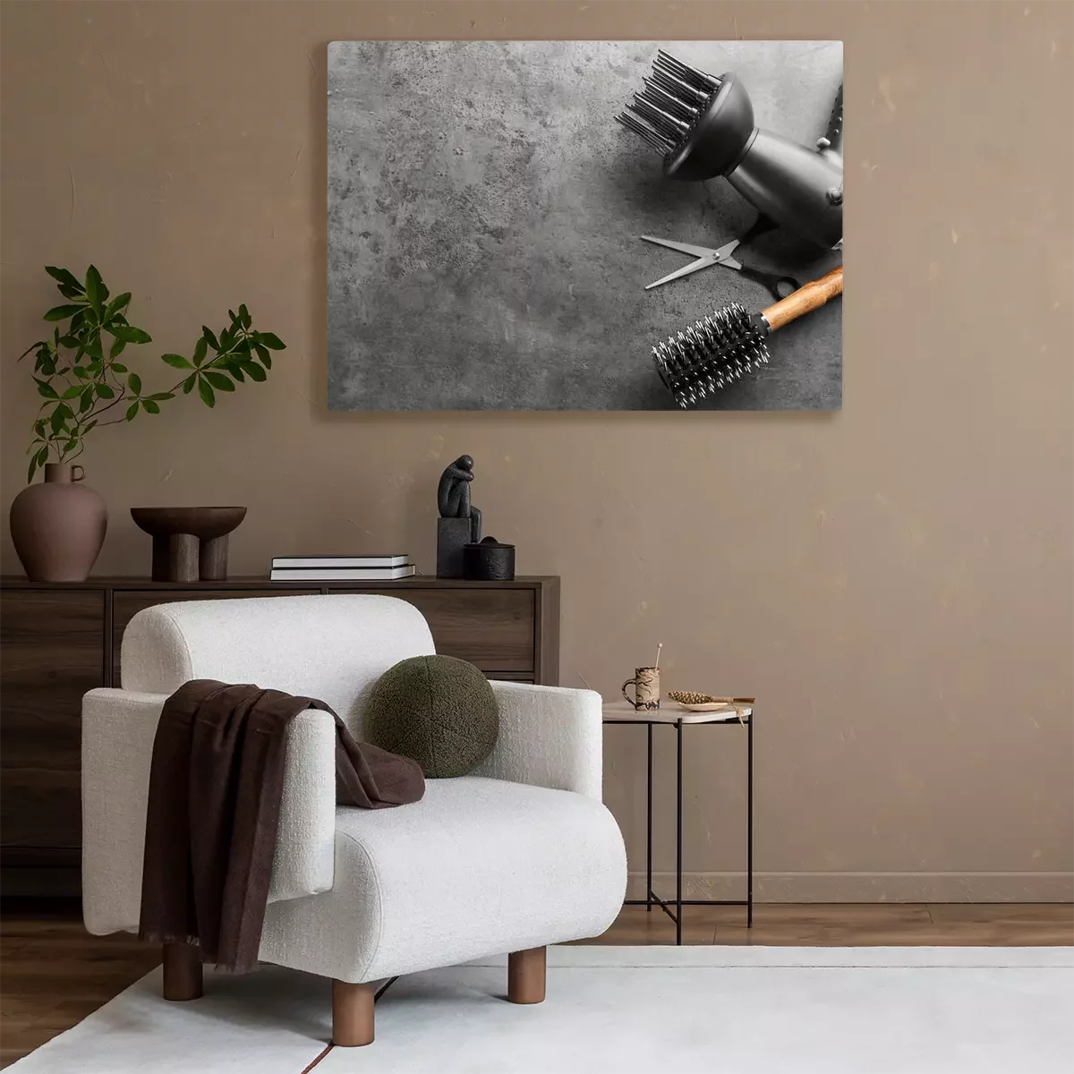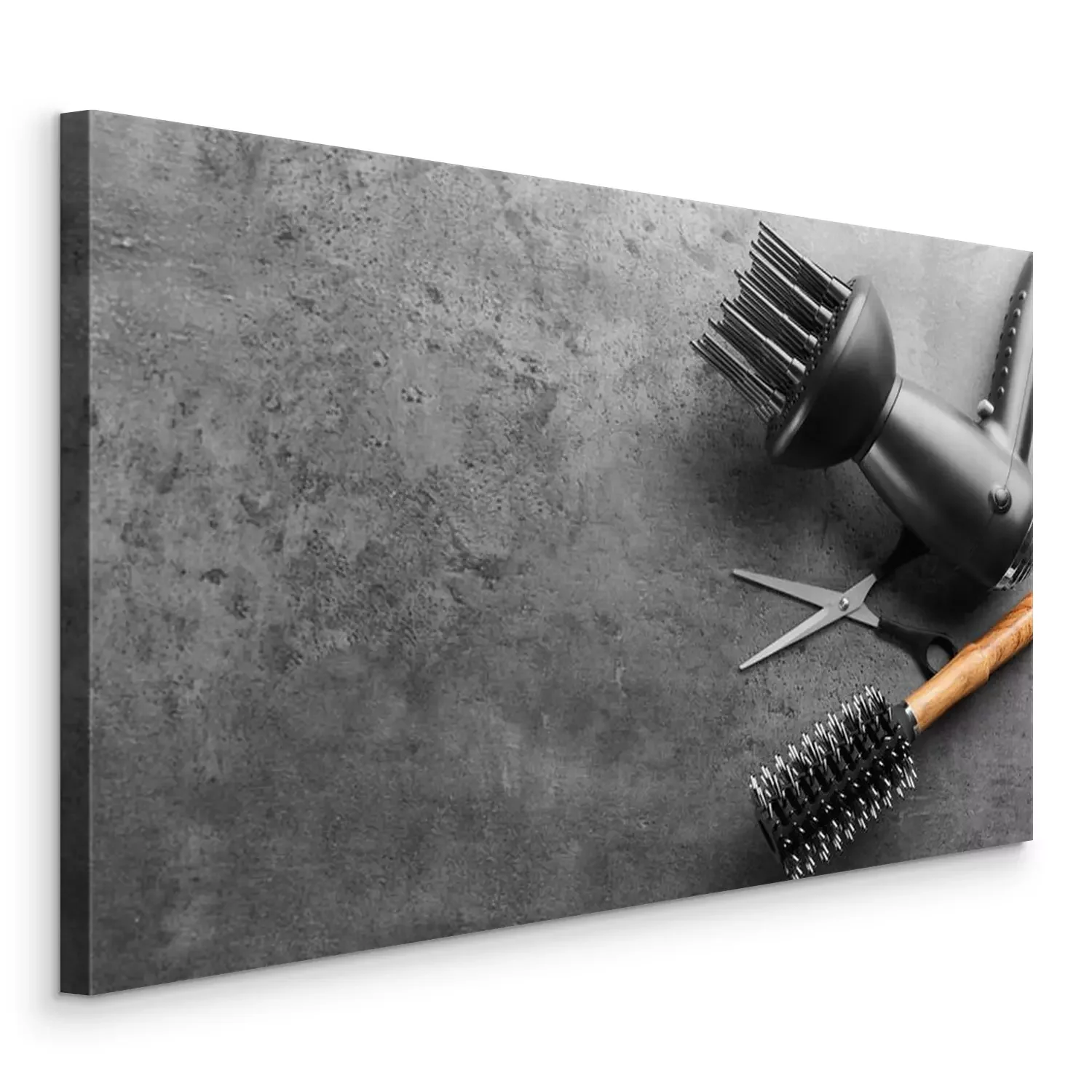 Tableau  Flat lay composition with set of hairdresser's tools on grey background