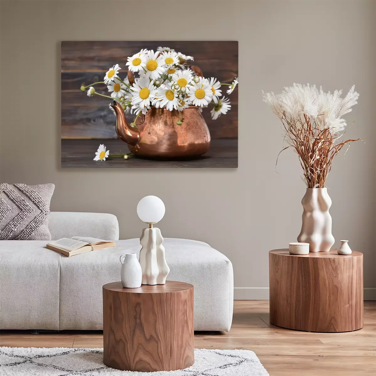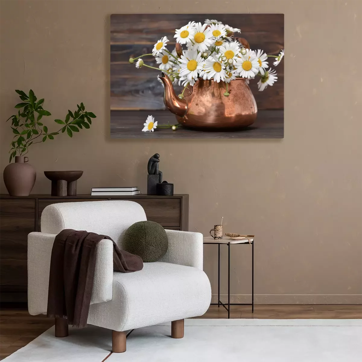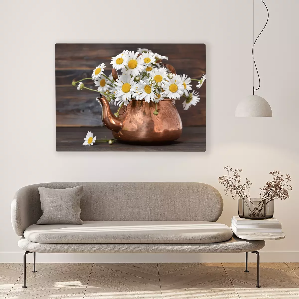 Tableau : Fleurs de Marguerite dans une théière vintage sur fond en bois