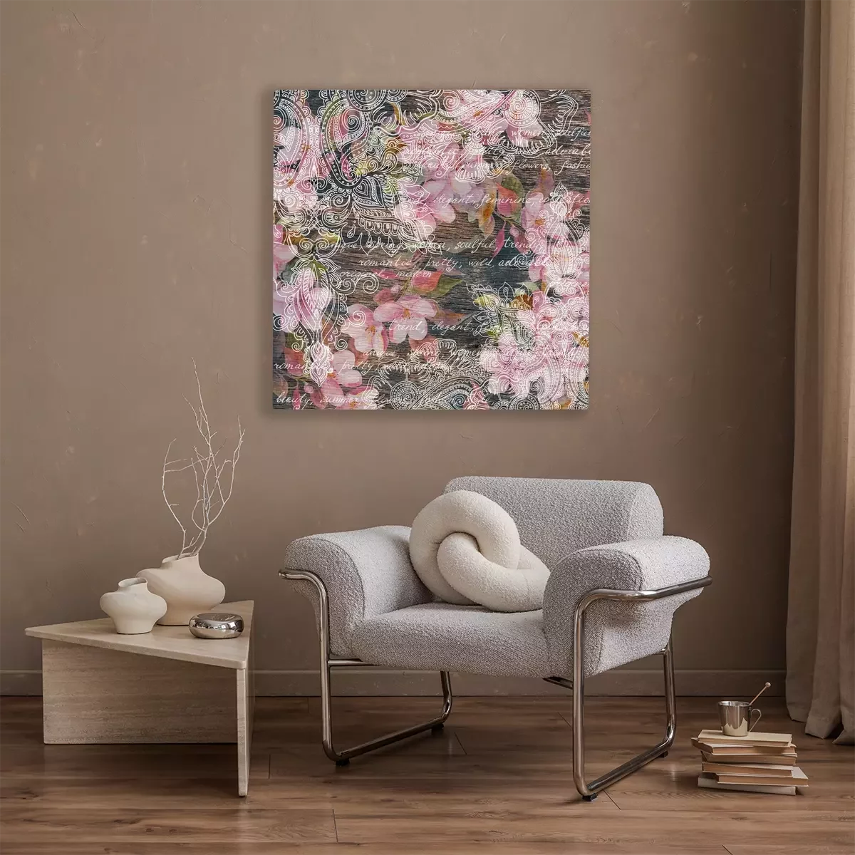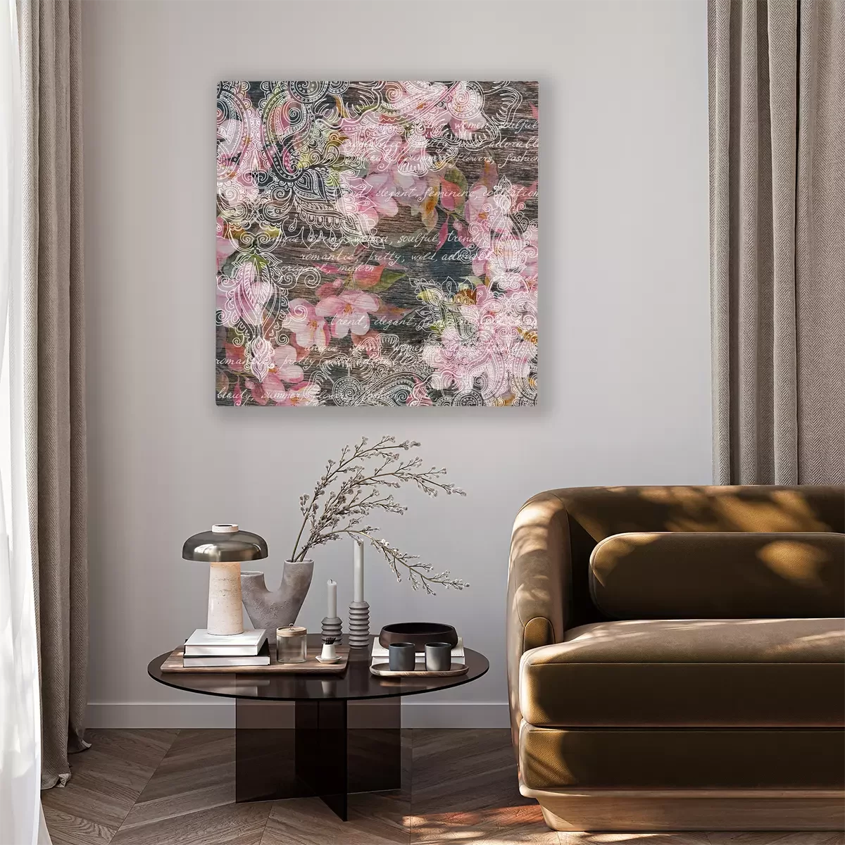 Tableau : Fleurs, design ornemental indien, texture du bois. Aquarelle, note manuscrite