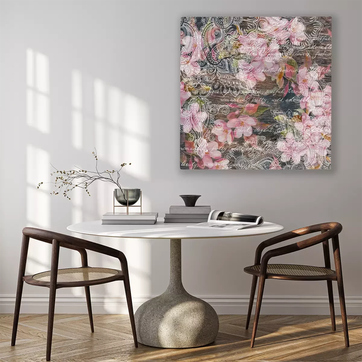 Tableau  Fleurs, design ornemental indien, texture du bois. Aquarelle, note manuscrite
