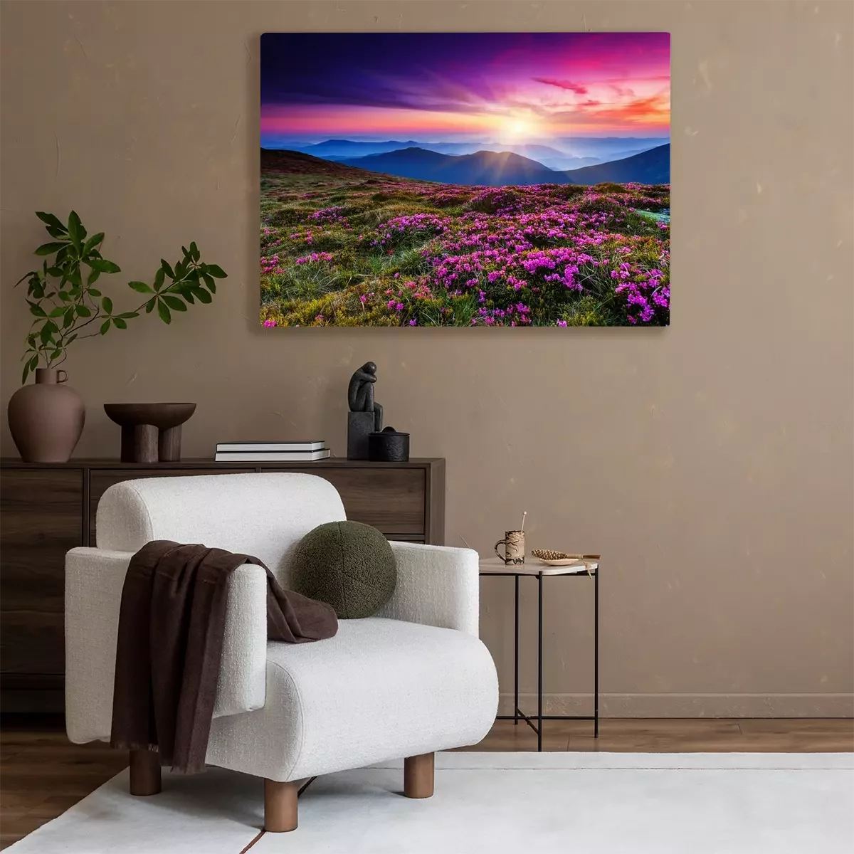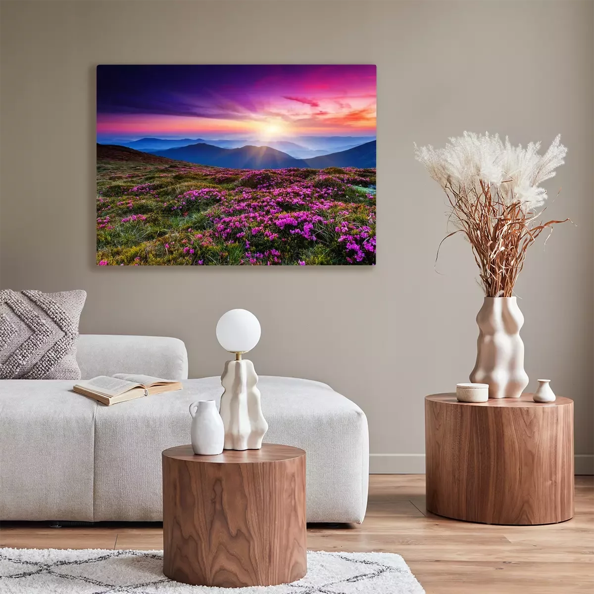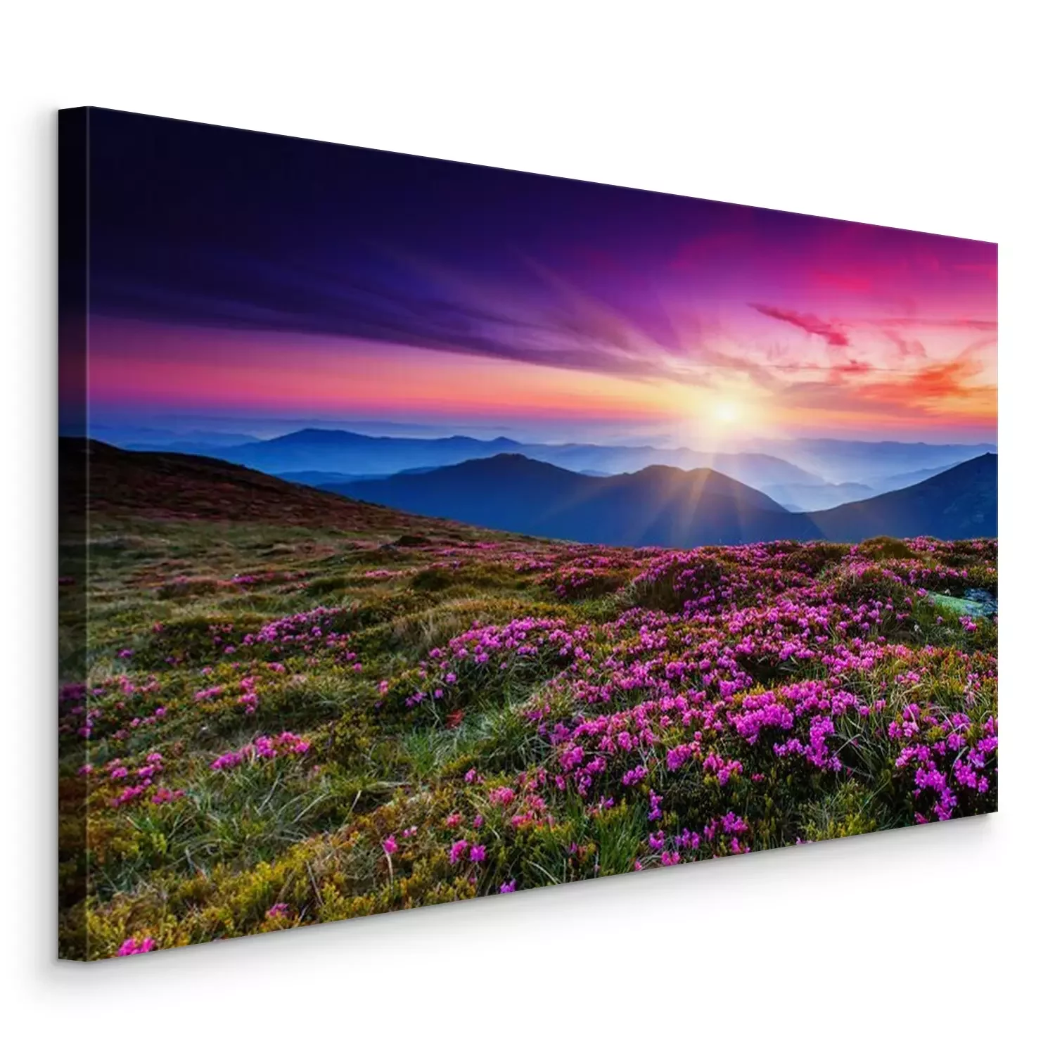 Tableau  Fleurs roses sur une colline au coucher du soleil
