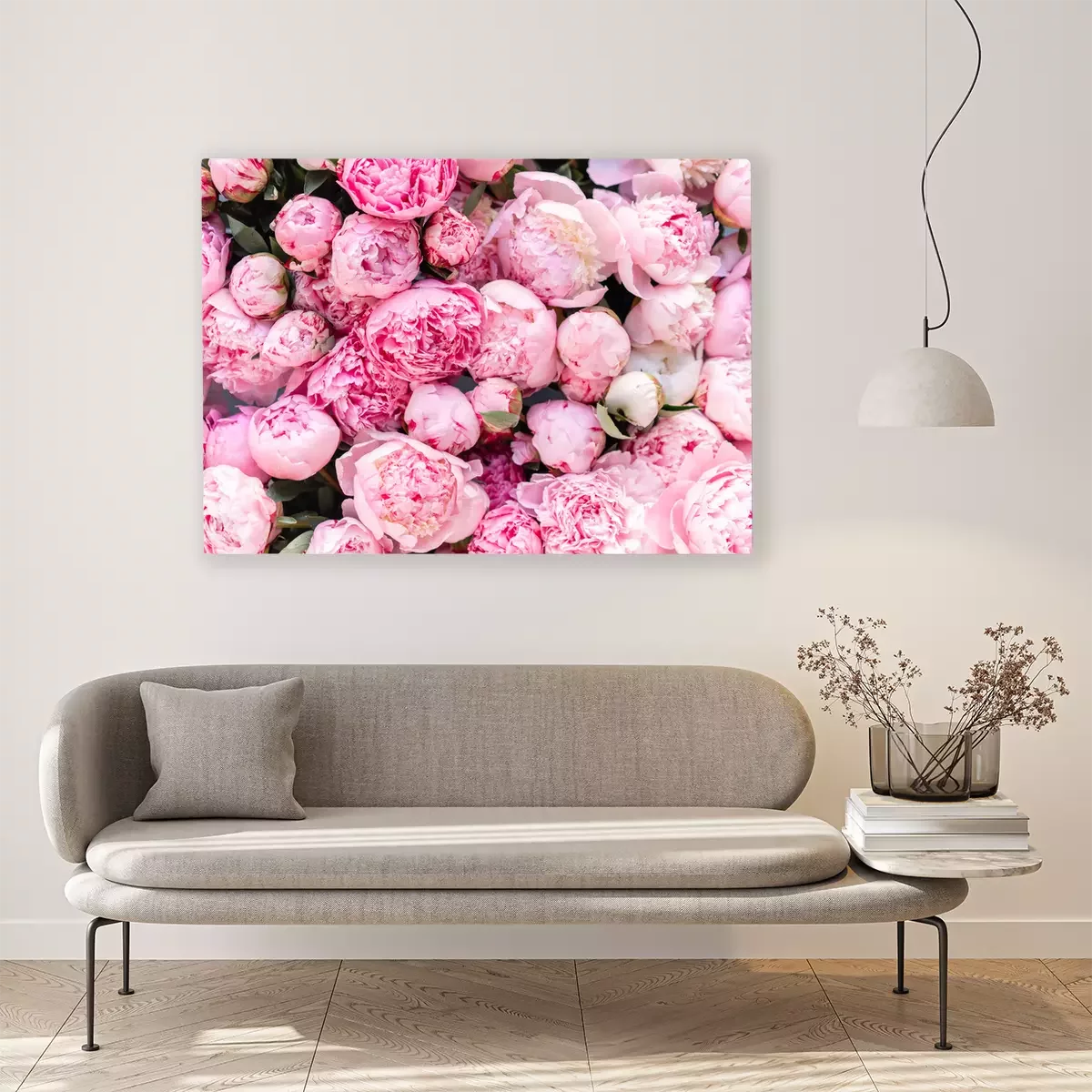 Tableau  Floral carpet or Wallpaper. Background of pink peonies. Morning light in the room. Beautiful peony flower for catalog or online store. Floral shop and delivery concept .