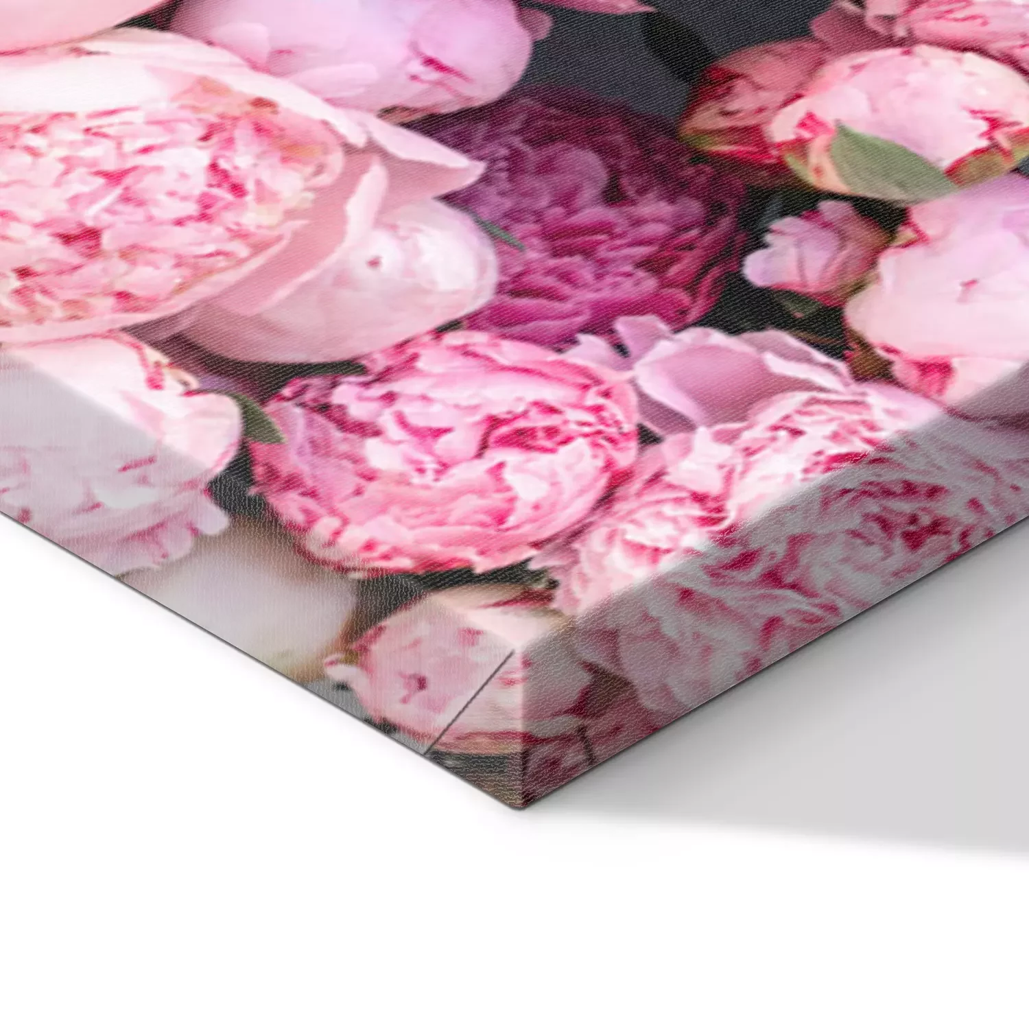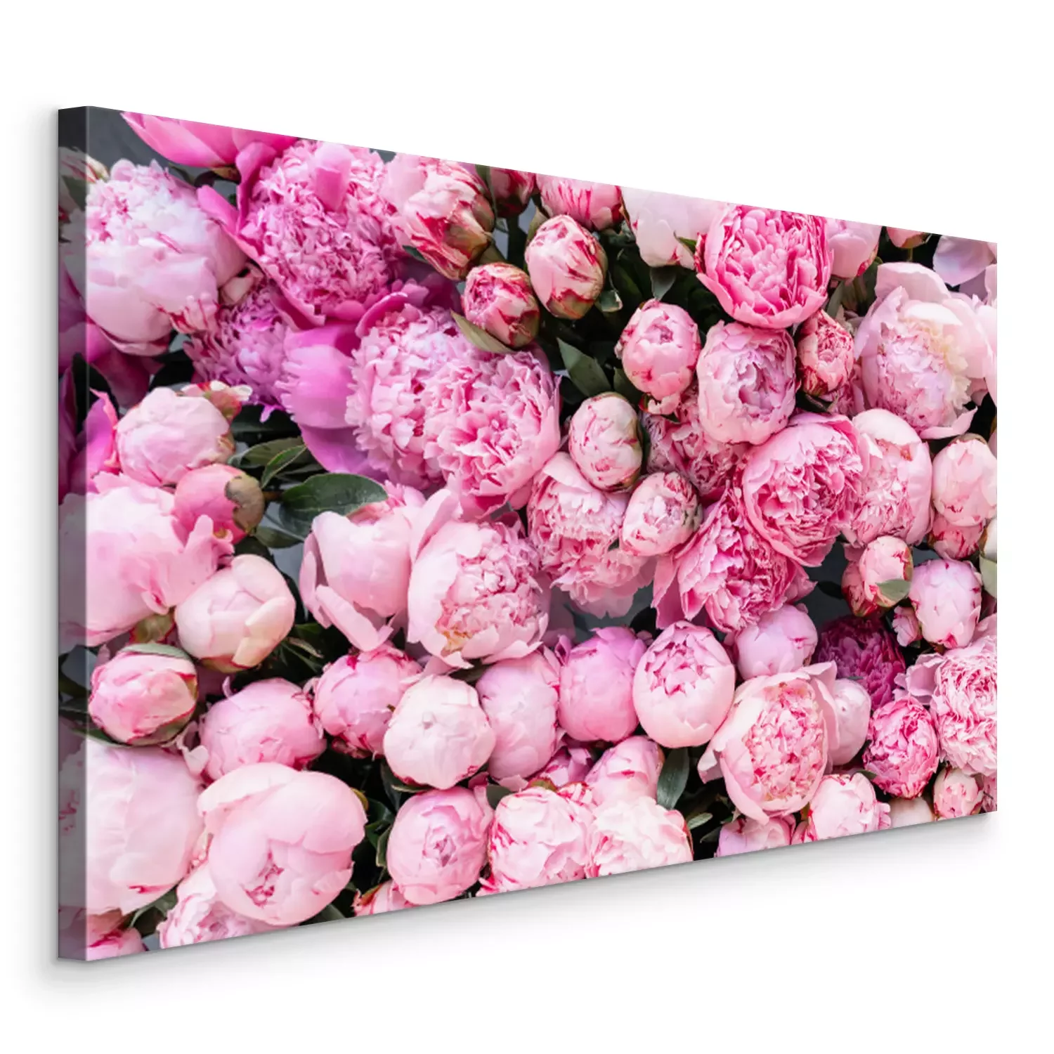 Tableau : Floral carpet or Wallpaper. Background of pink peonies. Morning light in the room. Beautiful peony flower for catalog or online store. Floral shop and delivery concept .