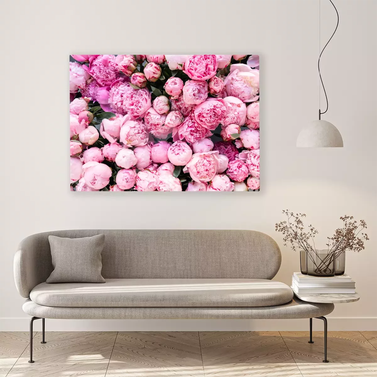 Tableau  Floral carpet or Wallpaper. Background of pink peonies. Morning light in the room. Beautiful peony flower for catalog or online store. Floral shop and delivery concept .