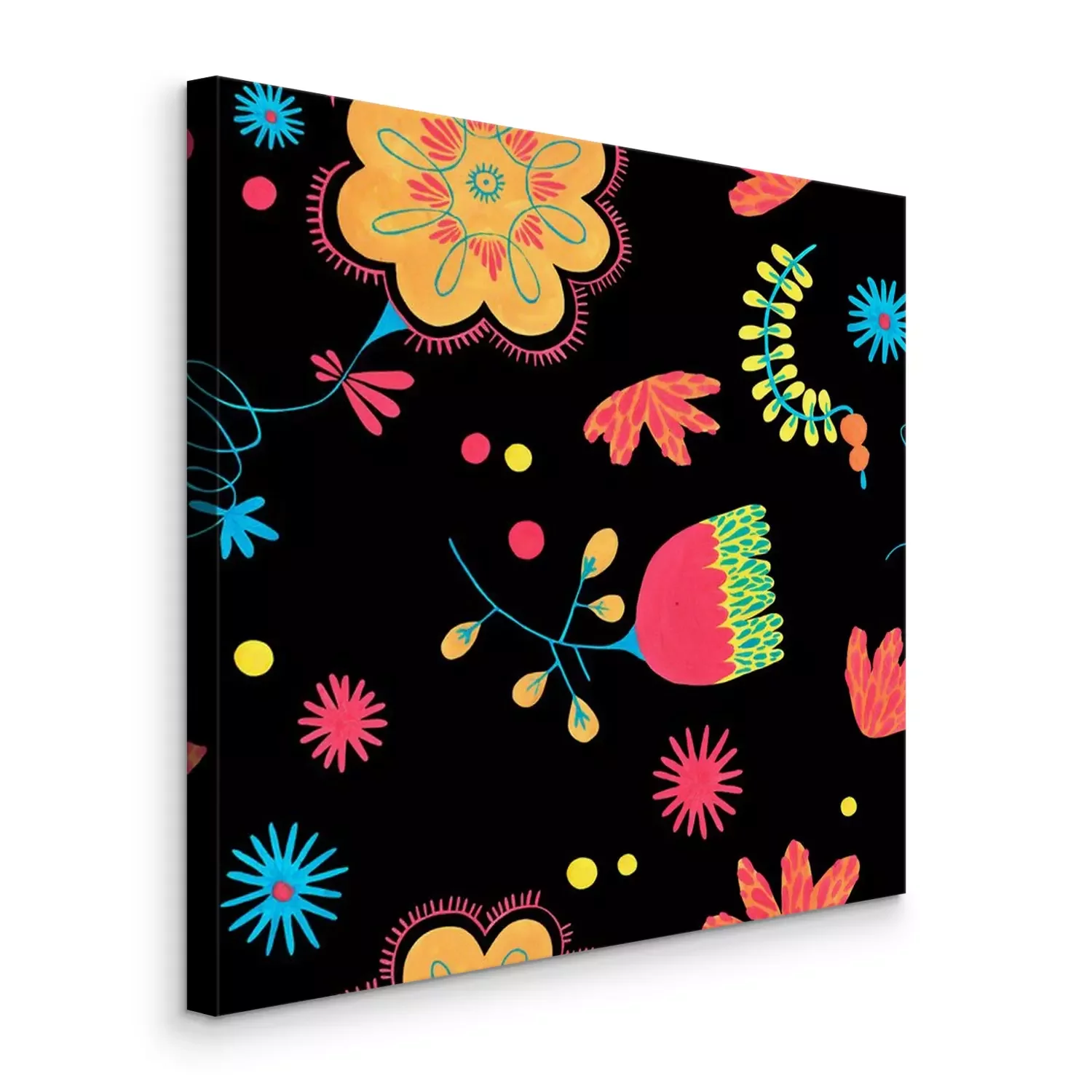 Tableau : Folk seamless pattern in minimal floral style with gouache flower elements on black background. Bright herbal pattern for scrapbooking, wrapping paper, textile, fabric or ditsy print.