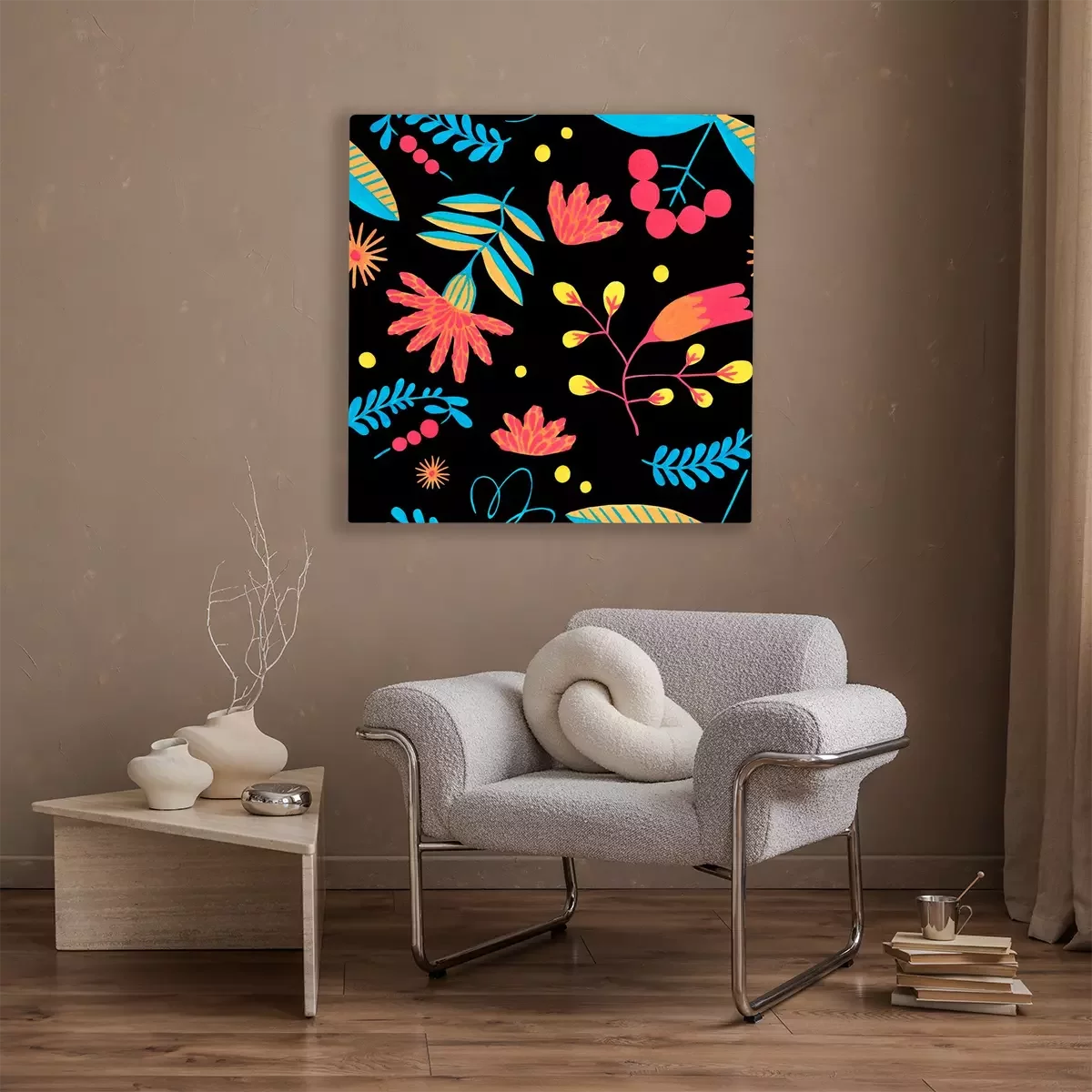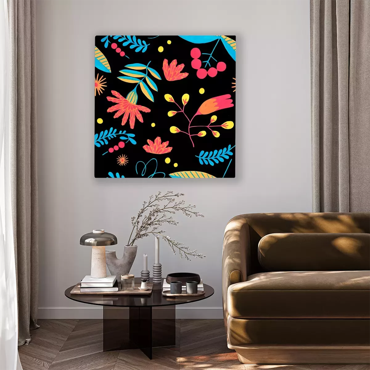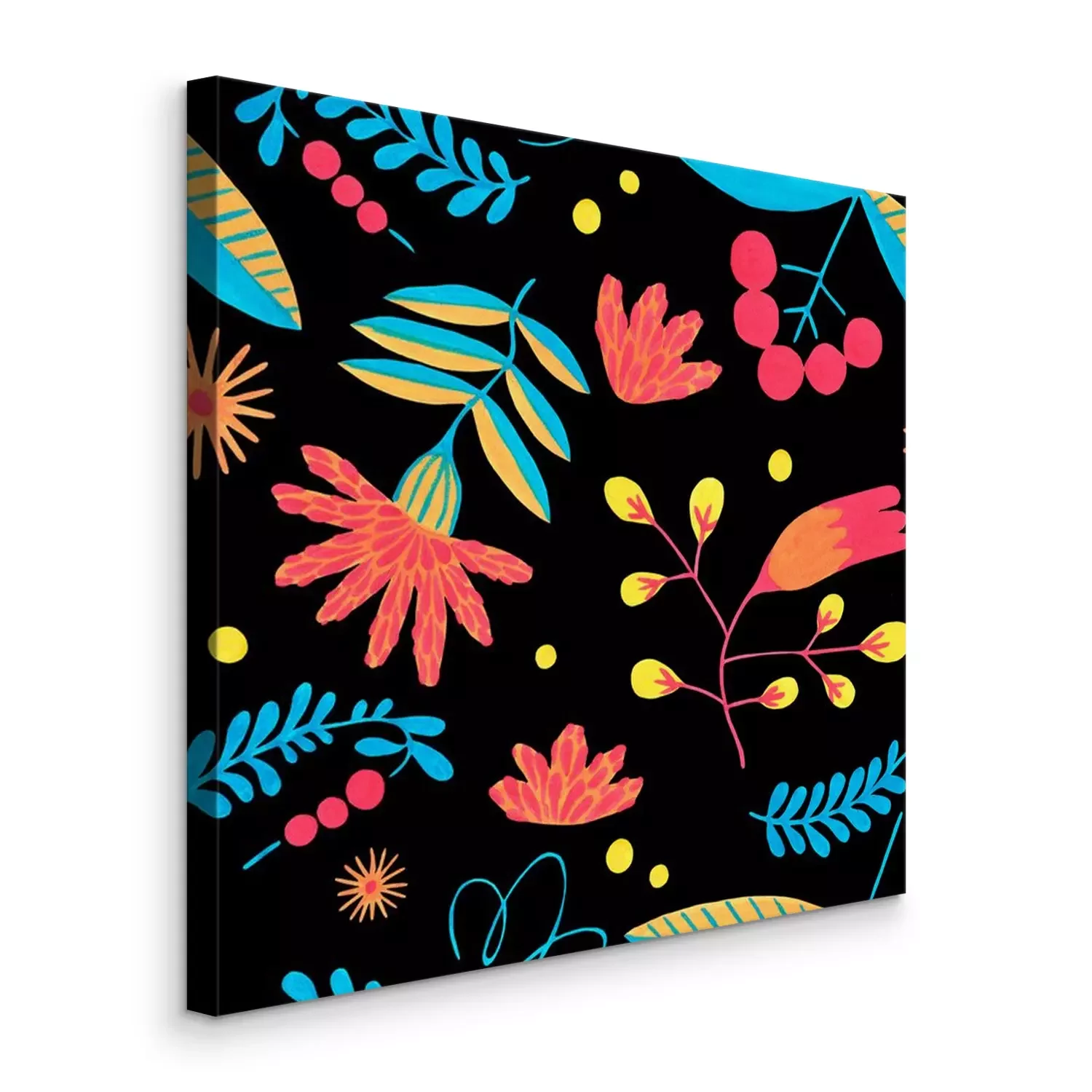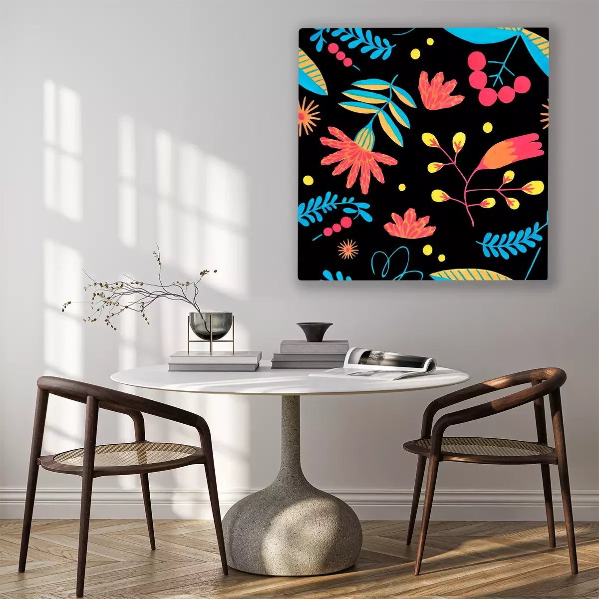 Tableau : Folk seamless pattern in minimal floral style with gouache flower elements on black background. Bright herbal pattern for scrapbooking, wrapping paper, textile, fabric or ditsy print.