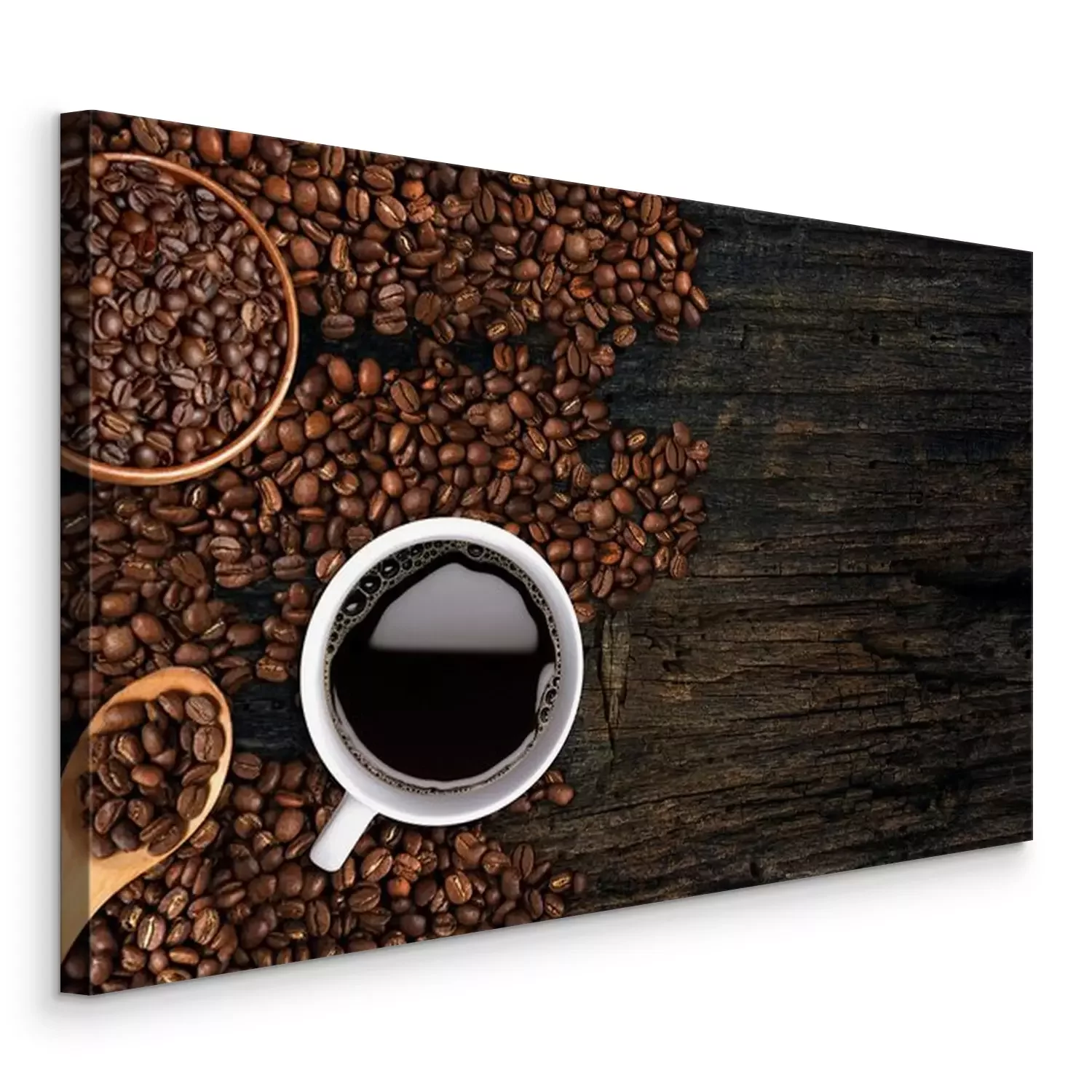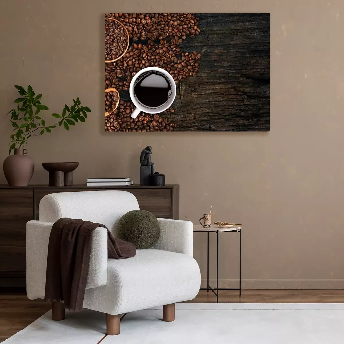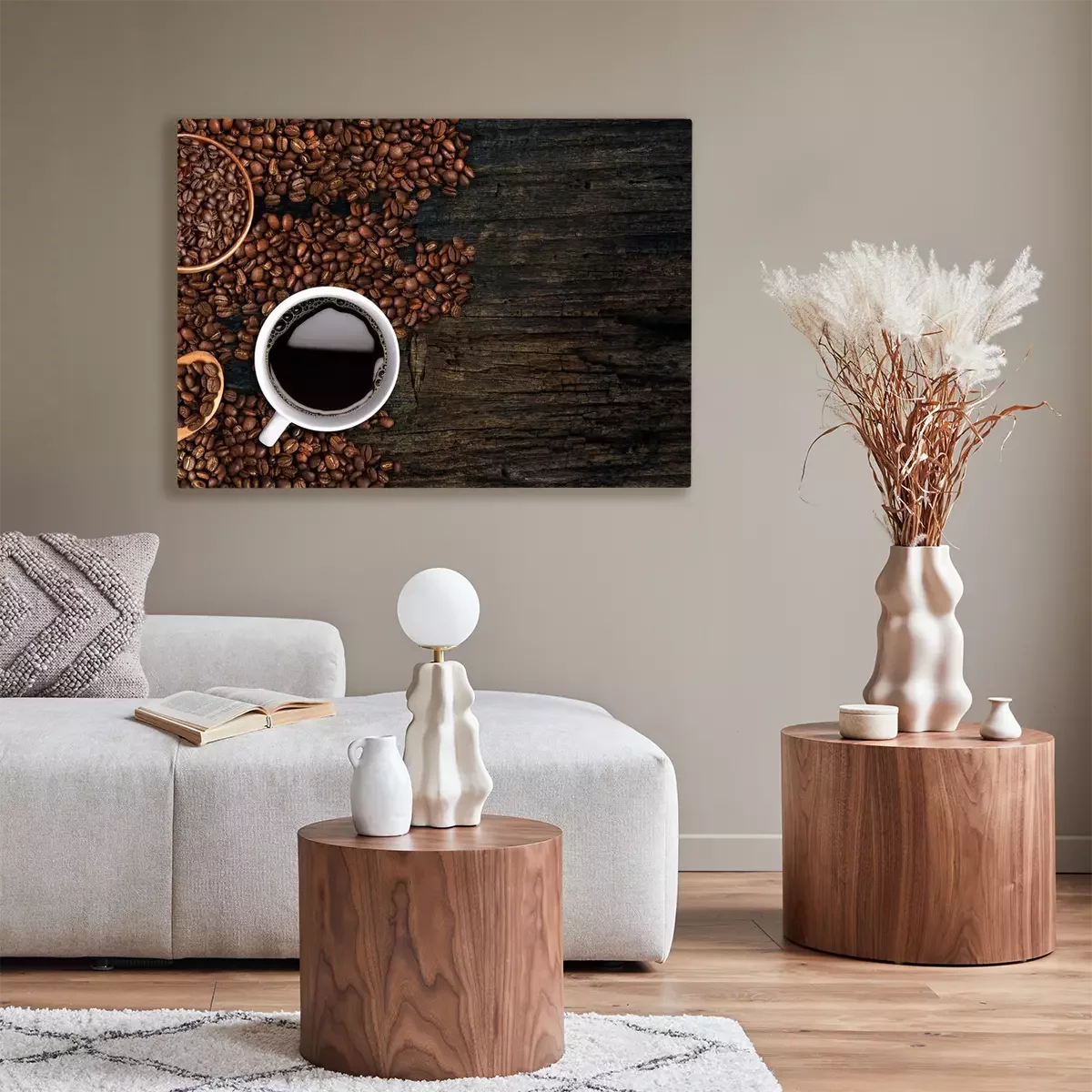 Tableau  Fond de café, vue de dessus avec copie. Tasse de café blanc et café moulu, grains de café sur fond de bois sombre