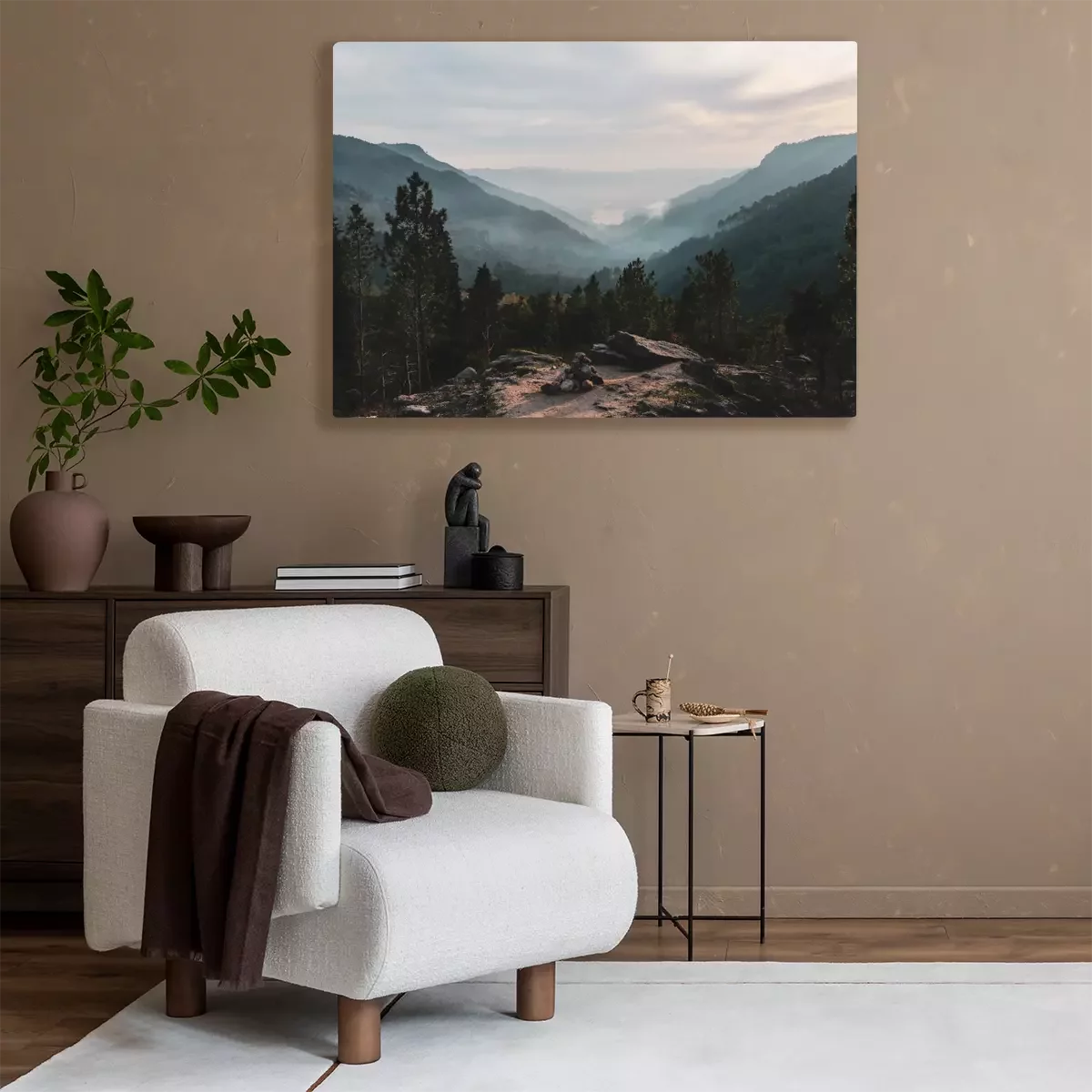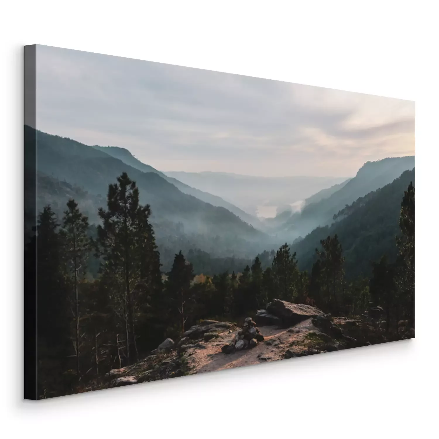Tableau : Forêt dans le brouillard et collines