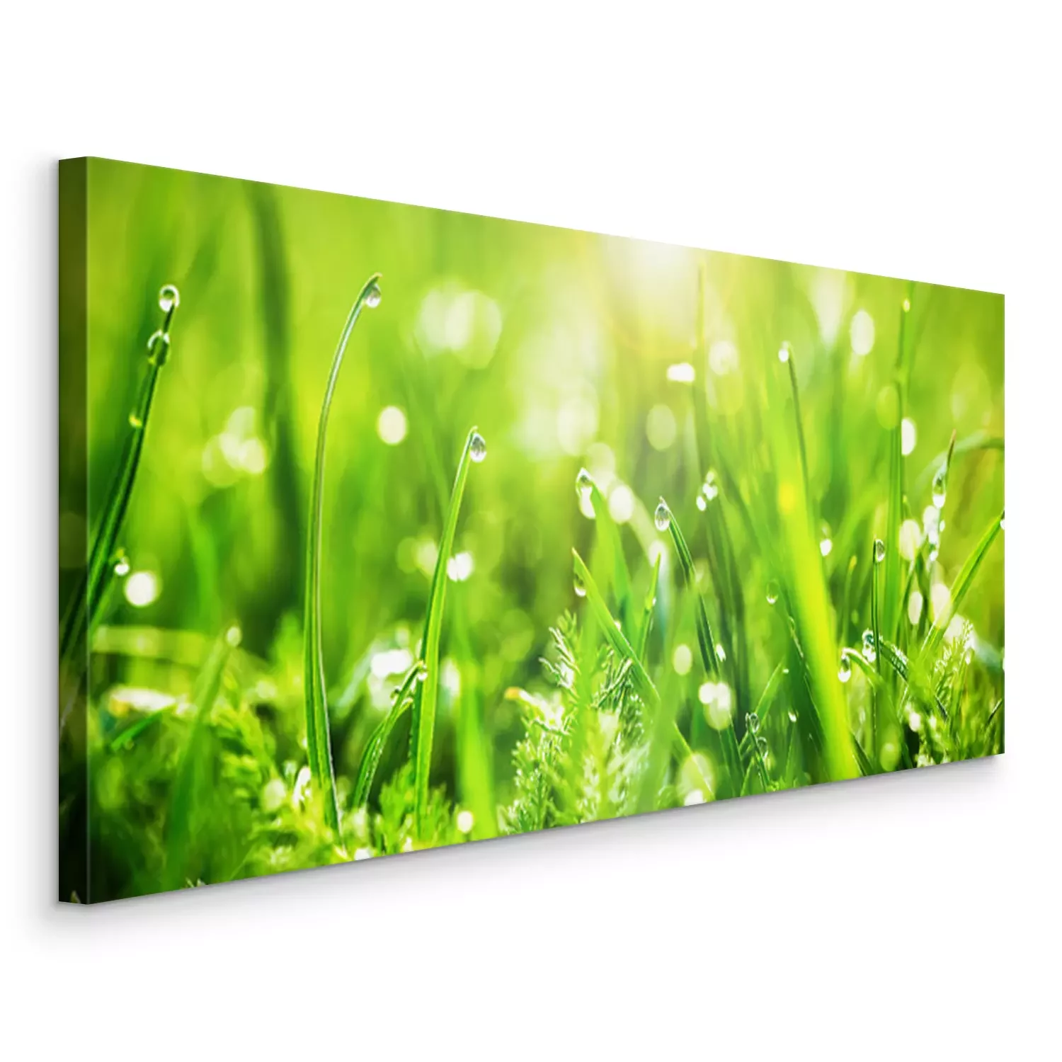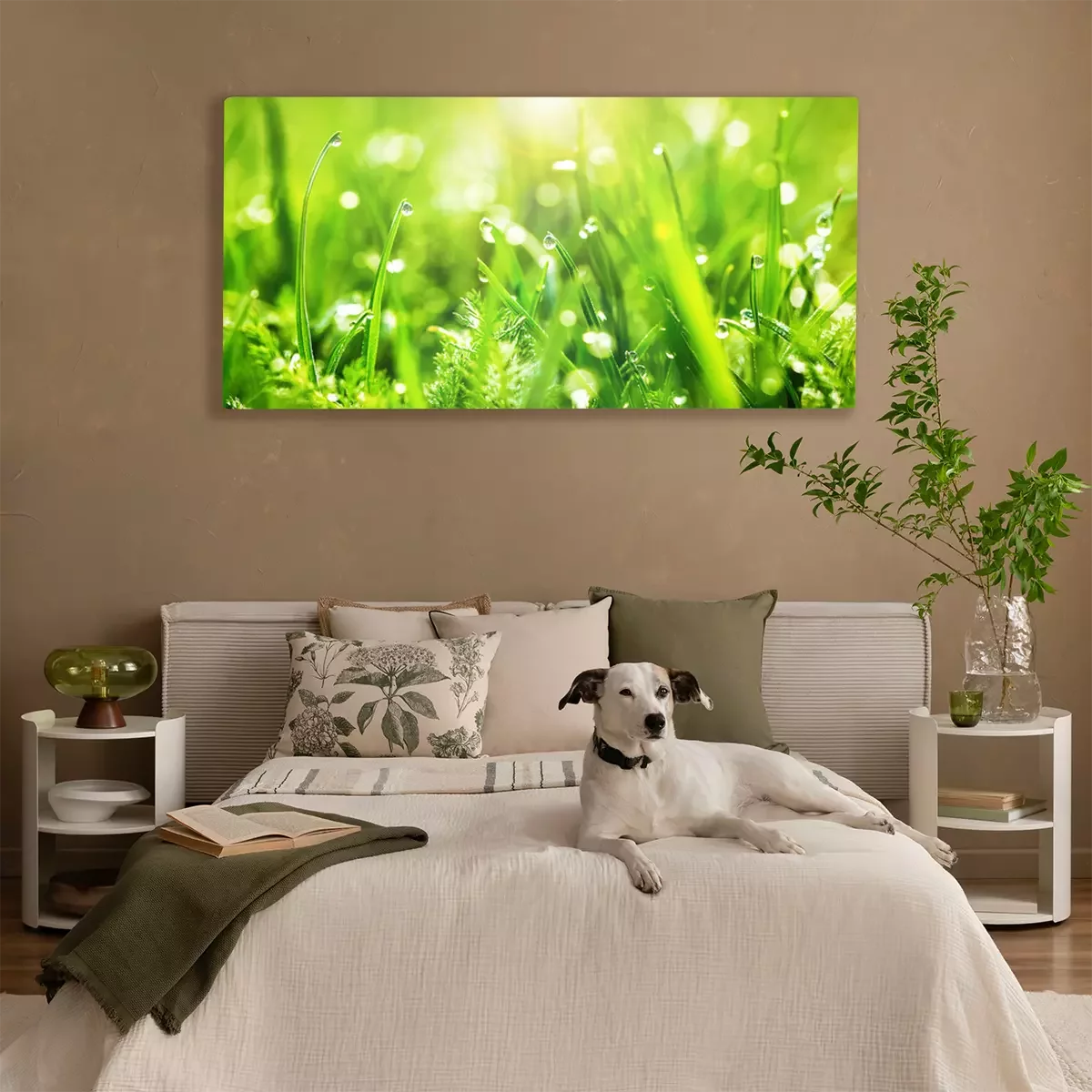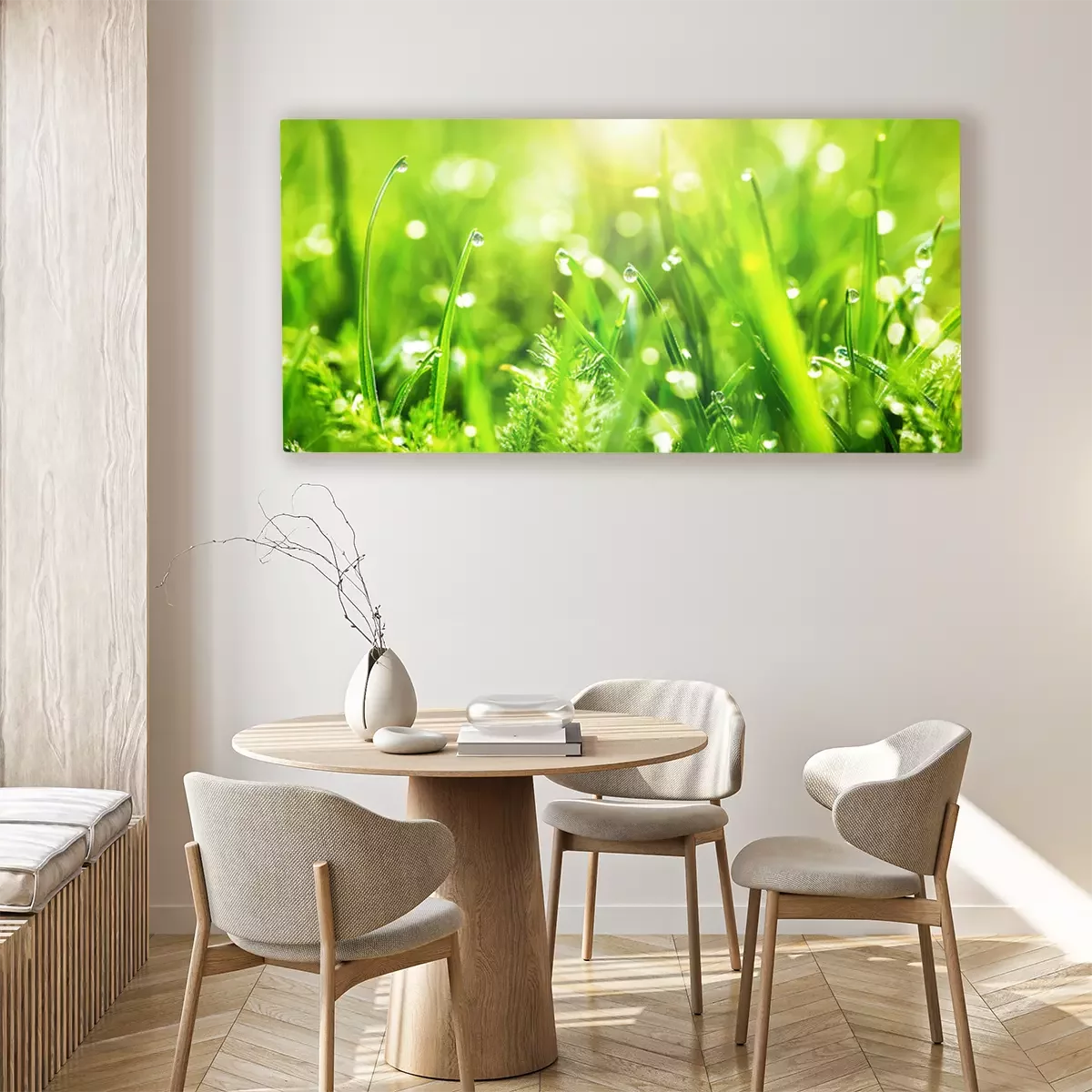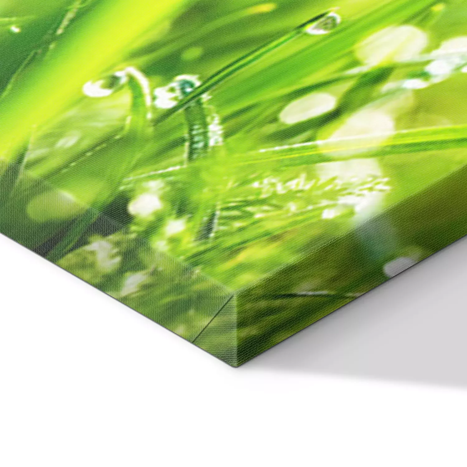 Tableau  Fresh juicy young grass in droplets of morning dew, spring on a nature macro. Drops of water on the grass, natural wallpaper, panoramic view, soft focus.