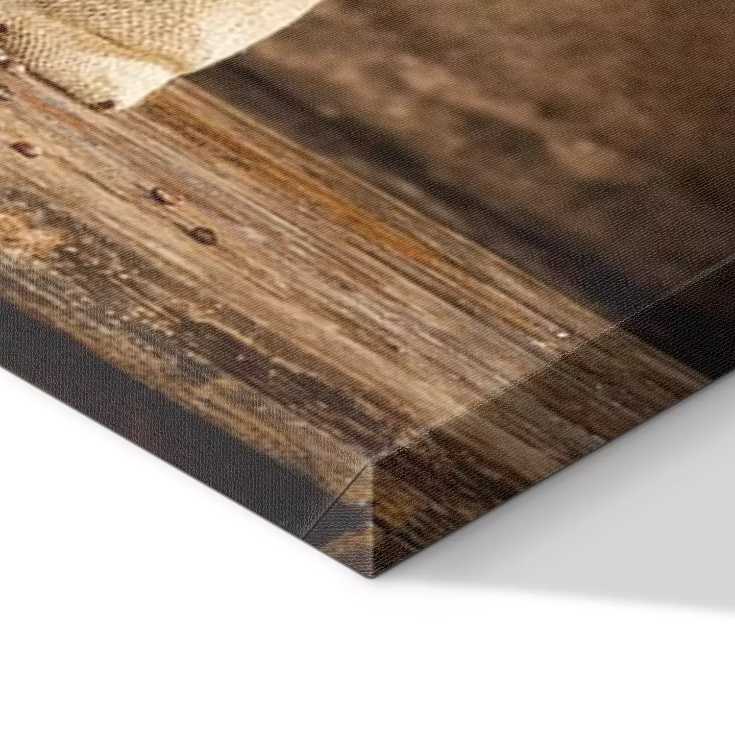 Tableau  Fresh old sack of coffee grains and brown old wall background