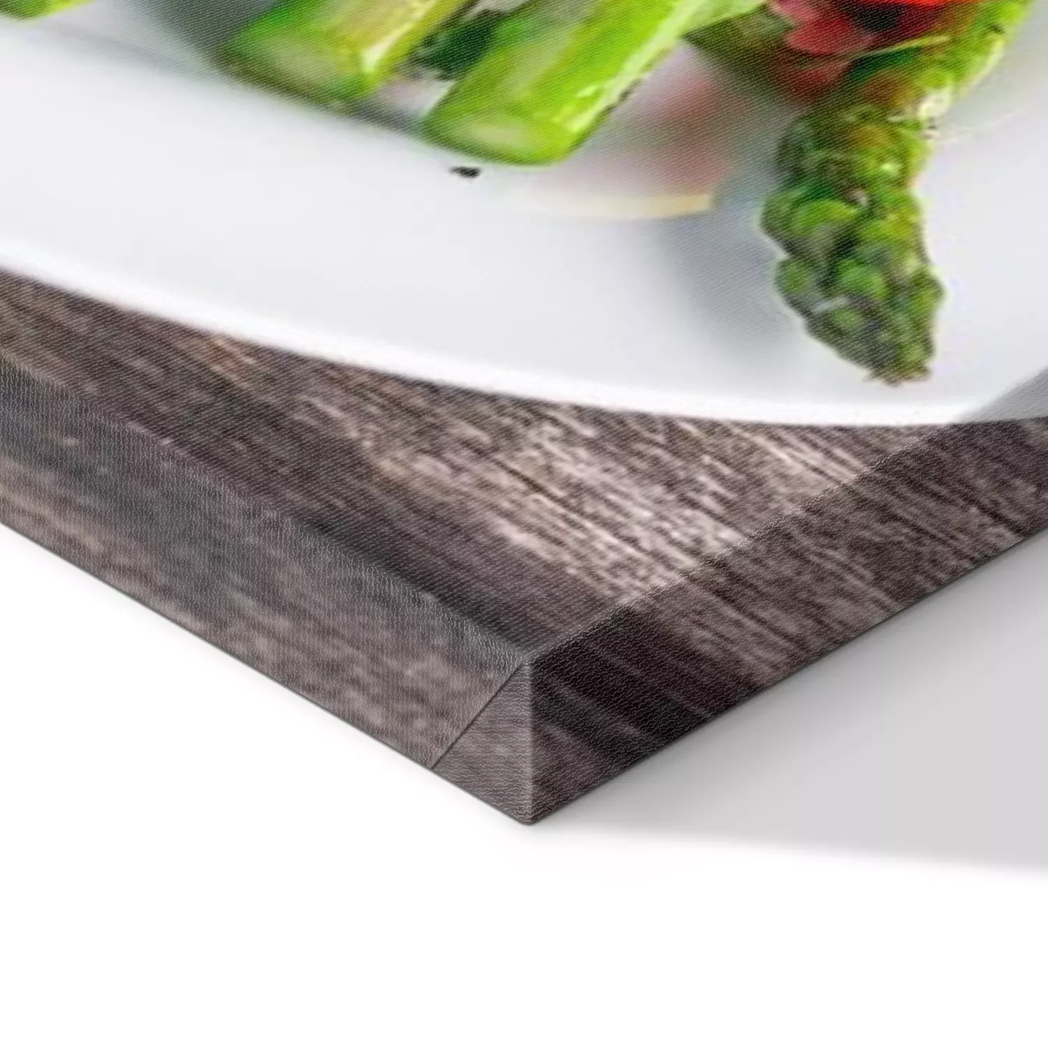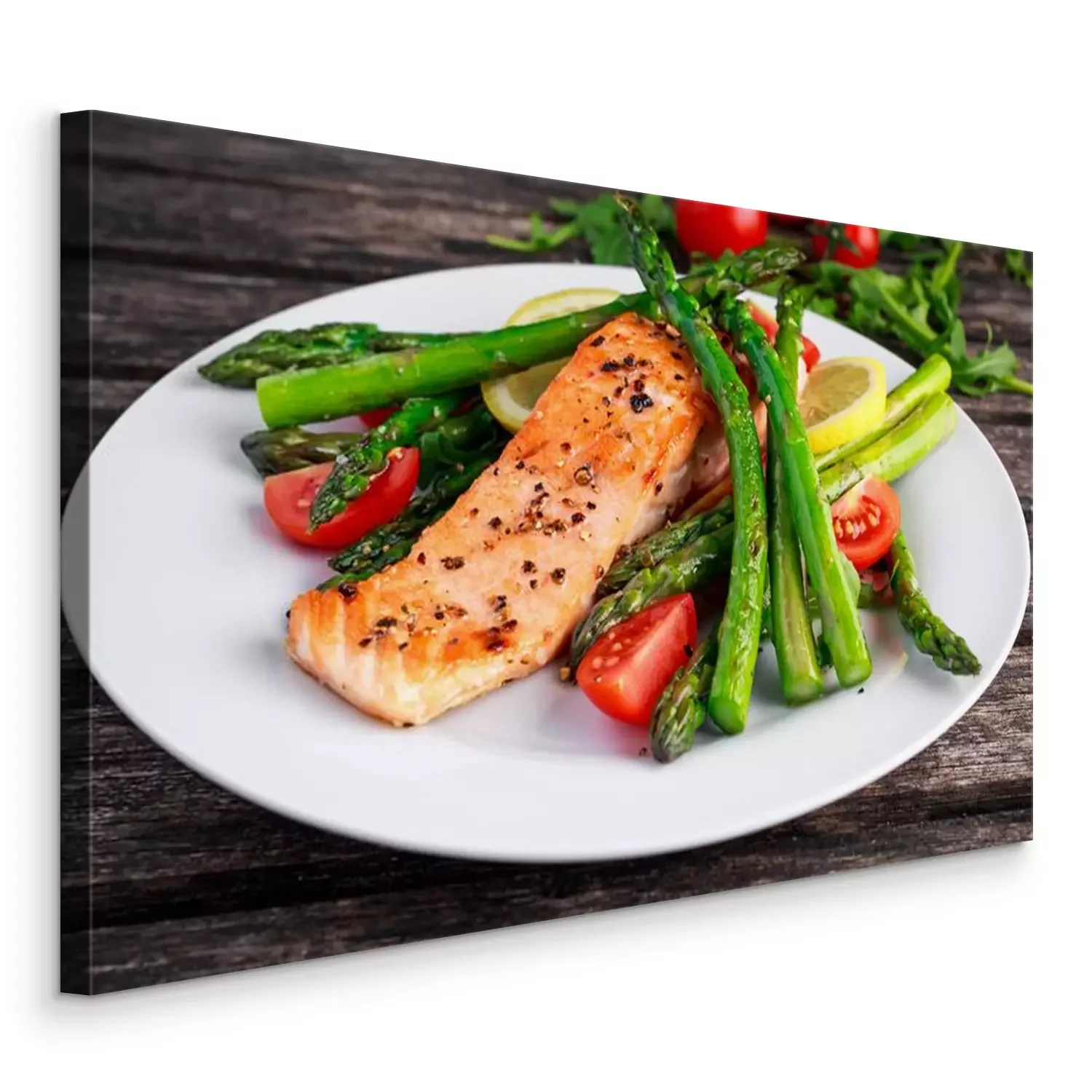 Tableau  Frit, saumon, asperge, tomates, citron, jaune, chaux, blanc, plaque