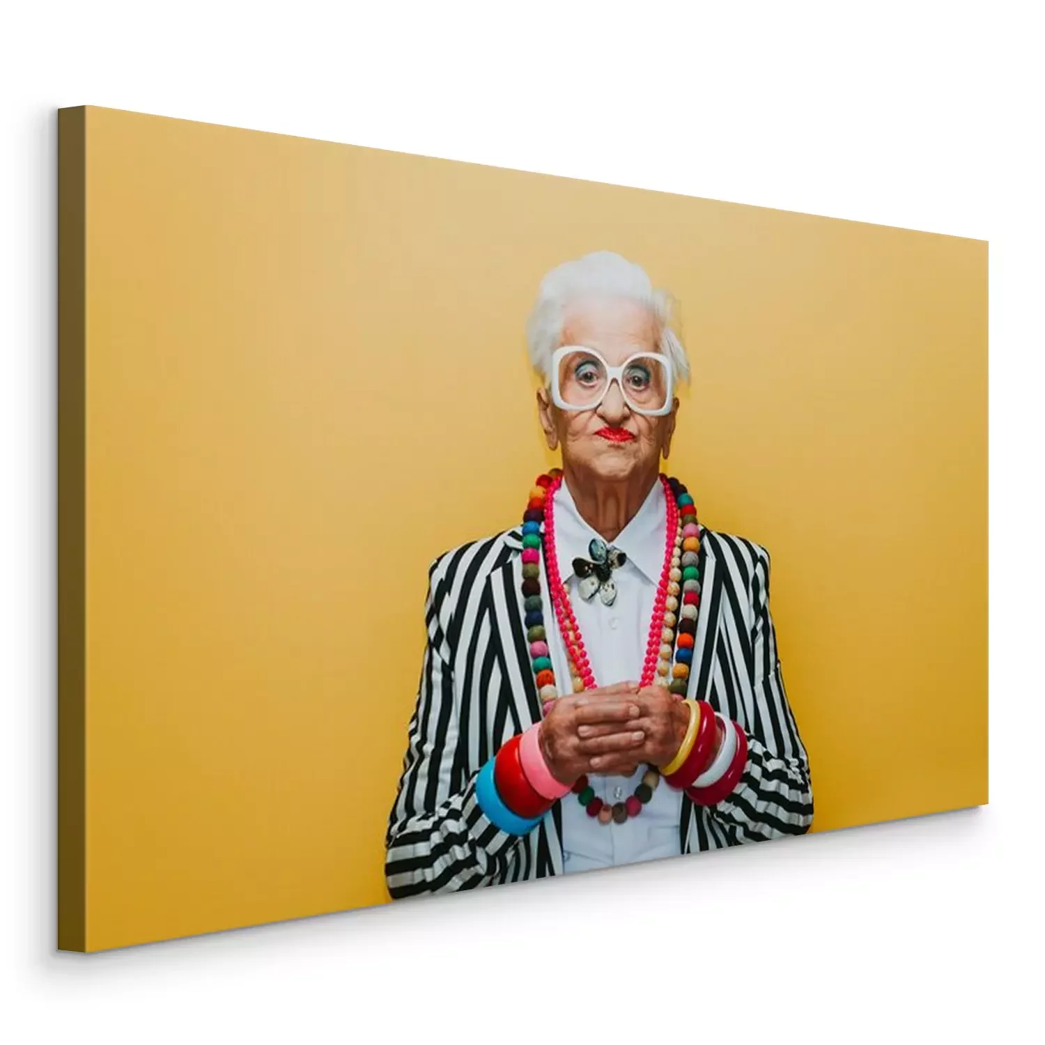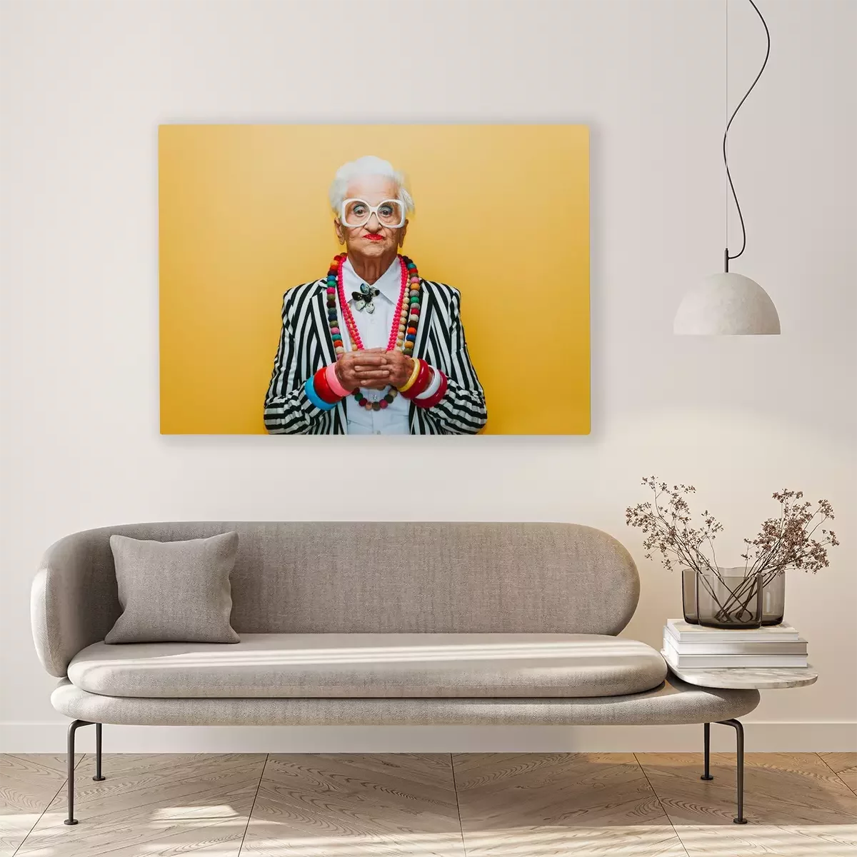 Tableau  Funny grandmother portraits. Senior old woman dressing elegant for a special event. granny fashion model on colored backgrounds