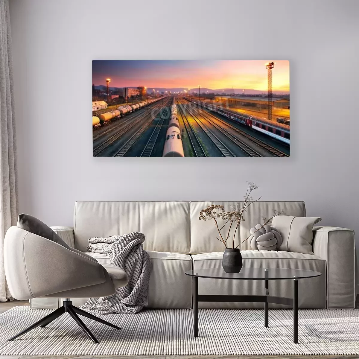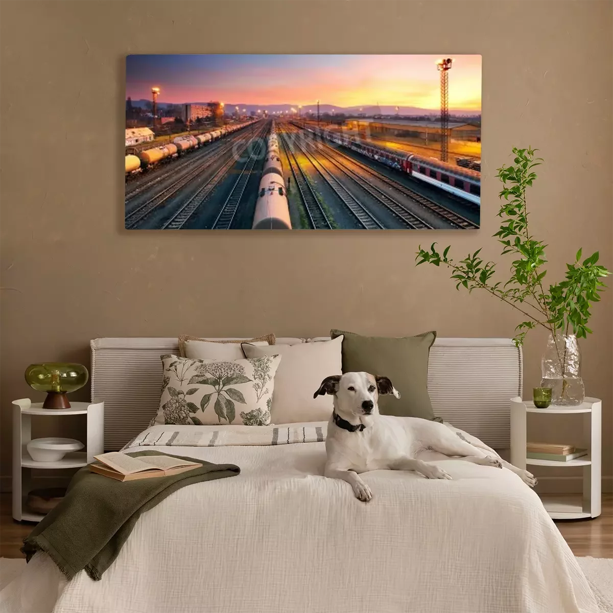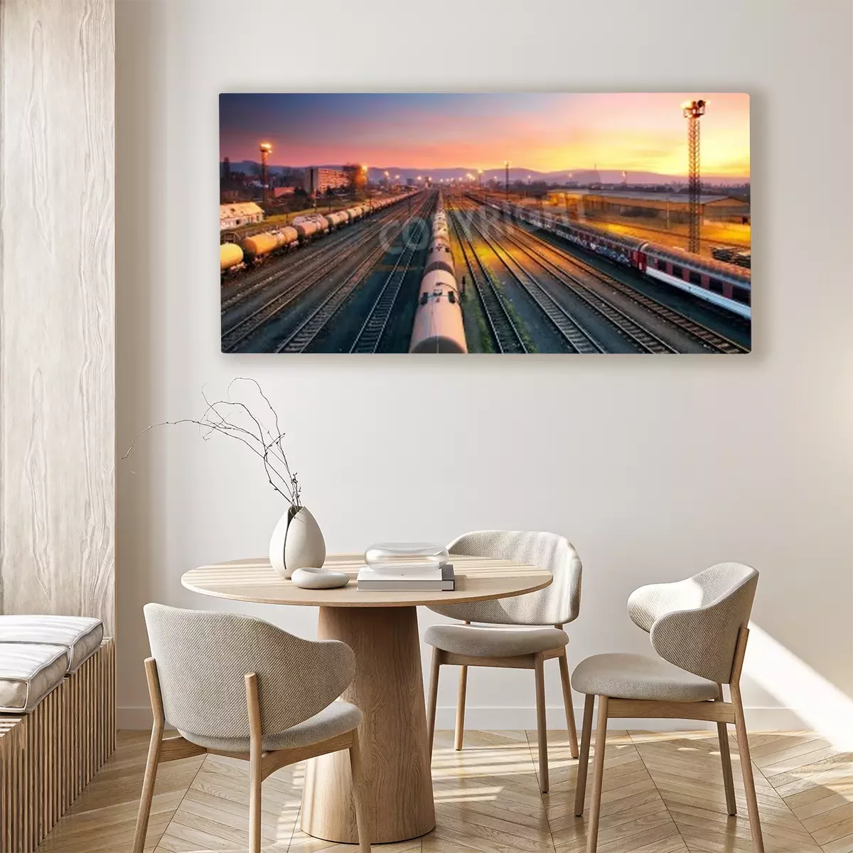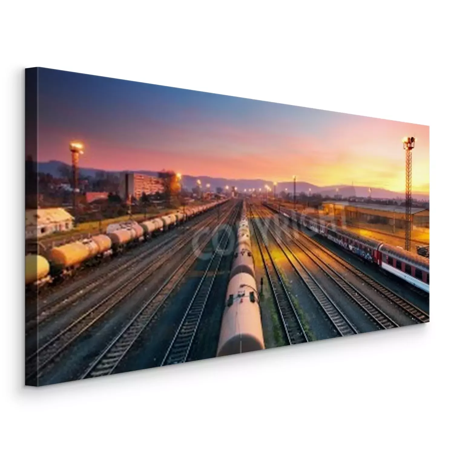 Tableau  Gare de chemin de fer fret freigt au crépuscule