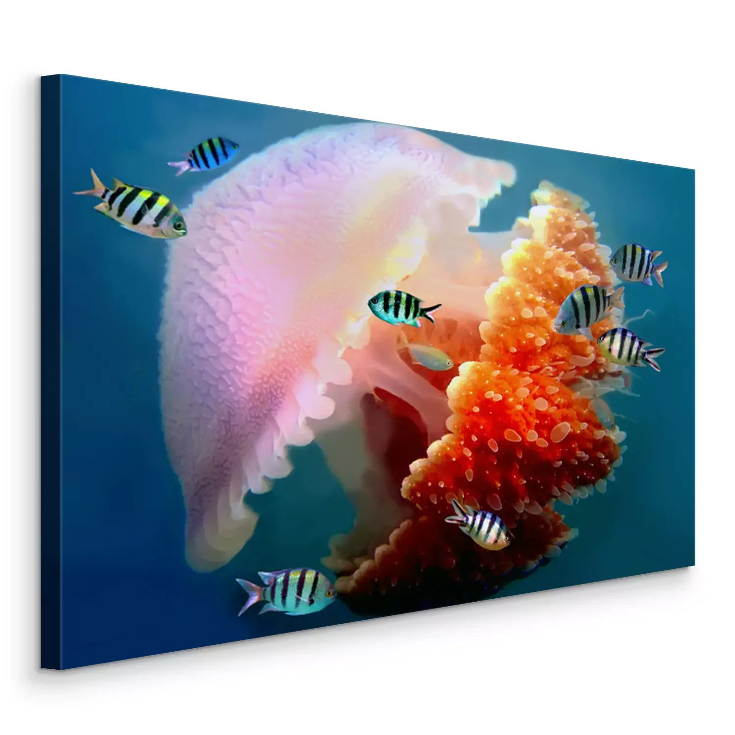 Tableau : géant méduses natation avec des tentacules suivantes sous l'eau