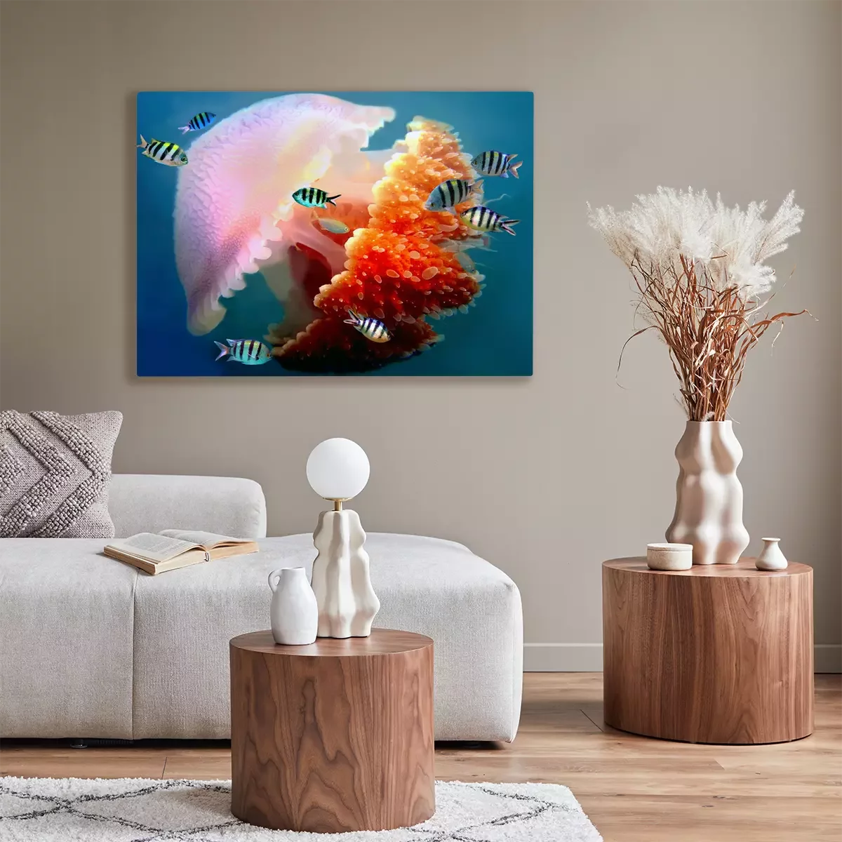 Tableau  géant méduses natation avec des tentacules suivantes sous l'eau