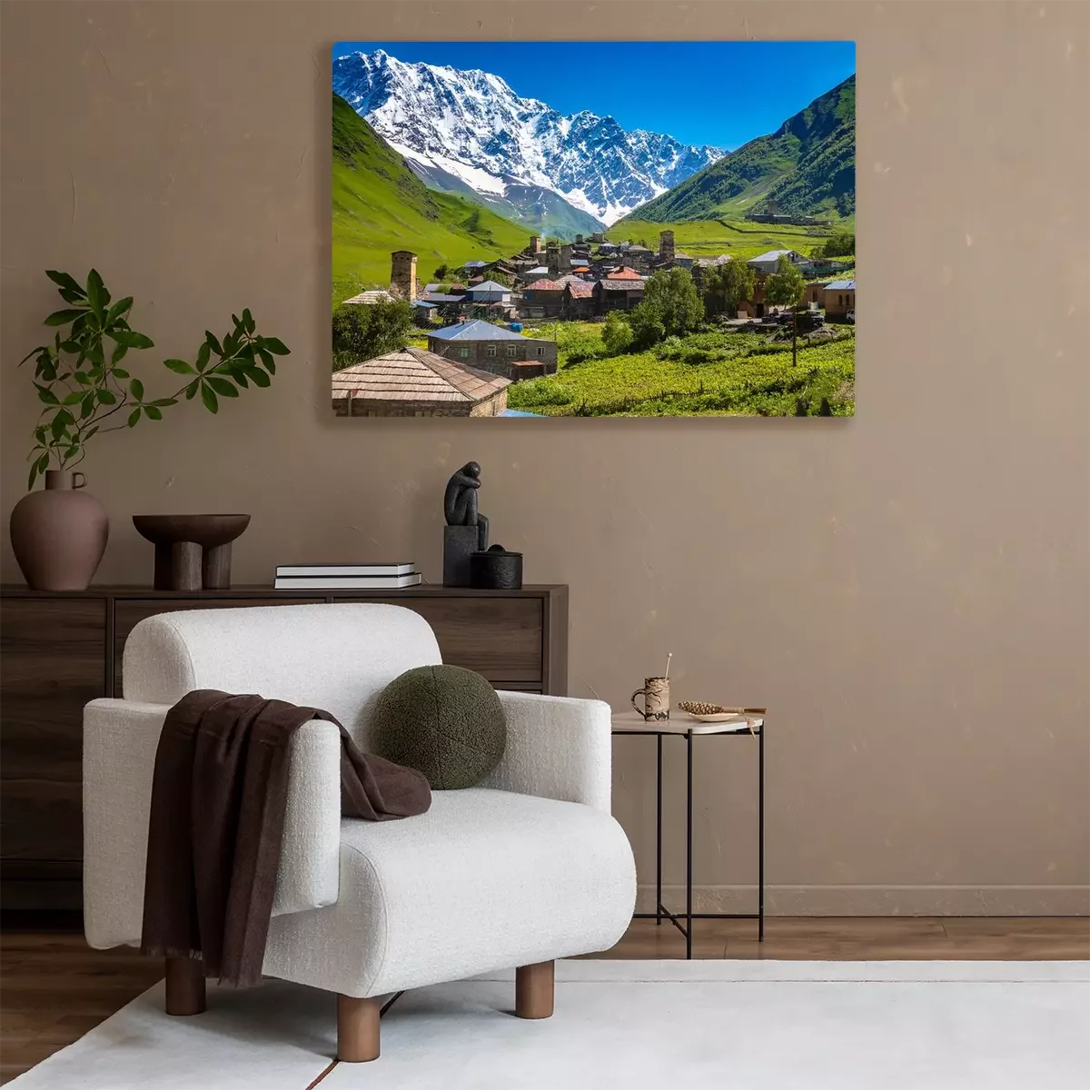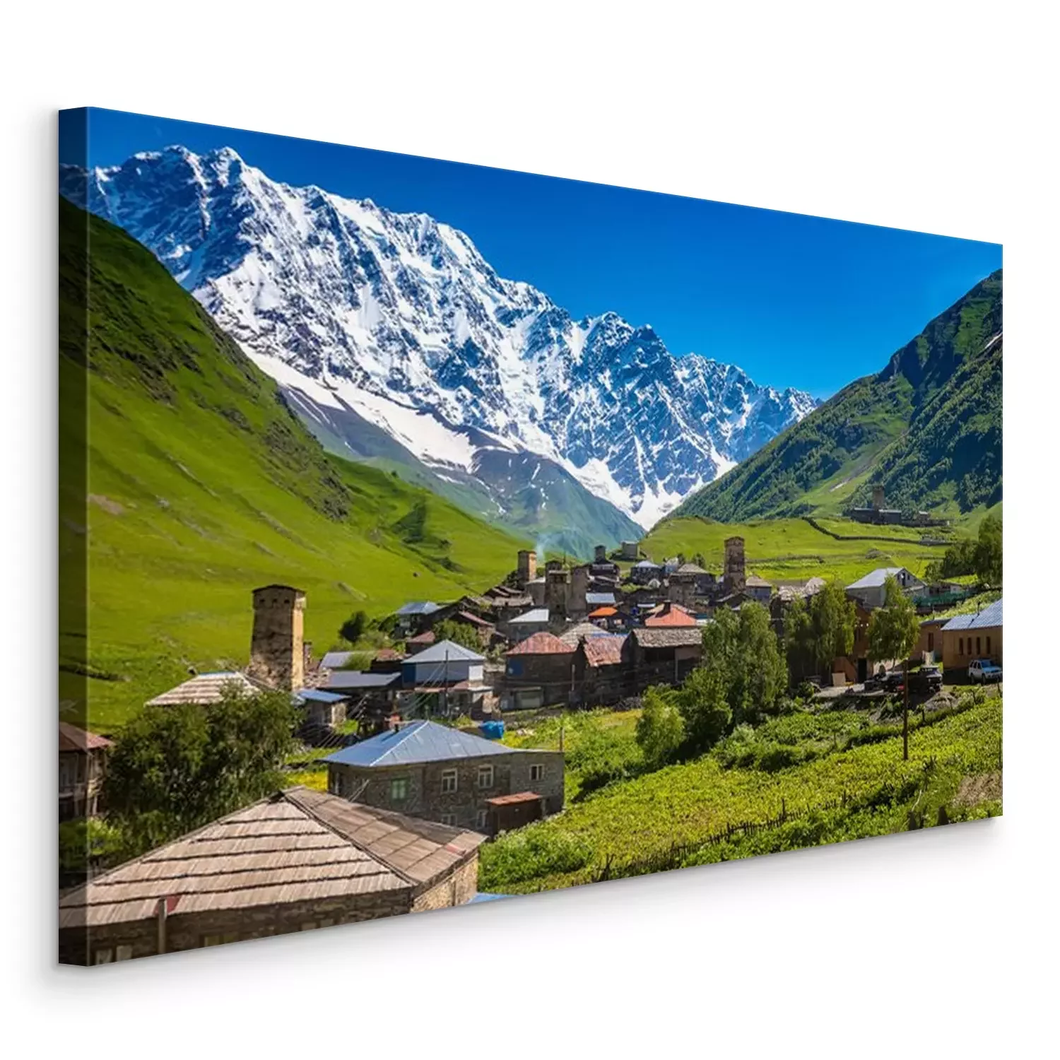 Tableau : Georgian Village Ushguli with stone defense towers in a valley next to the river in Svaneti region near Mestia in Caucasus mountains in Georgia.