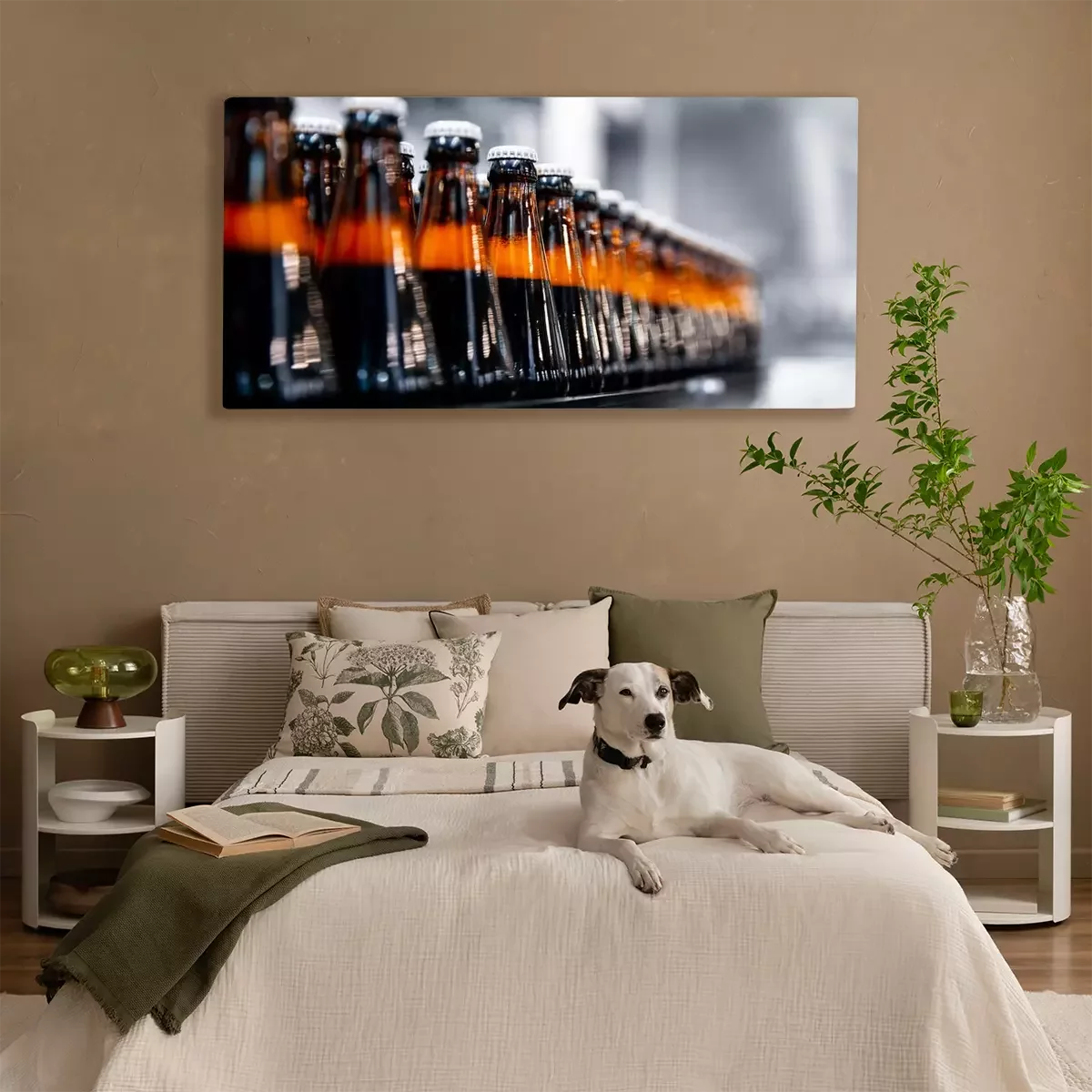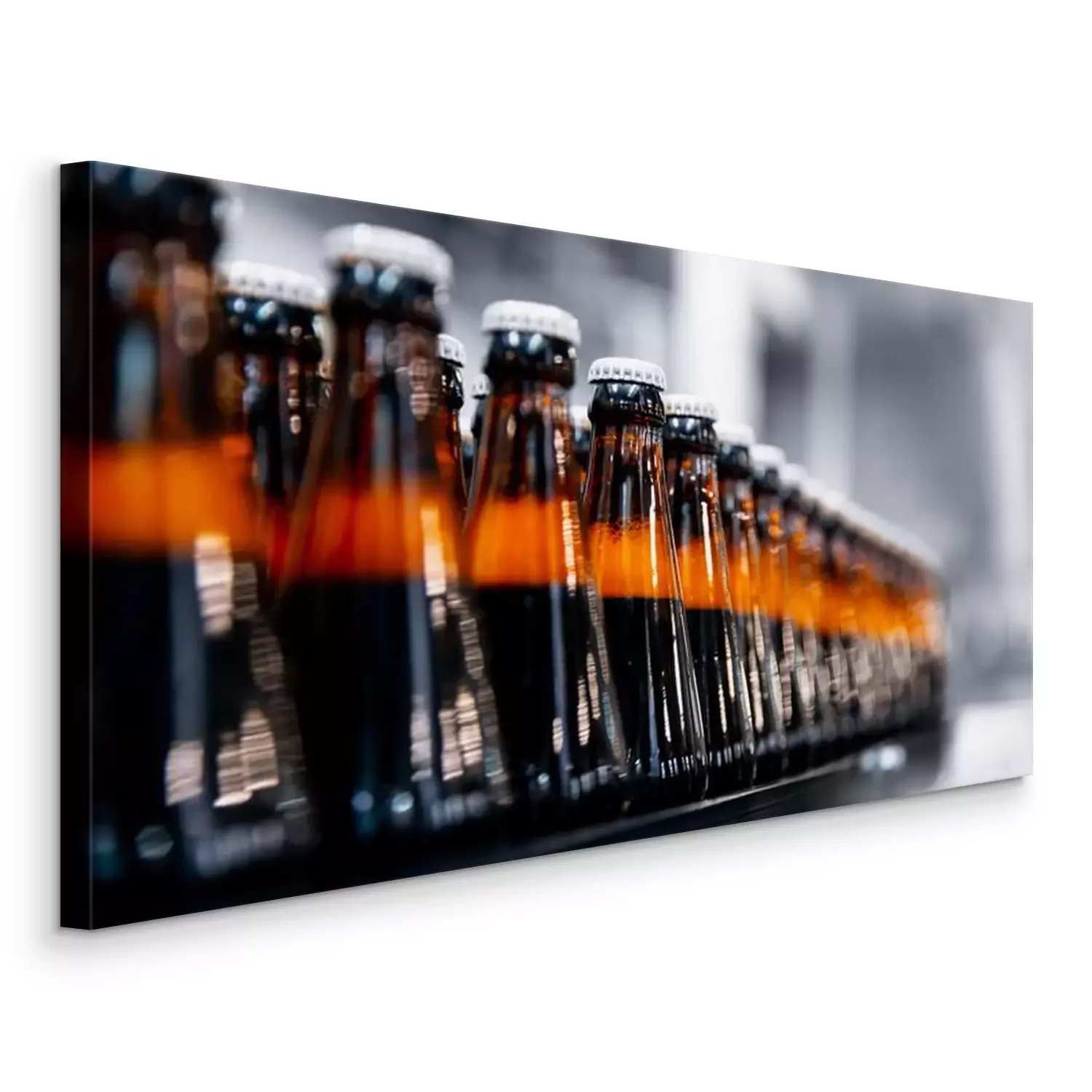 Tableau  Glass bottles of beer on dark background with sun light. Concept brewery plant production line