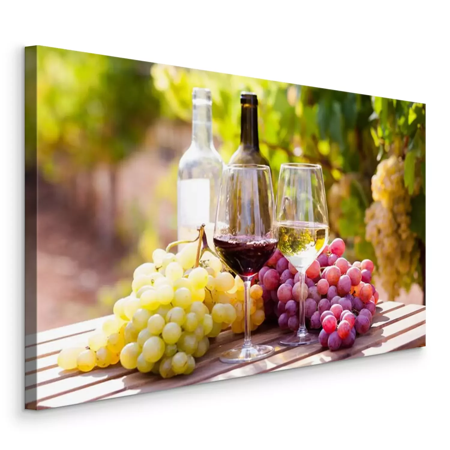 Tableau : glasses of red and white wine and ripe grapes on table in vineyard