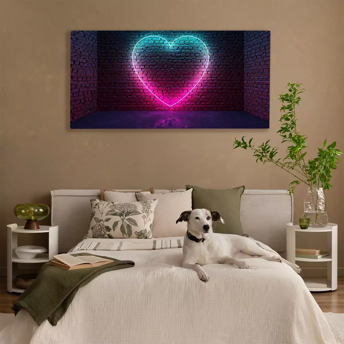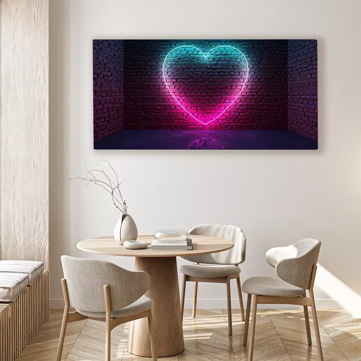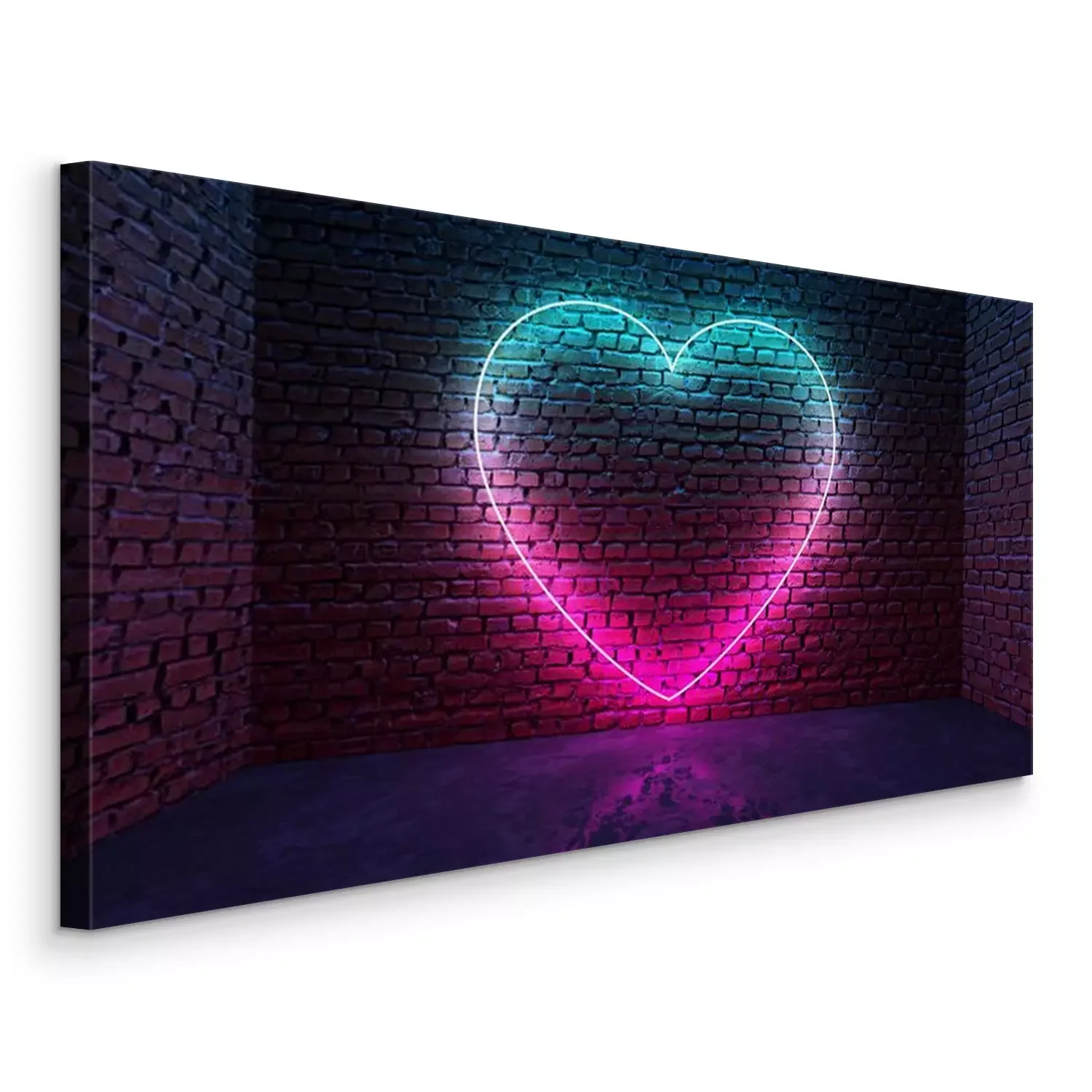 Tableau : Glowing neon heart shaped like icon on brick wall in dark room