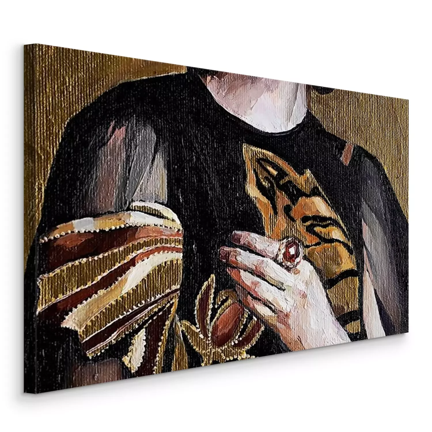 Tableau : Golden elegance. Gentle female hand on the dark background of black clothes with gold ornament. The work fragment made in oil technique.