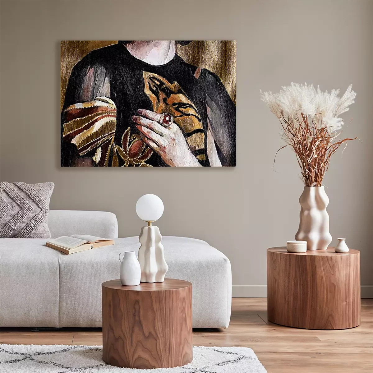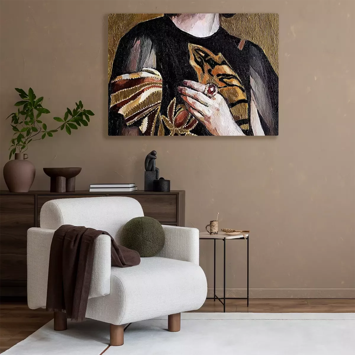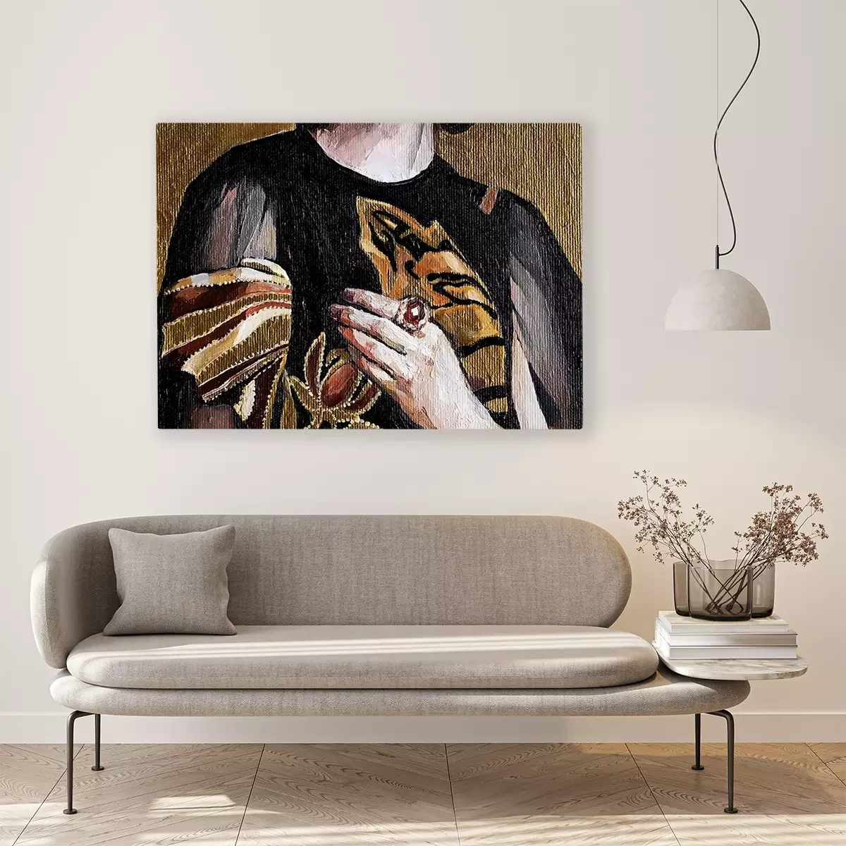 Tableau  Golden elegance. Gentle female hand on the dark background of black clothes with gold ornament. The work fragment made in oil technique.