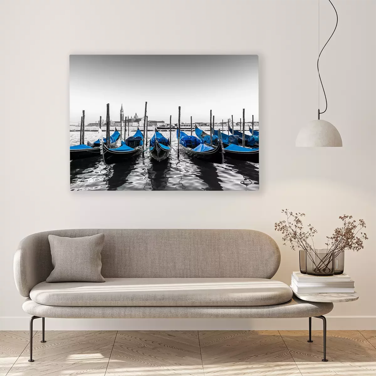Tableau : Gondoles bleues amarrées sur pilotis
