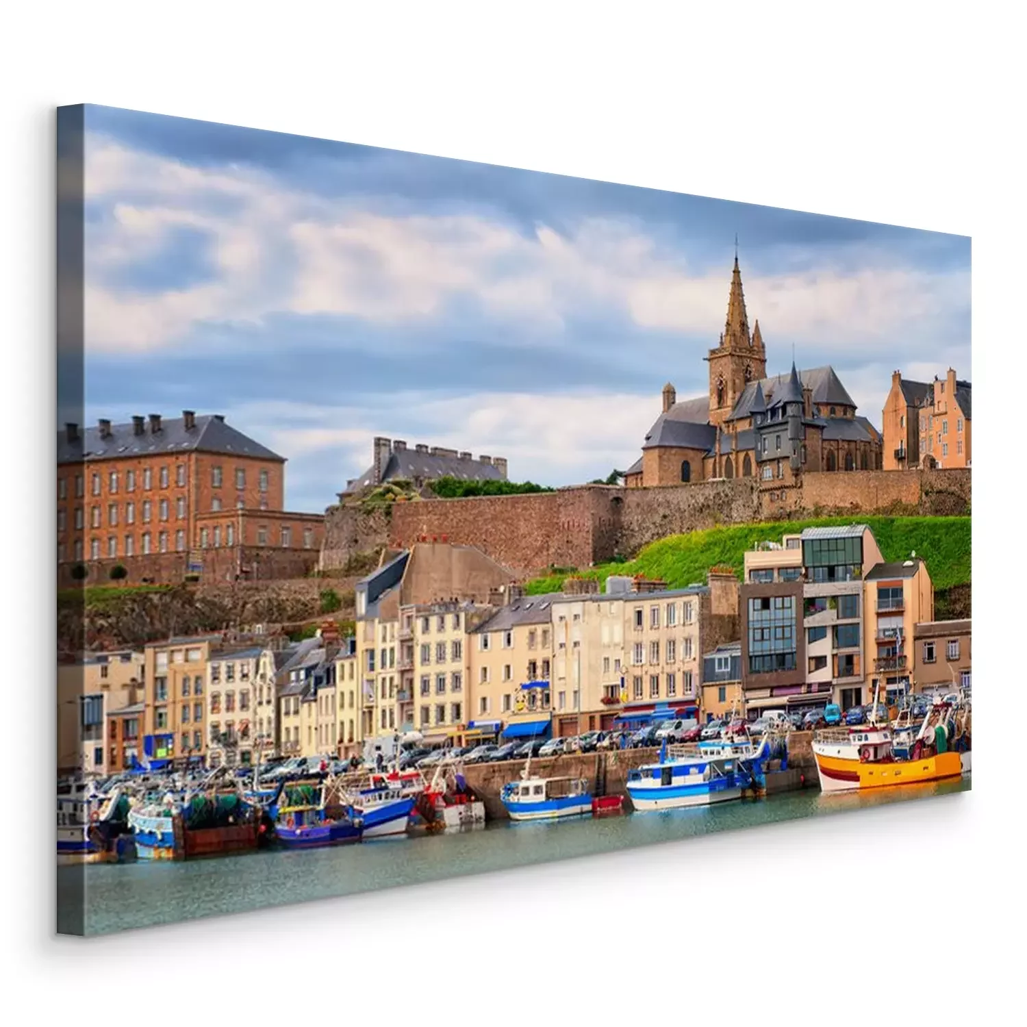 Tableau : Gothique, église, colline, pêcheurs, bateaux, port, ville, Granv
