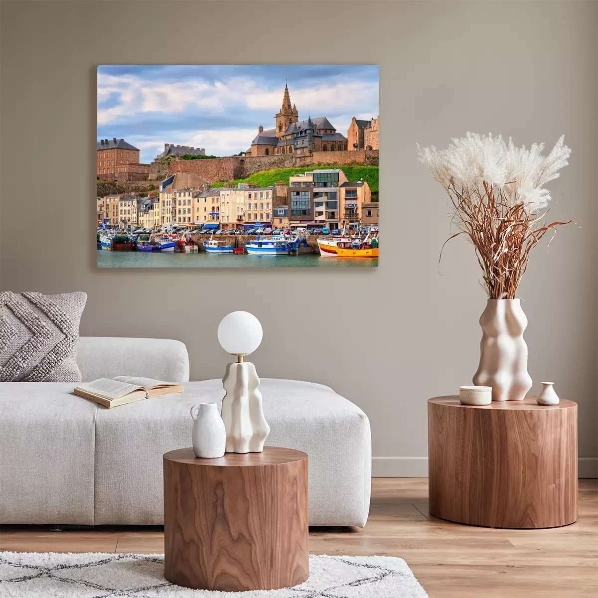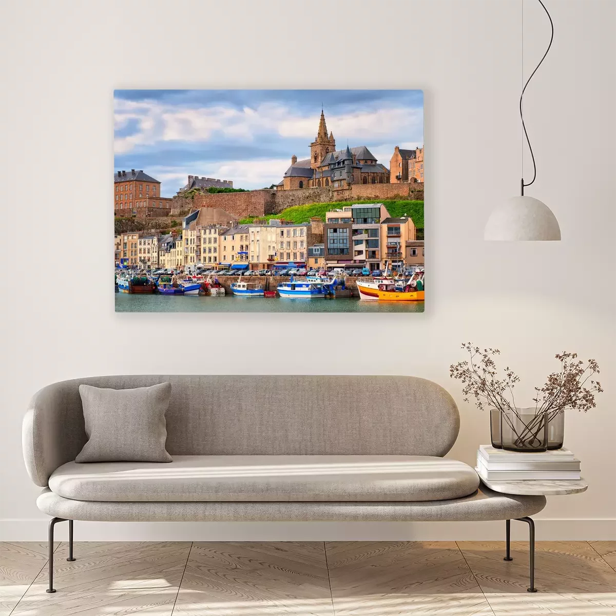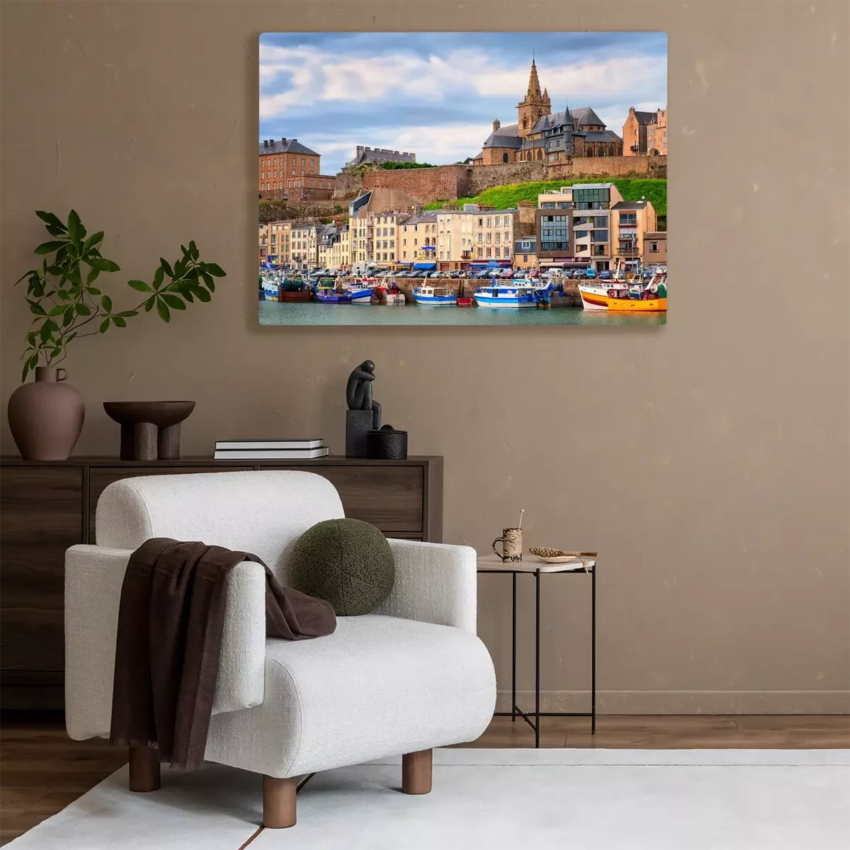 Tableau  Gothique, église, colline, pêcheurs, bateaux, port, ville, Granv