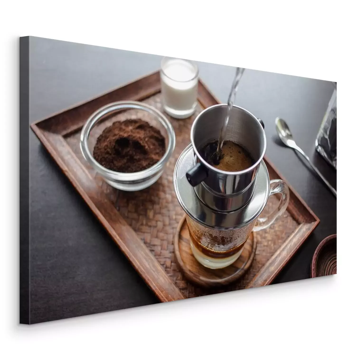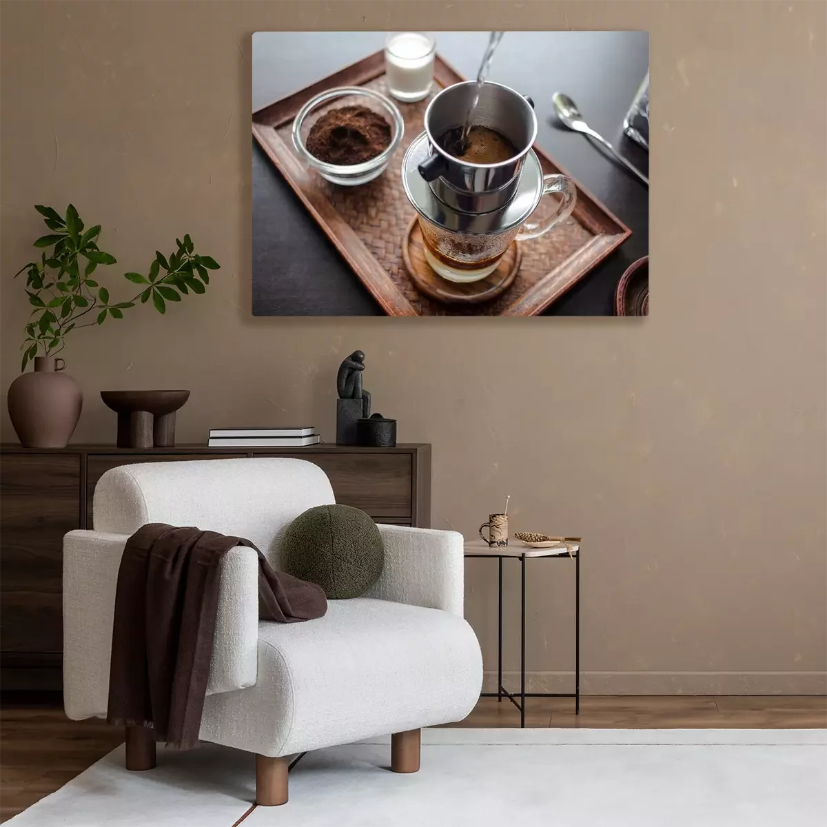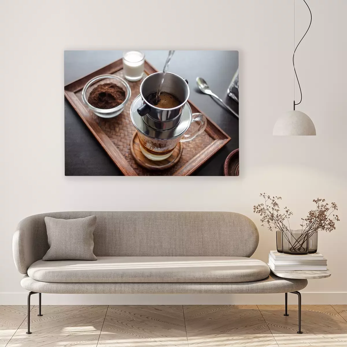 Tableau  Goutte à goutte, brassage, verser de l'eau sur du café moulu contenu dans le filtre Phin vietnamien sur planche de bois sombre. Mise au point sélective