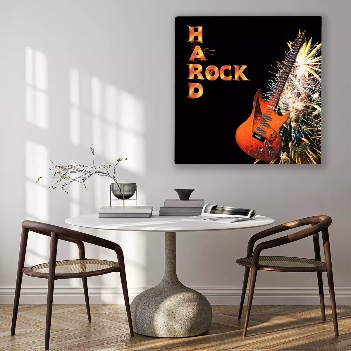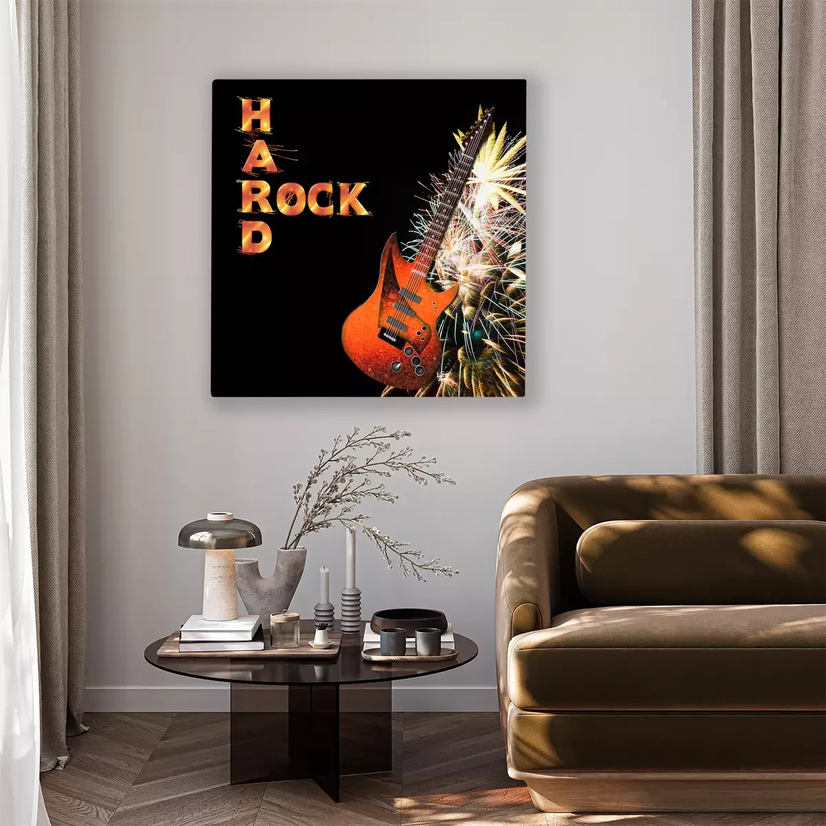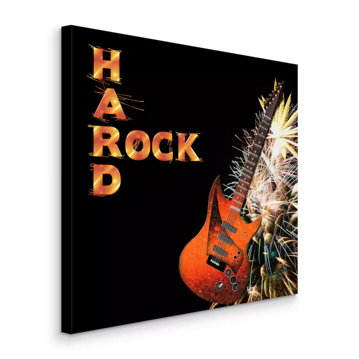 Tableau : Graphic background of Electric Guitar and fireorks isolated on black, Hard Rock.