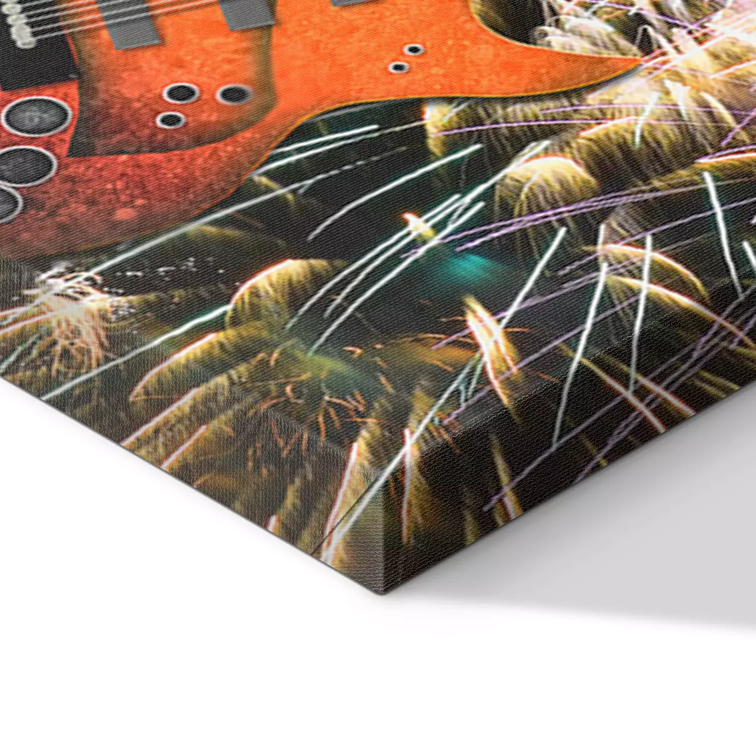 Tableau  Graphic background of Electric Guitar and fireorks isolated on black, Hard Rock.