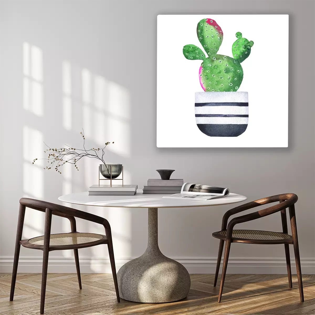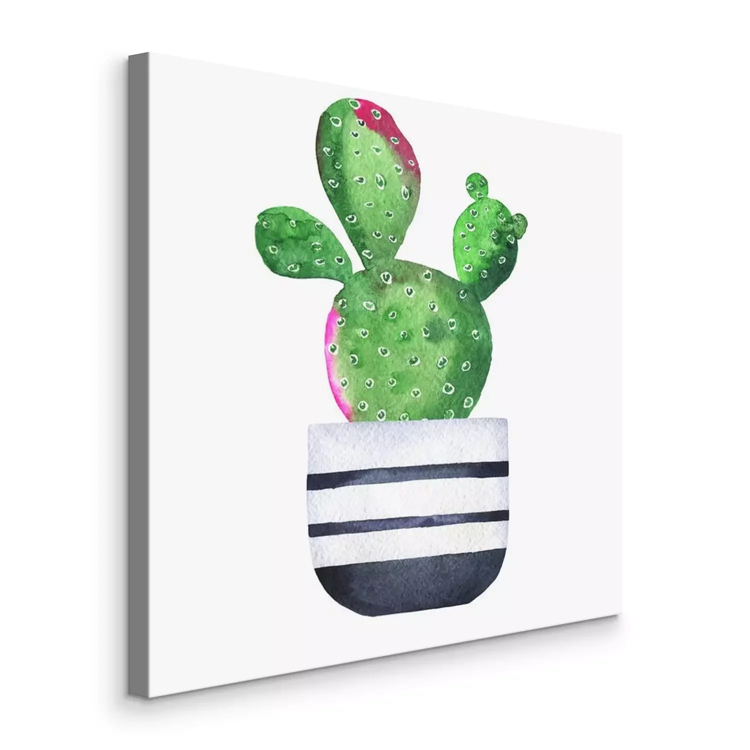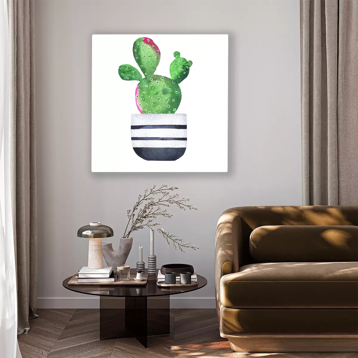 Tableau : Green and pink cactus in a flowerpot isolated on white background. Hand drawn watercolor illustration.