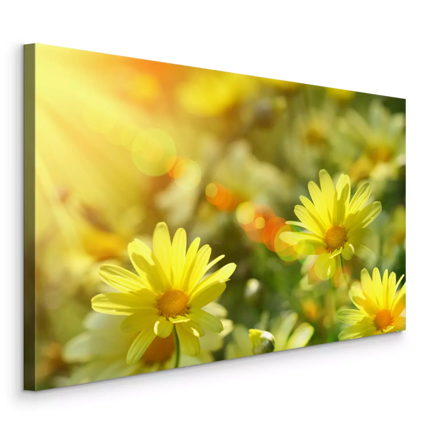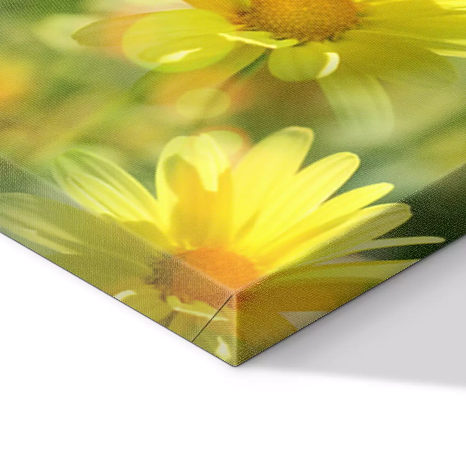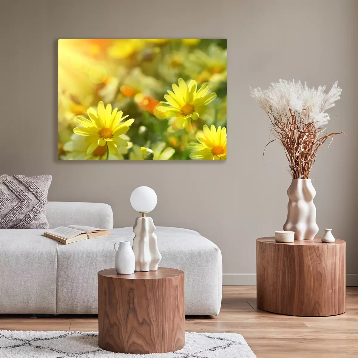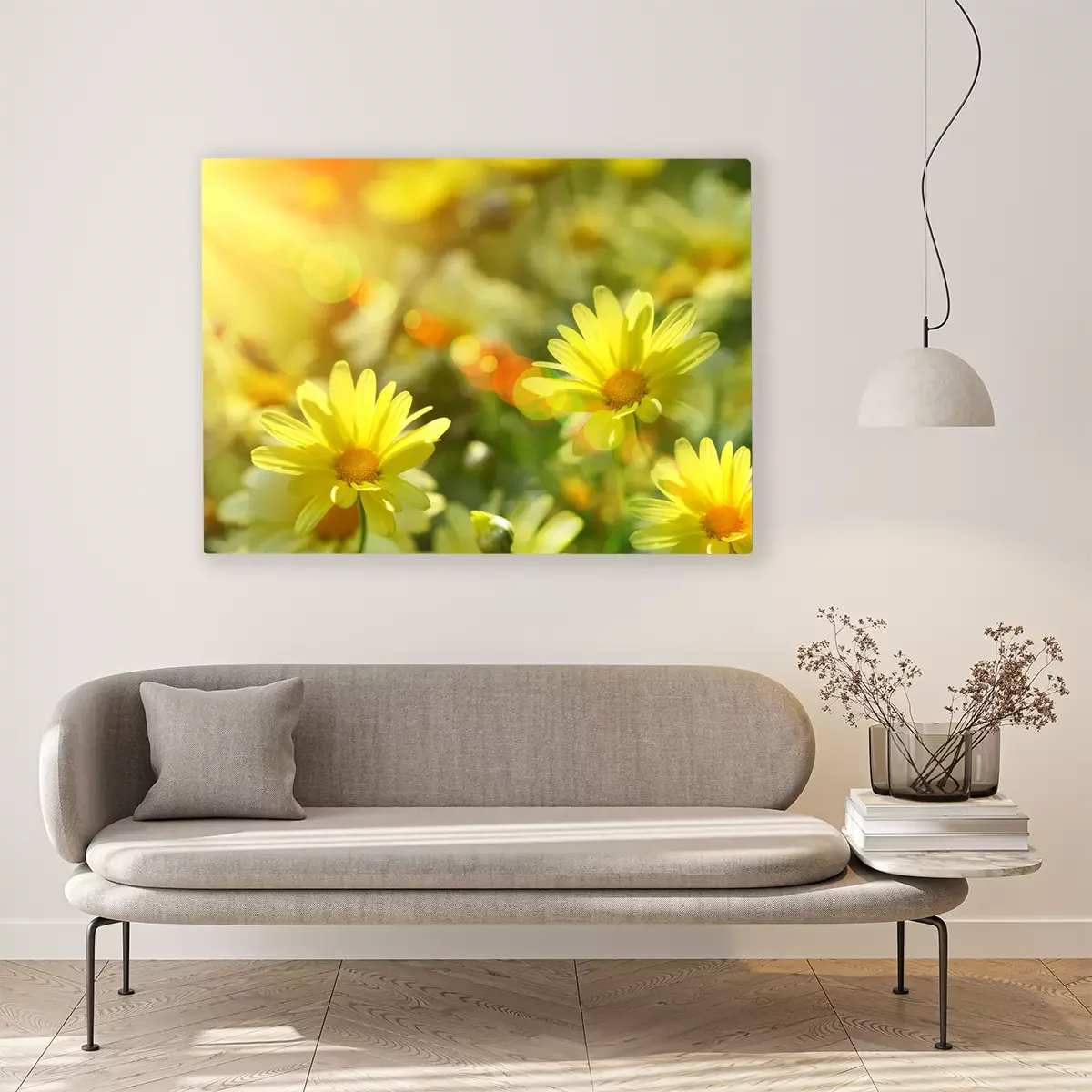 Tableau : Gros plan de marguerites jaunes avec des rayons chauds
