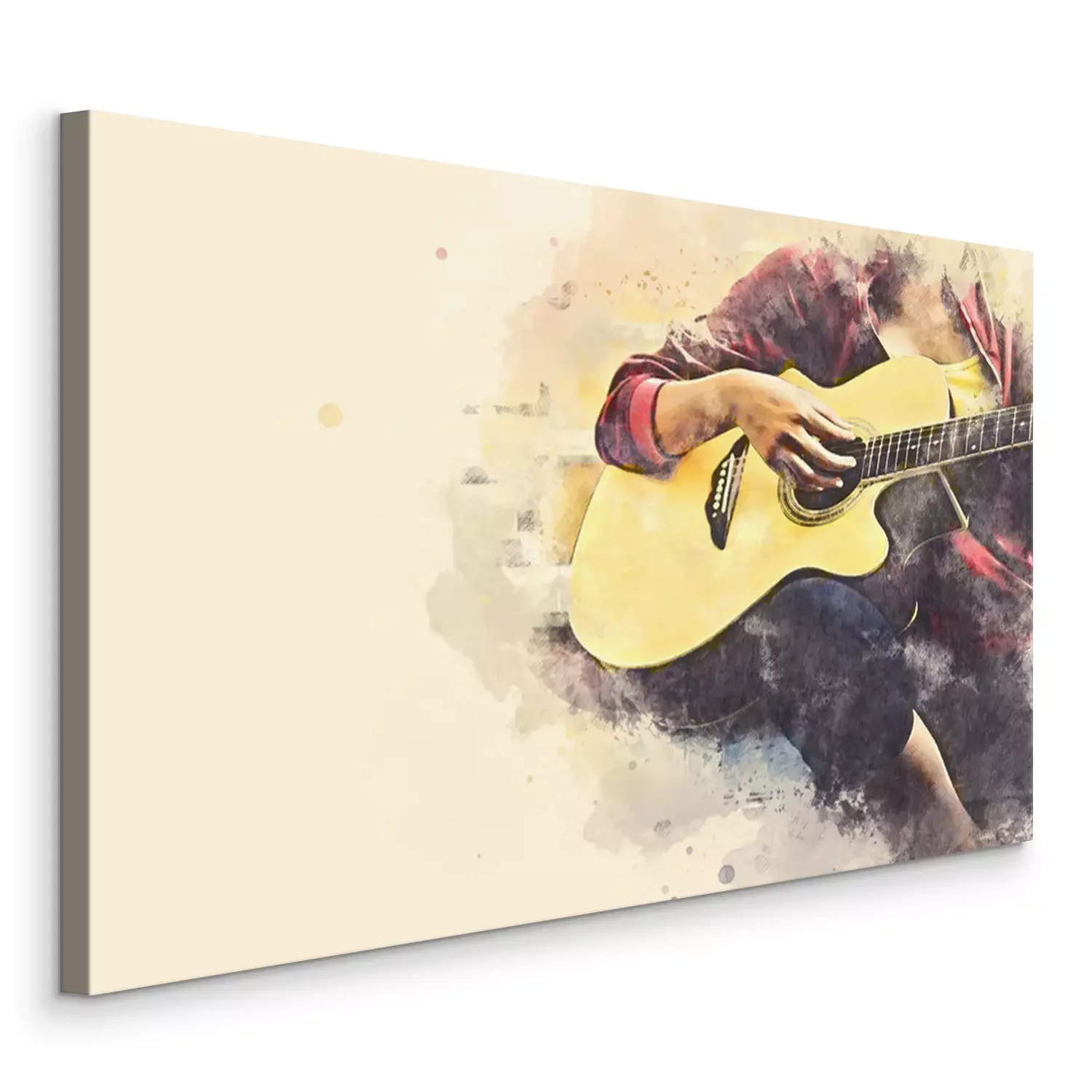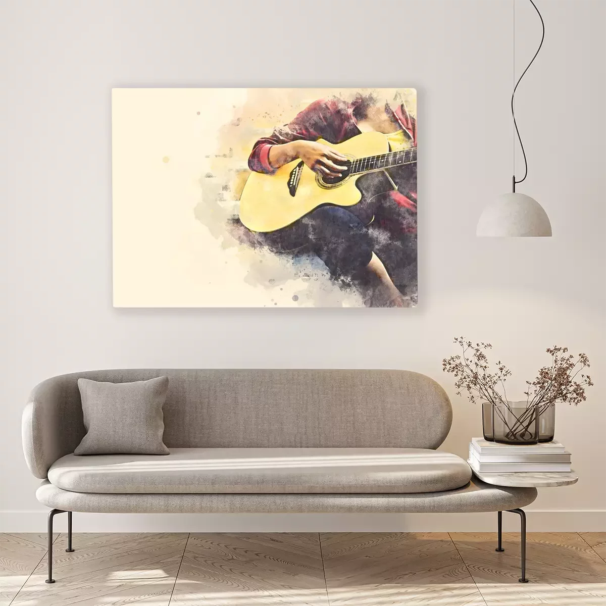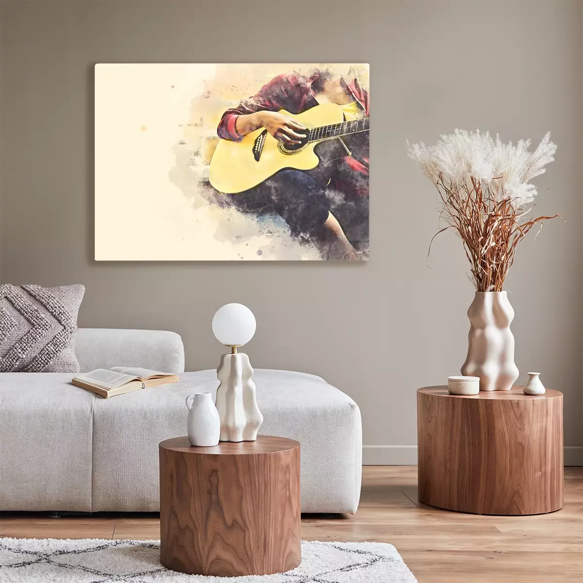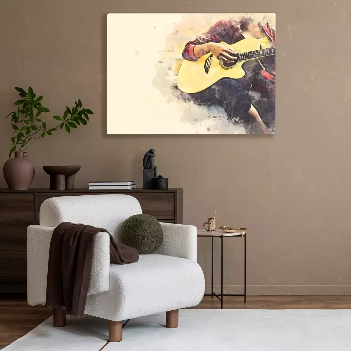 Tableau  Gros plan femmes jouant de la guitare acoustique sur rue piétonne sur fond de peinture illustration aquarelle.