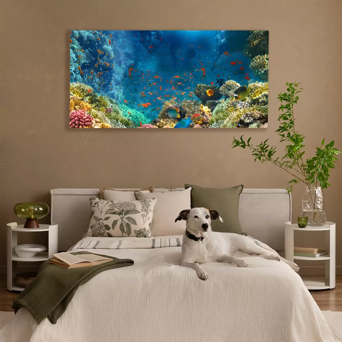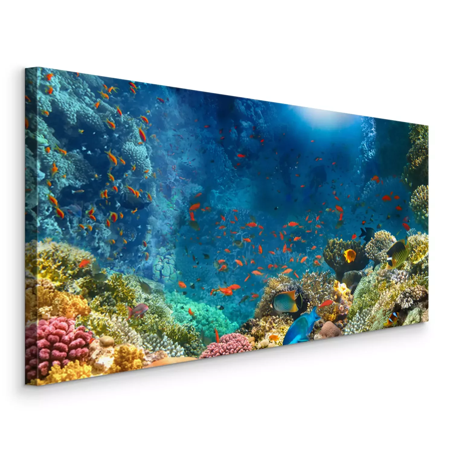 Tableau : Group of scuba divers exploring coral reef. Underwater sports and tropical vacation concept